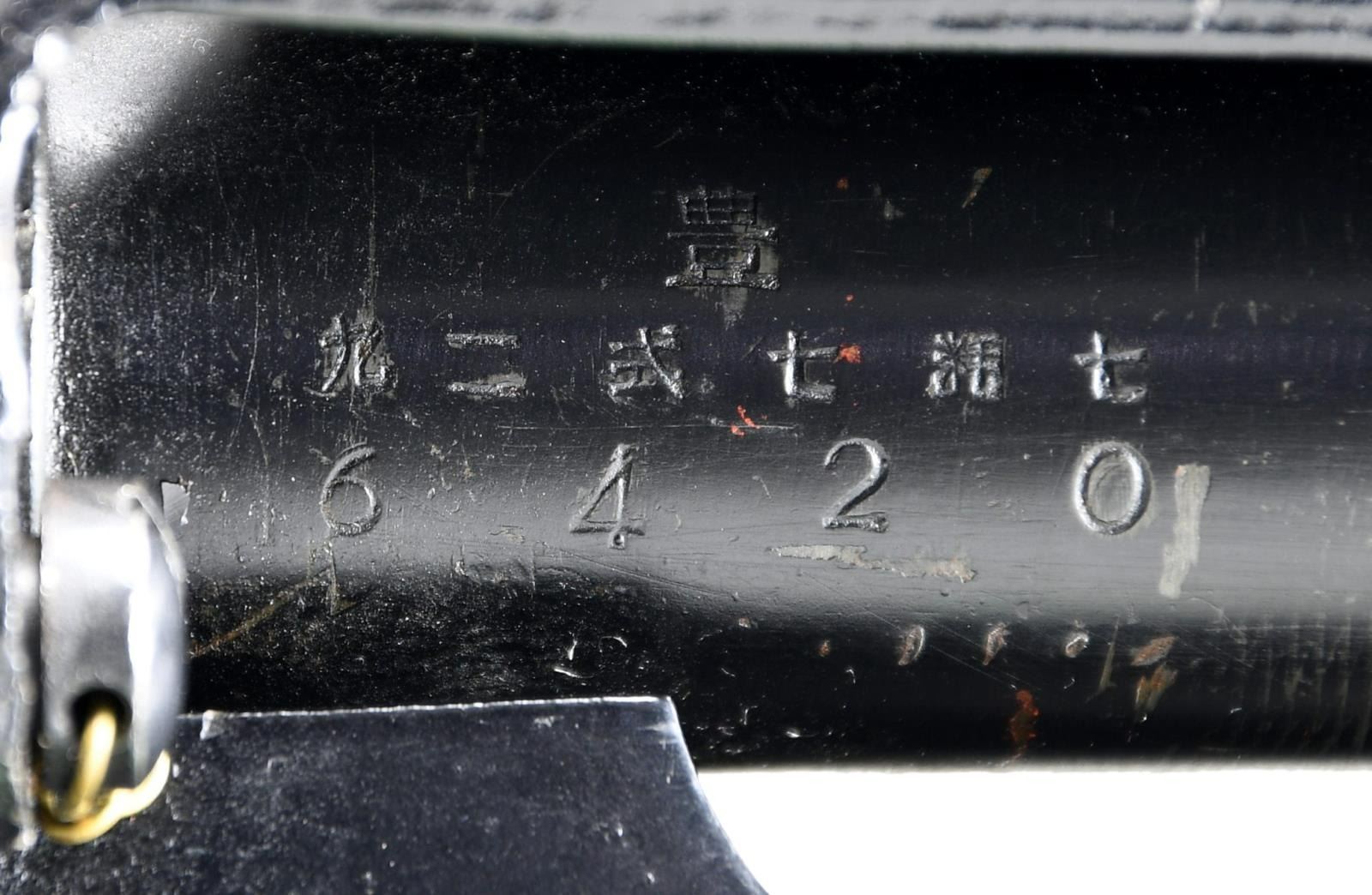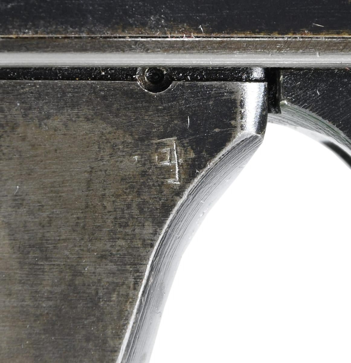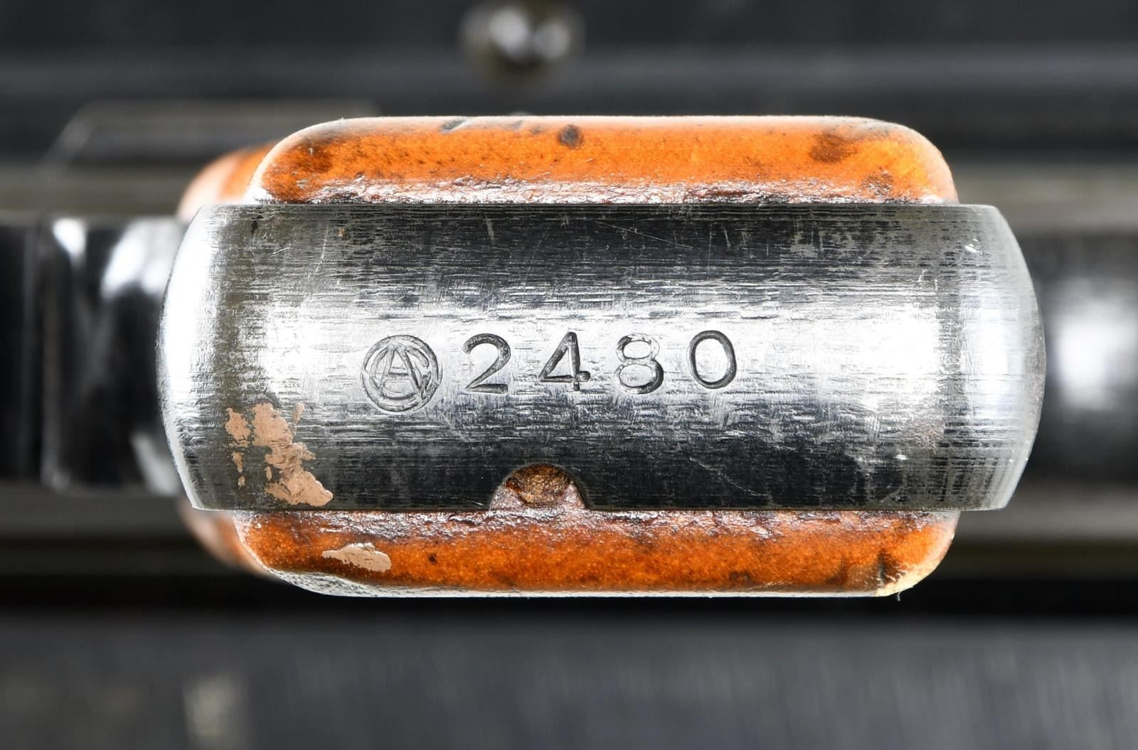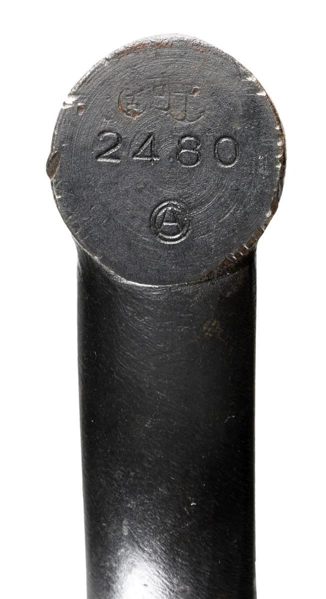 Cal. 7.7mm Rimmed. S# 2480. Bbl. 26". Mfg. 1943. Open bolt, gas operated machine gun, fed from a 97 round pan magazine. First adopted by the Japanese in 1932 & utilized in both the Army & Navy. Originally introduced as the Type 91 Navy Aircraft Machine Gun. When production began in 1932, there was a high percentage of parts that were actually interchangeable w/ the British Lewis Gun. The most obvious difference between the Japanese & the British Lewis is the left side position of the charging handle on the Japanese gun, where it was positioned on the right by the British. It utilizes a leather wrapped single spade grip positioned at the rear of the receiver, which doubles as an oil reserve, hosting a long brush beneath the threaded steel cover. The trigger mechanism is located forward of a single pistol grip located below the action inside an elongated trigger guard. The sights are unique to the aircraft guns, consisting of a rear mounted circle, measuring 3" in diameter w/ a smaller circle in the center & wires running through the center, much like a traditional crosshair. The front sight is a tall post. Unlike many traditional Lewis guns, there is no large, round barrel jacket, or radiator on the Aircraft variant, but just an exposed barrel & gas tube, much like a typical Japanese machine gun. The finish on all exposed metal parts is a dark black mixed w/ traditional bluing. Several Japanese markings on barrel shroud & receiver, highlighted in white and easy to read, not so easy to translate. Some receiver markings, below top mounted drum translated to; "AIKAWA NAVY ENGINEERING EDITION / TYPE92 7.7 / SWOWA YEAR 18". Other markings include an anchor below serial number. MAGS: 1 steel 97 rd. pan. UNATTACHED ACCESSORIED: Small pedestal mounted on 6"x6" board for display. CONDITION: Finish is complete & consistent. w/ remarkable coverage. Markings are all clear, most highlighted white, and easy to read. Pan magazine appears equally clean. Barrel is slugged w/ steel rod, though dewat process appears to have been done meticulously so as not to affect other internals. Fire control mechanism appears to function smoothly & correctly when cycled by hand. NATIONAL FIREARMS ACT DEWAT MG REQUIRING BATF TRANSFER BEFORE TAKING POSSESSION. FULLY TRANSFERABLE.(03-1631/JZ). CURIO CLASS III. $8,000-12,000.