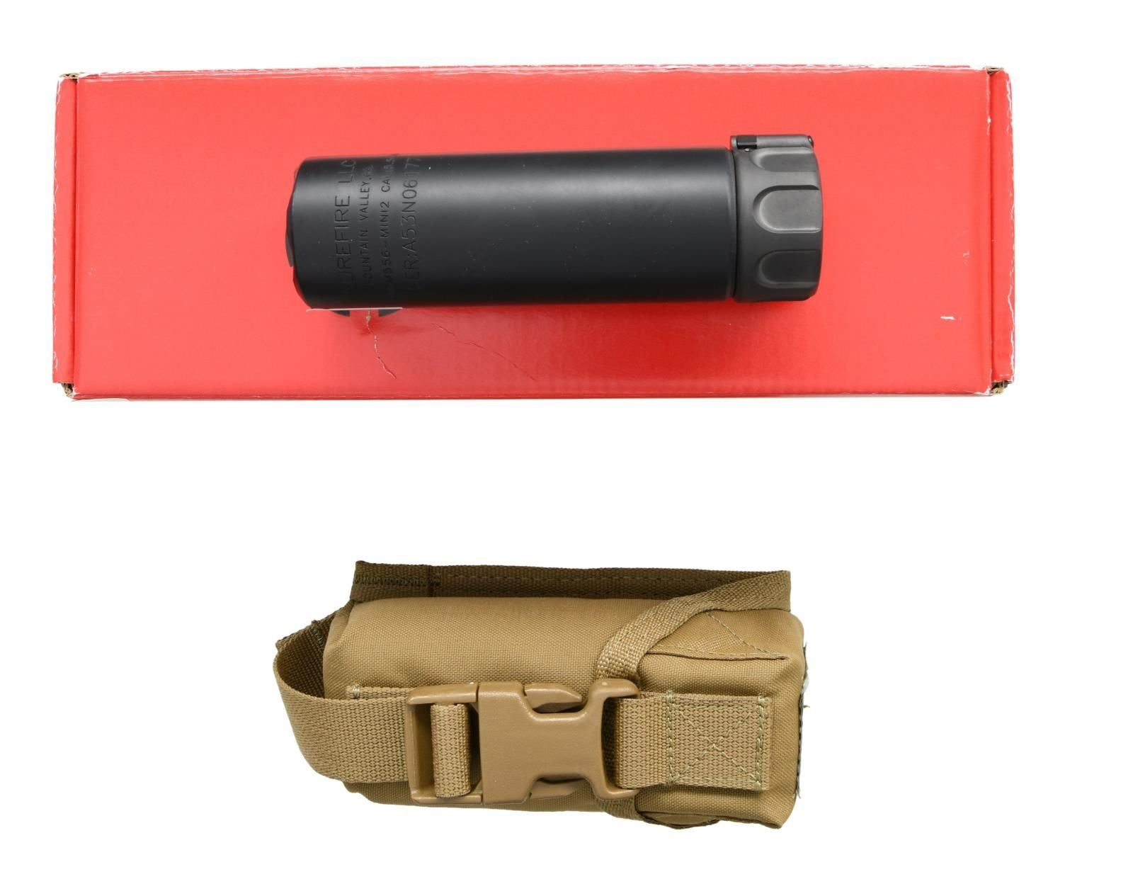 Cal. 5.56MM. S# A53N06177. Fast-attach, 5.56mm suppressor. Small & lightweight, constructed of high-temp alloys / stainless steel, & it's full auto rated. Intended for mounting & use w/ Surefire suppressor adapter. Black Cerakote finish. UNATTACHED ACCESSORIES: Factory tan pouch & box, cleaning tool w/ paperwork. CONDITION: As new in box. No sign of having been mounted. This product has never been sold retail. PROVENANCE: The Collection of Gun Sport Ltd. owned by Jon R. Thomas. NATIONAL FIREARMS ACT SUPPRESSOR REQUIRING BATF TRANSFER BEFORE TAKING POSSESSION. FULLY TRANSFERABLE. (03-1656/JZ). MODERN $800-1,200.