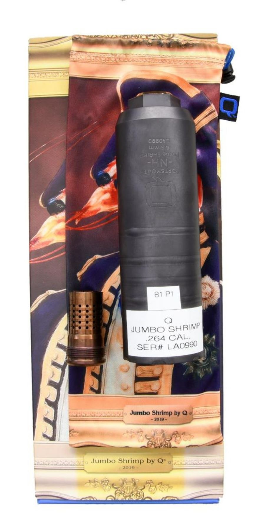 Cal. 6.5 Creedmoor. S# LA0990. The Jumbo Shrimp silencer by Q is a titanium, 6.5 Creedmoor can built around their own Cherry Bomb QD compensator. From fit & finish to packaging & presentation, the Jumbo Shrimp will not disappoint. It is complete w/ new 5/8x24 Cherry Bomb. UNATTACHED ACCESSORIES: Factory pouch & box packaging w/ 1 Cherry Bomb & paperwork. CONDITION: As new in box. No sign of having been mounted. This product has never been sold retail. PROVENANCE: The Collection of Gun Sport Ltd. owned by Jon R. Thomas. NATIONAL FIREARMS ACT SUPPRESSOR REQUIRING BATF TRANSFER BEFORE TAKING POSSESSION. FULLY TRANSFERABLE. (03-1660/JZ). MODERN $500-800.