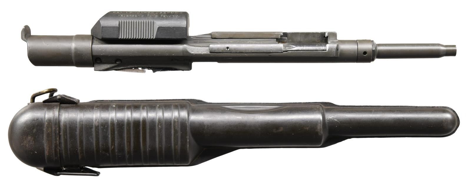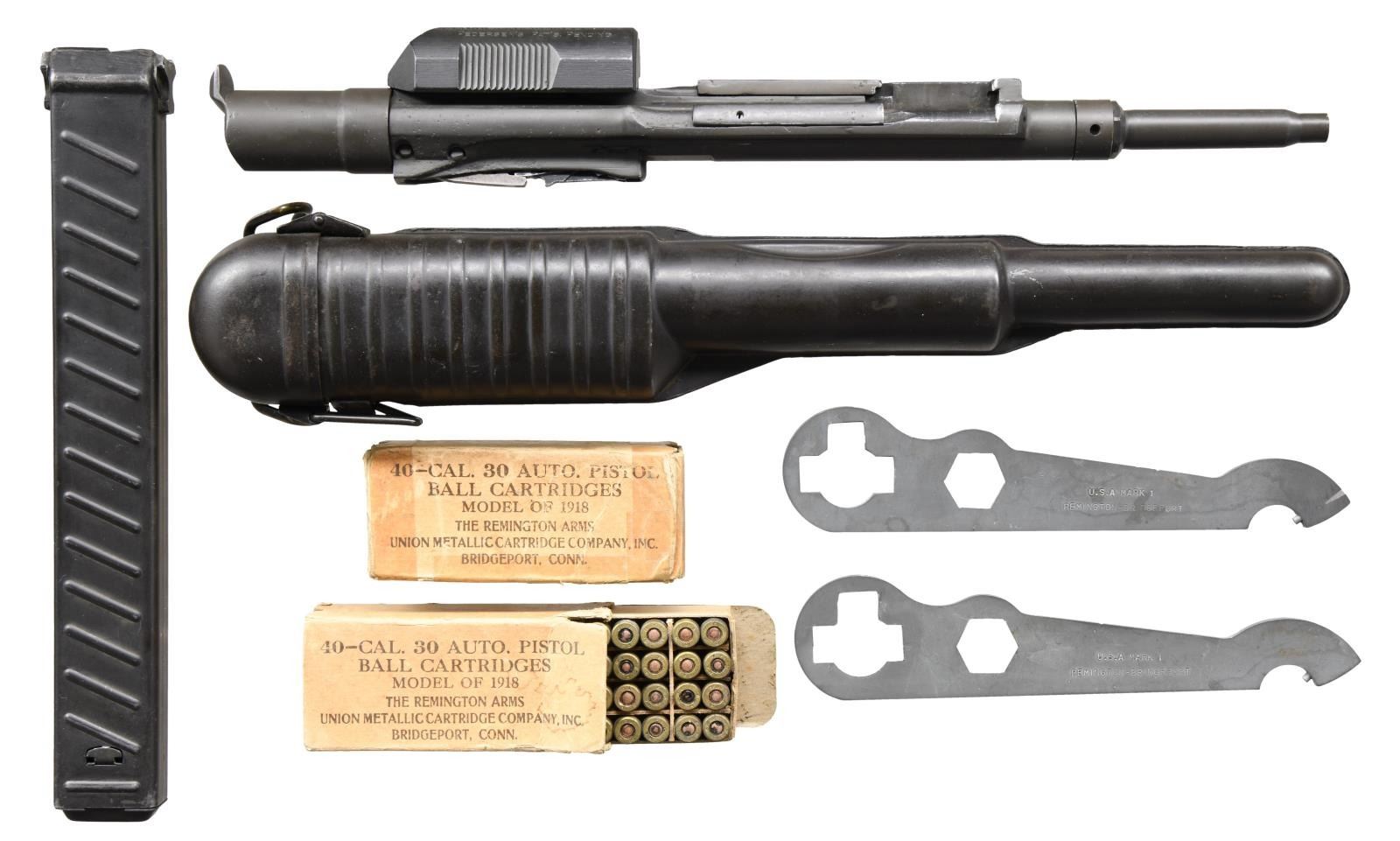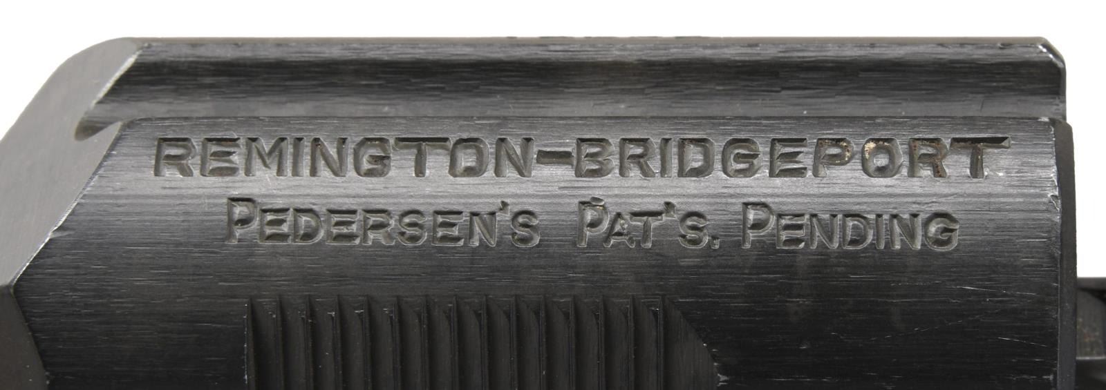 MODEL 1918 MKI PEDERSEN DEVICE WITH 2 BOXES OF ORIGINAL CARTRIDGES. Cal. 30 Pedersen. S# 12892. Bbl. 3 9/16". The device has an overall length of 12 1/2". Slide is marked on top right "REMINGTON - BRIDGEPORT / PEDERSEN'S PAT'S. PENDING". Marked on left side, oriented to be read from the right "U.S.A. 1918 - MARK I 12892" (S#). The device has no visible inspectors’ marks. Commonly referred to as the "Pedersen Device" the official nomenclature was "U.S. Automatic Pistol, Cal. .30, Model of 1918". The pistol terminology was adopted in order to maintain secrecy as it was hoped to use a large number of these devices in the planned spring offensive of 1919 which did not take place due to the Armistice in Nov. 1918. The device was designed by John D. Pedersen, a well-known firearms designer affiliated w/ Remington Arms Company. The concept of greater firepower in the hands of the infantry using the standard bolt action service rifle in a fast-firing semi-auto mode was appealing to the ordnance department & also met the approval of General Pershing who commanded the American forces in France. The device which showed much promise and was taken to France and tested. It greatly impressed General Pershing who recommended its adoption and initial purchase of 100,000 of the devices. The hope was the additional firepower would help break the deadlock in trench warfare. There were additional plans to adopt modified devices for the Model 1917 rifle and the Russian Mosin Nagant. The modified 1903 Springfield rifle which accepted the device was called "U.S. Rifle, Cal. .30, Model of 1903 Mark I. In order to provide the increased level of firepower the device used a pistol sized cartridge and allowed for the use of a standard service rifle with the added ability to quickly change back to full powered ammunition when the need arose. This change was easily accomplished by the soldier in the field who simply removed the service bolt and placed it in the issue canvas carrying case. He then took the device from its metal carrying case and inserted it into the rifle, locking it in place by pushing down the magazine cutoff. A 40-rd. mag. was inserted in the device to complete the change. When needed the process was easily reversed. The devices were produced after WWI until 1920 w/ approx. 65,000 completed. Additional 1903 Mark I rifles were made until the late 20s when production ceased. After a number of service tests interest in the devices waned & the majority of them were destroyed by burning in 1931 leaving a few intact examples & some devices assembled from parts salvaged from destruction. MAGS: 1 – 40 rd. marked "TP" and is provided w/ numbered viewing slots facing the firer to account for the number of cartridges remaining. Mag. is in good condition retaining most of its original finish however the feed lip on the left side is bent inward notably more than the right side. UNATTACHED ACCESSORIES: original unmarked steel carrying case w/ hinged lid and belt hook. Case has light wear retaining a large degree of original dark green parkerization. 2 original 40 rd. boxes of .30 auto pistol ball cartridges. The tan boxes are marked on top "40-CAL. 30 AUTO. PISTOL BALL CARTRIDGES / MODEL OF 1918 / THE REMNGTON ARMS UNION METALLIC CARTRIDGE COMPANY, INC. / BRIDGEPORT, CONN.". Cartridges are head stamped "RA H 19" indicating that although the boxes are labeled Bridgeport, Conn. the cartridges were loaded at the Hoboken, N.J. Ammunition Plant. Boxes have wear sm. tears & light staining. One has taped reinforcement. Ammunition has spots of oxidation but generally good appearance. Also included are 2 reproduction combination wrenches. Wrenches are marked "U.S.A. MARK I REMINGTON – BRIDGEPORT". Lightly worn wrenches w/ gray phosphate type finish. Leatherette padded carrying case. CONDITION: device has been restored w/ 80% of its lightly worn arsenal rework type parkerized finish remaining. Slide has black finish. The forward portion of the device resembles an empty cartridge case & has shallow rifling. PROVANANCE: from the Estate Collection of Thomas J. Mulligan. (23-2224/RW). CURIO $7,000-10,000.