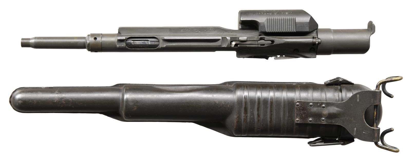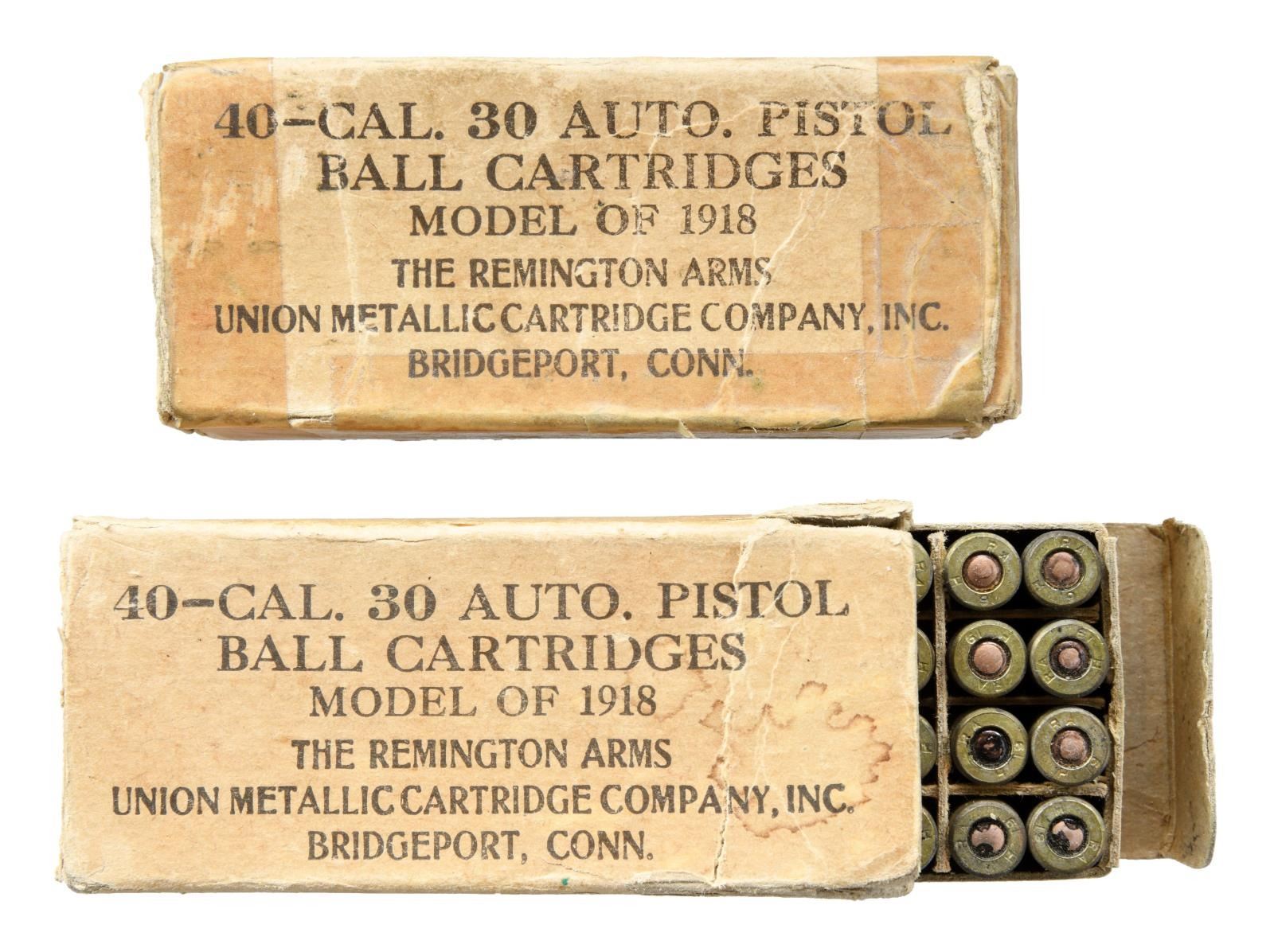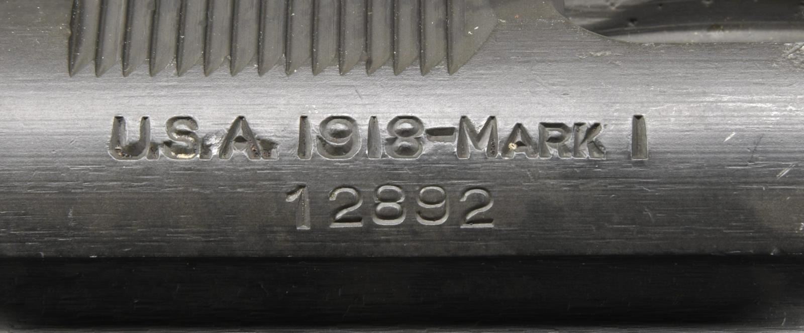 MODEL 1918 MKI PEDERSEN DEVICE WITH 2 BOXES OF ORIGINAL CARTRIDGES. Cal. 30 Pedersen. S# 12892. Bbl. 3 9/16". The device has an overall length of 12 1/2". Slide is marked on top right "REMINGTON - BRIDGEPORT / PEDERSEN'S PAT'S. PENDING". Marked on left side, oriented to be read from the right "U.S.A. 1918 - MARK I 12892" (S#). The device has no visible inspectors’ marks. Commonly referred to as the "Pedersen Device" the official nomenclature was "U.S. Automatic Pistol, Cal. .30, Model of 1918". The pistol terminology was adopted in order to maintain secrecy as it was hoped to use a large number of these devices in the planned spring offensive of 1919 which did not take place due to the Armistice in Nov. 1918. The device was designed by John D. Pedersen, a well-known firearms designer affiliated w/ Remington Arms Company. The concept of greater firepower in the hands of the infantry using the standard bolt action service rifle in a fast-firing semi-auto mode was appealing to the ordnance department & also met the approval of General Pershing who commanded the American forces in France. The device which showed much promise and was taken to France and tested. It greatly impressed General Pershing who recommended its adoption and initial purchase of 100,000 of the devices. The hope was the additional firepower would help break the deadlock in trench warfare. There were additional plans to adopt modified devices for the Model 1917 rifle and the Russian Mosin Nagant. The modified 1903 Springfield rifle which accepted the device was called "U.S. Rifle, Cal. .30, Model of 1903 Mark I. In order to provide the increased level of firepower the device used a pistol sized cartridge and allowed for the use of a standard service rifle with the added ability to quickly change back to full powered ammunition when the need arose. This change was easily accomplished by the soldier in the field who simply removed the service bolt and placed it in the issue canvas carrying case. He then took the device from its metal carrying case and inserted it into the rifle, locking it in place by pushing down the magazine cutoff. A 40-rd. mag. was inserted in the device to complete the change. When needed the process was easily reversed. The devices were produced after WWI until 1920 w/ approx. 65,000 completed. Additional 1903 Mark I rifles were made until the late 20s when production ceased. After a number of service tests interest in the devices waned & the majority of them were destroyed by burning in 1931 leaving a few intact examples & some devices assembled from parts salvaged from destruction. MAGS: 1 – 40 rd. marked "TP" and is provided w/ numbered viewing slots facing the firer to account for the number of cartridges remaining. Mag. is in good condition retaining most of its original finish however the feed lip on the left side is bent inward notably more than the right side. UNATTACHED ACCESSORIES: original unmarked steel carrying case w/ hinged lid and belt hook. Case has light wear retaining a large degree of original dark green parkerization. 2 original 40 rd. boxes of .30 auto pistol ball cartridges. The tan boxes are marked on top "40-CAL. 30 AUTO. PISTOL BALL CARTRIDGES / MODEL OF 1918 / THE REMNGTON ARMS UNION METALLIC CARTRIDGE COMPANY, INC. / BRIDGEPORT, CONN.". Cartridges are head stamped "RA H 19" indicating that although the boxes are labeled Bridgeport, Conn. the cartridges were loaded at the Hoboken, N.J. Ammunition Plant. Boxes have wear sm. tears & light staining. One has taped reinforcement. Ammunition has spots of oxidation but generally good appearance. Also included are 2 reproduction combination wrenches. Wrenches are marked "U.S.A. MARK I REMINGTON – BRIDGEPORT". Lightly worn wrenches w/ gray phosphate type finish. Leatherette padded carrying case. CONDITION: device has been restored w/ 80% of its lightly worn arsenal rework type parkerized finish remaining. Slide has black finish. The forward portion of the device resembles an empty cartridge case & has shallow rifling. PROVANANCE: from the Estate Collection of Thomas J. Mulligan. (23-2224/RW). CURIO $7,000-10,000.