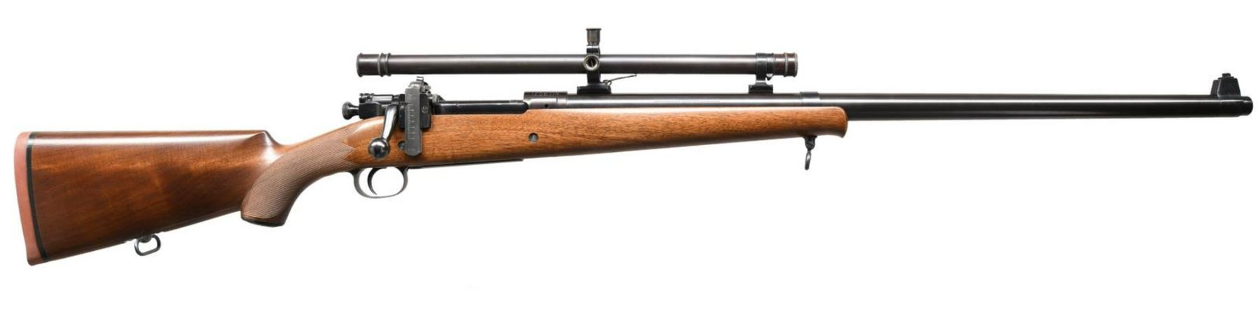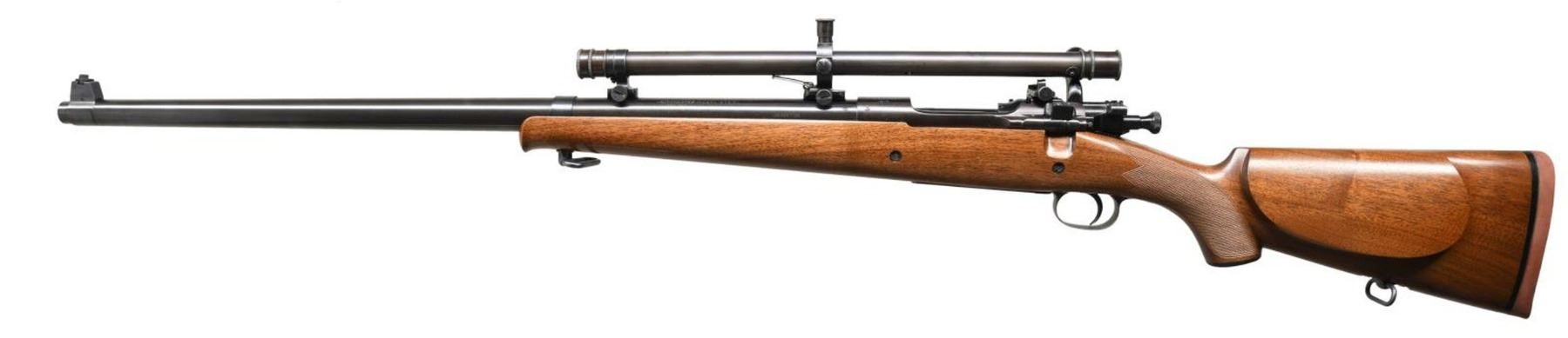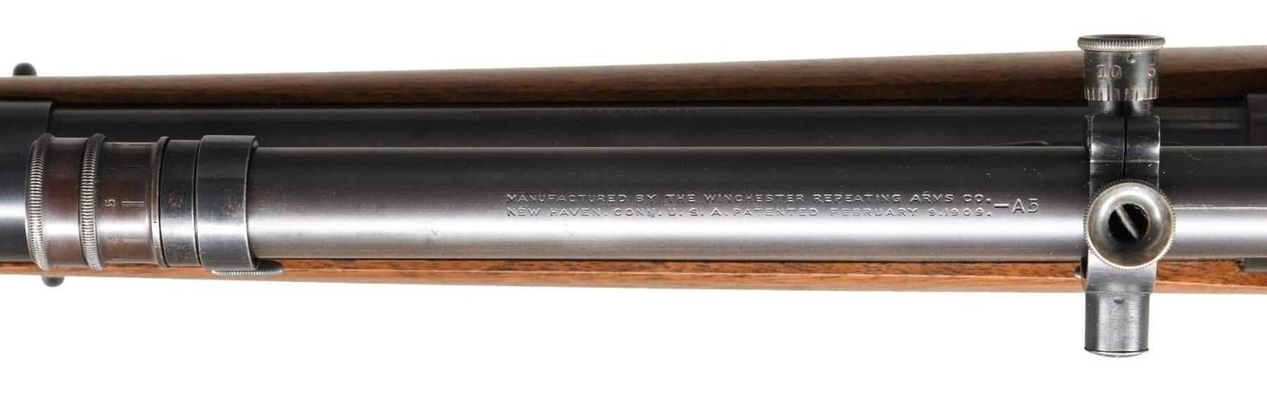 MODEL 1922 BOLT ACTION SNIPER RIFLE. Cal. 30-06. S# 1256714. Bbl. 25 13/16". The Winchester Model 1922 was offered for a very short time. The late LTC. Colonel William Brophy stated in his book "THE 1903 SPRINGFIELD RIFLES " that there may have been as few as three of these rifles produced. Two styles were made one used a service type stock and one had a custom made sporting style stock. The development of the Model 54 series rifles coupled with the need to purchase the Model 1903 actions from a government arsenal spelled an early end to the Model 1922. This model was advertised only in the September 1922, issue of "Arms and the Man". Captain Guy H. Emerson used a Type No. 2 Winchester Sniper to win the coveted Wimbledon Cup in the same year. The heavy weight barrel, made from Nickel steel tapers from 1 1/8" at the receiver to 7/8" at the muzzle and is marked on the left side, "WINCHESTER" "NICKEL STEEL" and near stock line ".30 GOV'T'06". Marked on the right side "MADE IN U.S.A. WINCHESTER REPEATING ARMS CO./ "NEW HAVEN,CONN.". The receiver was manufactured in 1923 and has been re-marked with original style markings as well as the "WP" proof. The Lyman "long slide rear sight is graduated to 150 points. It has the early small knobs and the flip-up aperture. The front sight is made from a Browning Automatic Rifle front sight base, marked "W" and has the sight blade fitted in a dovetail. Blade is marked ".045". The barrel has scope blocks and has a Winchester A-5 telescopic sight The 5 power scope has external adjustments and a crosshair reticle. The bolt has no legible markings but is the correct type. The stock of Black Walnut has a slight schnable forend , two recoil bolts, and a raised cheekpeice. The butt is fitted with a Winchester marked red recoil pad with a black spacer. Grip cap is marked Winchester. Pistol grip has fine cut checkering. 1 1/4" swivels. Front sling swivel mounts in the sporting type internal barrel band. CONDITION: the workmanship of this rifle is of the highest order throughout and the condition is near excellent to include both wood and metal. There only small spots of wear in the bolt race and on top of the original finish scope. Near excellent shiny bore. (23-5051/RW). MODERN. $5,000-10,000.
