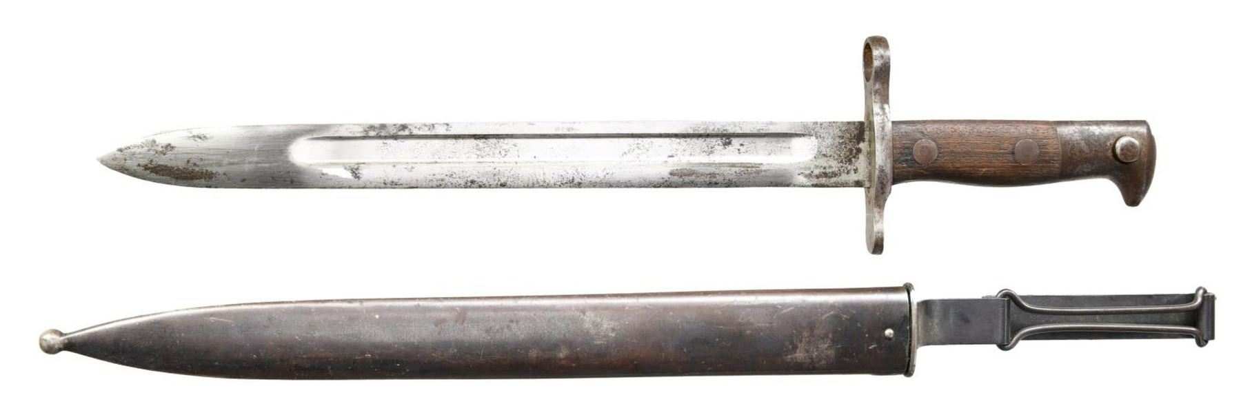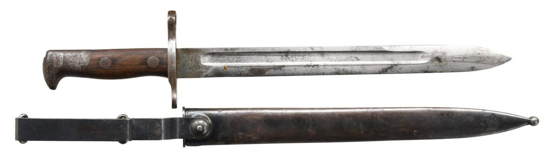 MILITARY RIFLE POSSIBLY USED BY CO. G 40TH U.S.V. IN PHILIPPINE INSURRECTION. Cal. 30-40 Krag. S# 217567. Bbl. 30". Model 1901 Ladder rear sight w/ windage adjustment. Blade front sight. Walnut stock and handguard. Stock has encircled script "P" and "32" assembly number under grip. Stock has an added marking on the left rear of butt the outline resembles a leaf and it encloses "US and 8". UNATTACHED ACCESSORIES: 11 3/4" fullered blade Krag bayonet dated on left ricasso "1898" and marked "US" on the right. Smooth walnut grips. Steel scabbard with wire belt attachment. Bayonet blade has scattered areas of light oxidation and very light pitting. Balance of metal turning gray and patina. Grips have light wear and staining. Blued scabbard turning patina with small dents. Consignor supplied document containing information from Springfield Research Service: "Serial Numbers of U.S. Martial Arms. Vol. 2" (pg. 75) stating that these rifles serial # falls within the range of a block of rifles sent to Co. G 40th U.S. Volunteers (Kansas) in 1899. The 40th U.S. Volunteers served in the Southern Philippines. "During the Spanish-American War, U.S. forces in the Philippines and Filipino forces led by revolutionary leader Emilio Aguinaldo had a common enemy in Spain. As hostilities came to a close the United States emerged from the war victorious. As a result of the Treaty of Paris, December 10,1898, the United States gained the Philippines as a U.S. territory. Approximately 125,000 troops served in the Philippines during the war. After more than three years of fighting, at a cost of 400 million dollars and approximately 4,200 American dead and 2,900 wounded, President Theodore Roosevelt proclaimed an end to the insurrection in the Philippines on July 4, 1902." CONDITION: Arsenal replacement stock has a nice appearance with crisp proof, light wear and small scattered handling marks. Metal has 60% of its original blue with thinning, wear, and scattered spots of light oxidation throughout. Action area has added varnish like protective finish. Bore is turning gray with fine pitting and light wear to lands. (23-2726/RW). CURIO. $1,200-1,800.