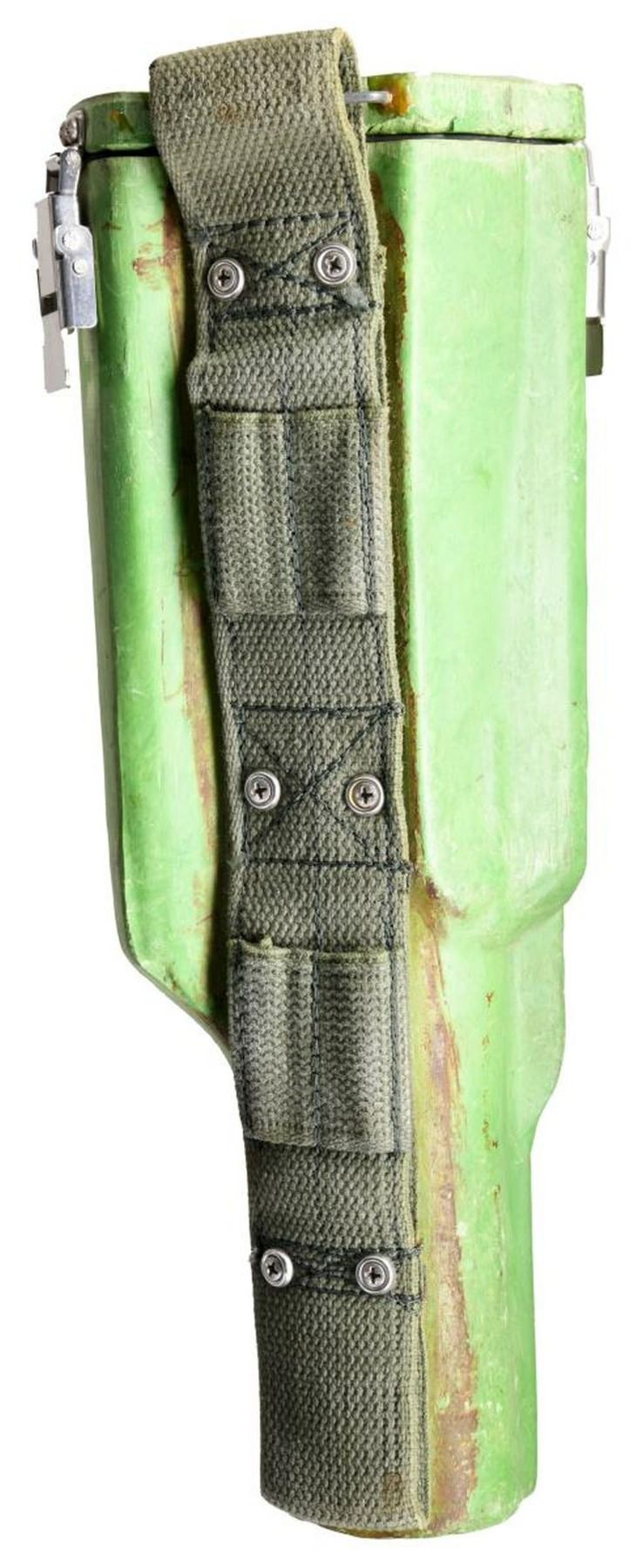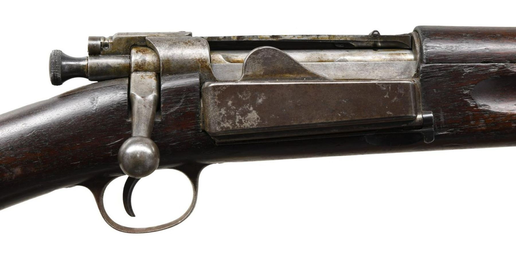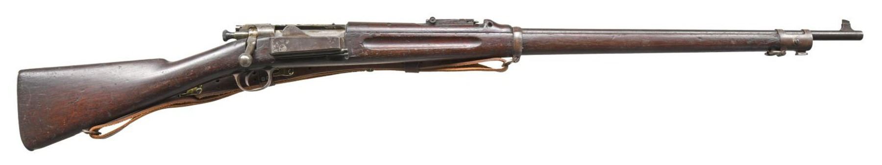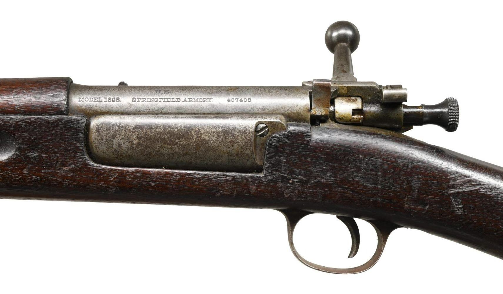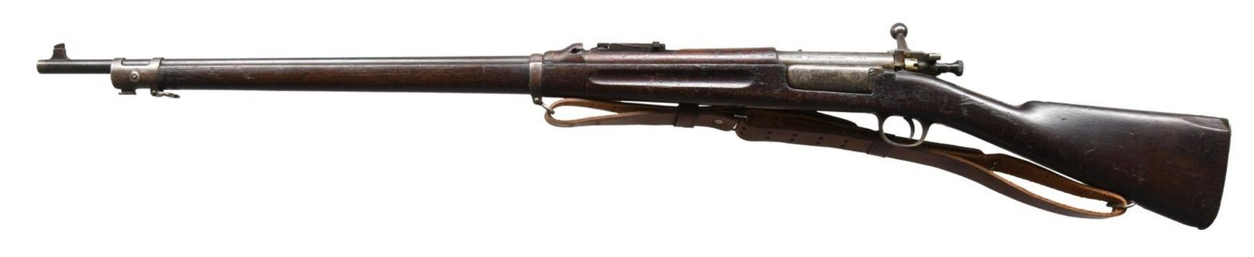 MILITARY RIFLE. Cal. 30-40 KRAG S# 407409. Bbl. 30". Model 1901 ladder rear sight graduated to 2,400 yards. Sight ladder does not have drift allowance & is marked "C" on the front left side. Blade front sight. Walnut stock set with smooth trap buttplate. Hand guard is Model 1902 carbine type w/ hump which clears binding lever. Modern military type brown leather sling. UNATTACHED ACCESSORIES: butt trap contains 3 section cleaning rod & nickel plated oiler. CONDITION: stock set shows heavily worn original finish w/ numerous handling marks & areas of chipping. Notable lg. missing chip on left rear by buttplate tang. Hand guard has extensive repaired crack & missing chip on left forward end. Metal has turned overall gray & patina w/ wear, light oxidation & handling marks. Shiny bore w/ moderately worn lance. (23-1953/RW). CURIO. $500-800.
