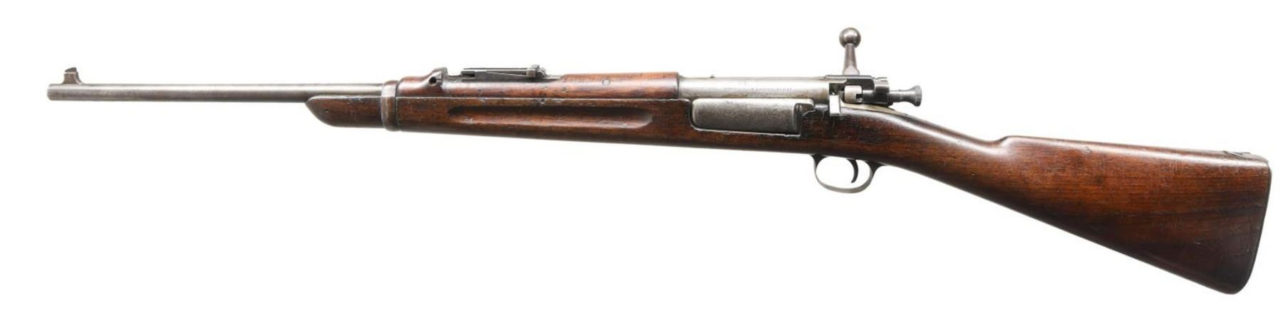 Cal. 30-40 Krag. S# 355657. Bbl. 22". Original carbine rear sight has been replaced by Model 1901 rifle rear sight graduated to 2,000 yards. Sight slide locking screw is broken; knob is not present. Blade front sight. Cocking piece knob is standard flared rifle type. Walnut stock set. Forend correctly measures 9 1/2" between mag. & bbl. band. Stock has boxed "JSA 1901" inspection cartouche. Stock is also marked w/ encircled script "P" proof under grip. Marked w/ "C" on top of grip & "12" is stamped on right side of butt. Correct handguard made w/ "hump sight protector". Smooth trap buttplate. CONDITION: stock set has worn original finish w/ scattered handling marks throughout but w/ legible markings. Metal turning gray & patina has moderate wear & handling marks w/ areas of very fine peppery oxidation. Buttplate tang is bent slightly upward. Bore has frosting w/ worn lands. (23-4946/RW). CURIO. $800-1,200.