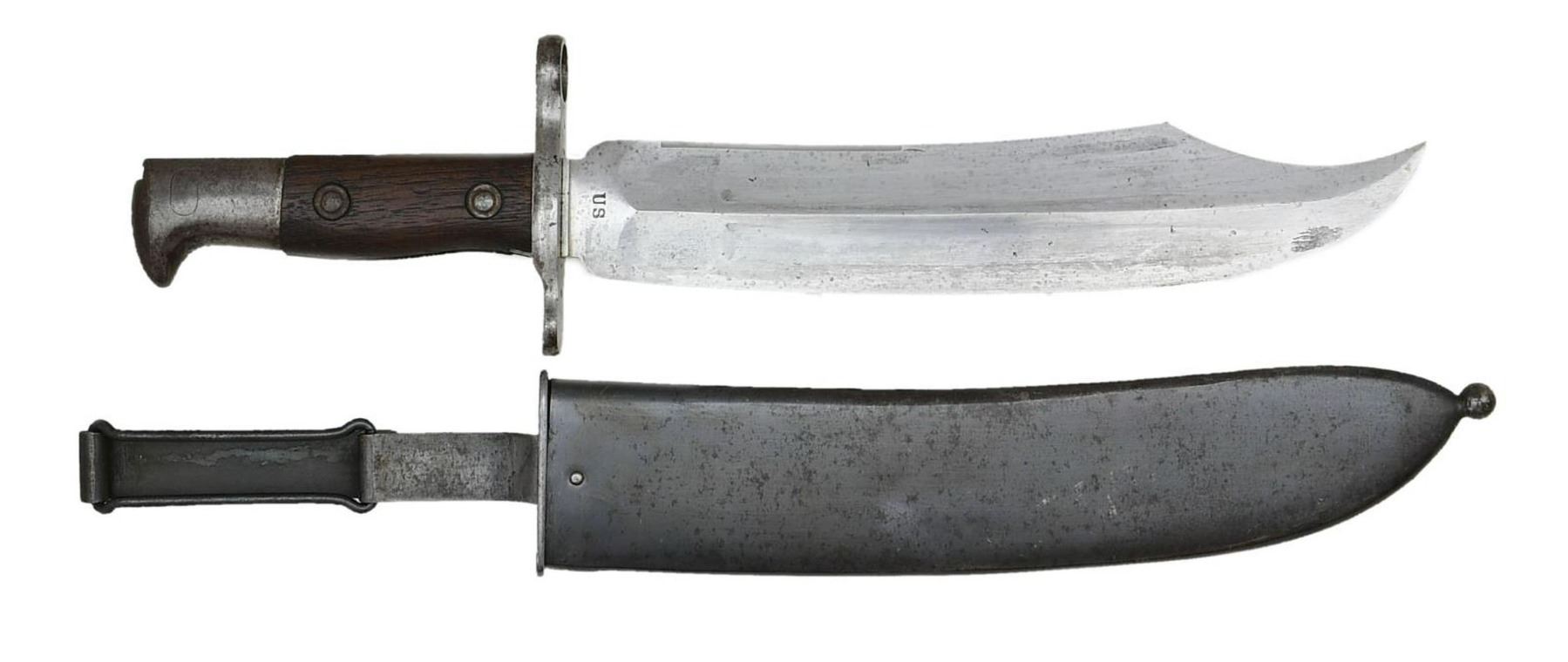 BOWIE BAYONET WITH SCABBARD. SHEATH. 1 of only approximately 2000-2800 Model 1900 experimental bowie knife bayonets produced at Springfield Armory during 1900 for the US military's Krag-Jorgensen rifles. Approximately 1,500 of these bayonets were sent to the Phillipines, with another 500 being sent to Cuba for field testing. Designed to be utilized not only as a bayonet, but also as an entrenching tool, field testing inevitably quickly showed that the design proved to be ineffective as a bayonet or an entrenching tool, with most bayonets seeing more use as machetes in the Phillipines that that of their intended purpose. this example is stamped "1900" on the left side of the ricasso, with "US" stamped on the right. The clip point bowie blade features a V-ground cutting surface on the rear edge and measures 9" from the tip to the guard, and 13 3/4" in overall length. V-notch cut2 piece smooth wood grips, with bird's head pommel. Proper blued scabbard with swivel hanger and ball tip drag. CONDITION: blade retains much of its original polished finish, with mild staining overall and some small scattered spots of discoloration. Guard and pommel exhibit a mottled gray patina, with some darker spots of discoloration. Grip panels are excellent overall. Scabbard retains the majority of its original blue finish, exhibiting some areas of mild wear and thinning that show through to gray patina, a couple small spots of cleaned pitting, some staining and spots of discoloration, as well as some scattered marks from handling and storage. A very attractive example of a scarce turn of the century US experimental bayonet. PROVENANCE: From the Lifelong Collection of Glen E. Mattox. (02-18939-1/MLW). $1,200-2,000.