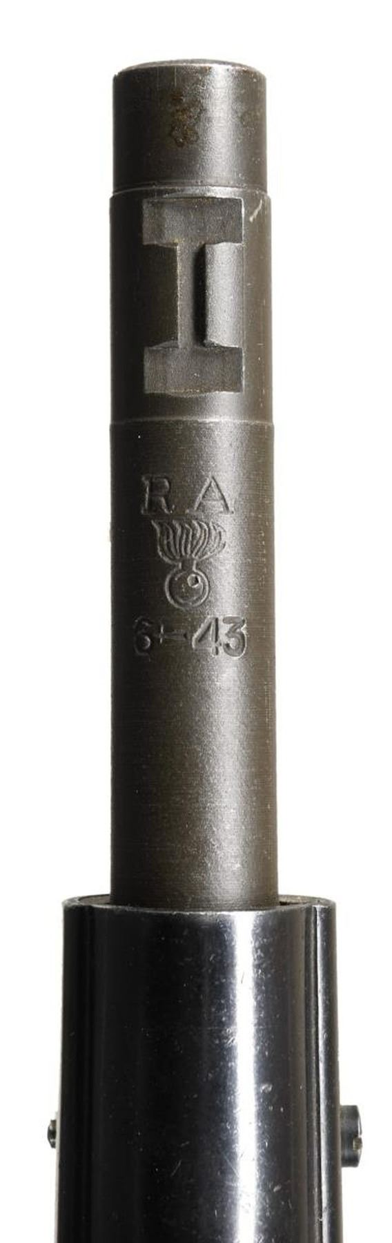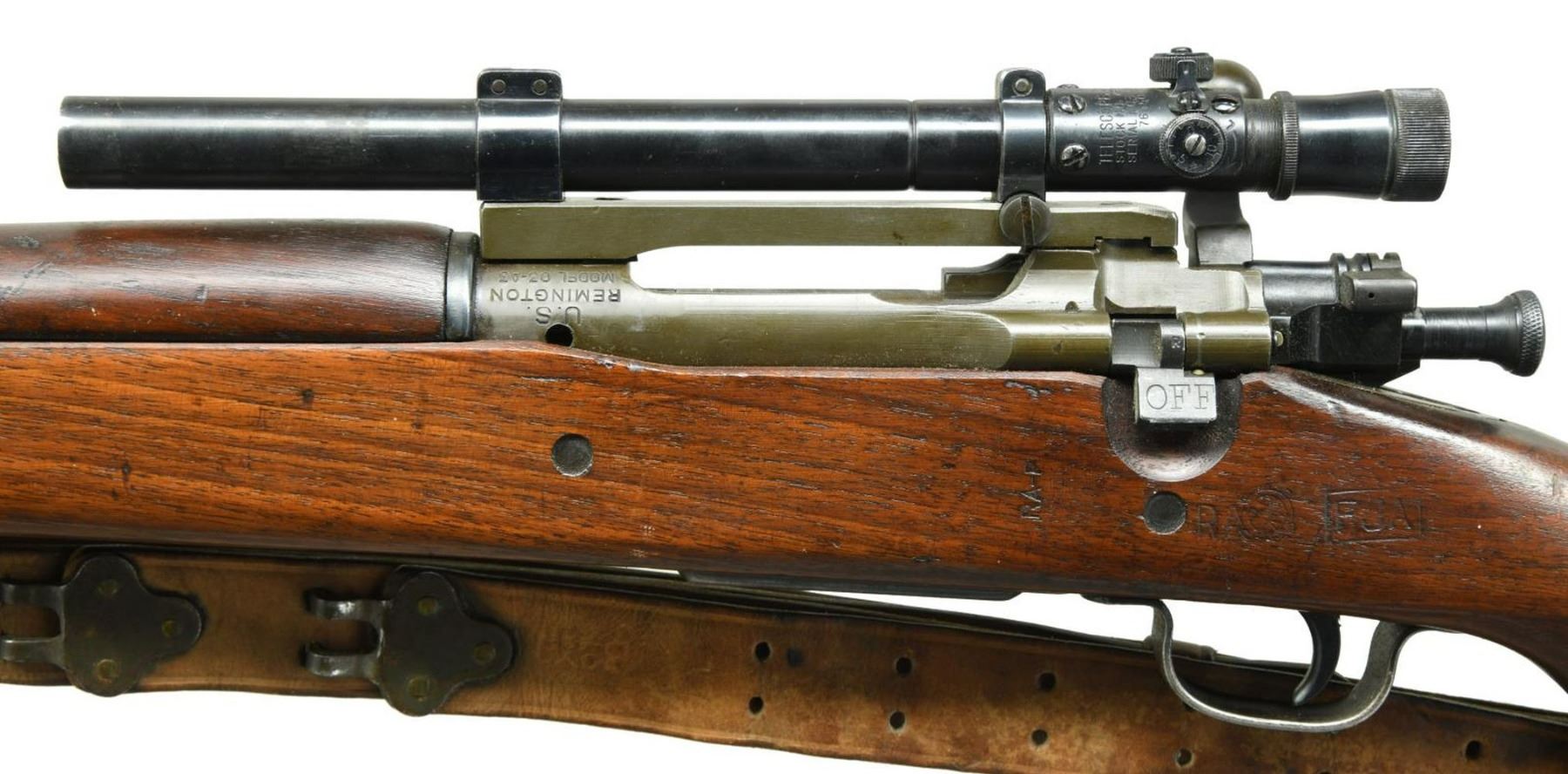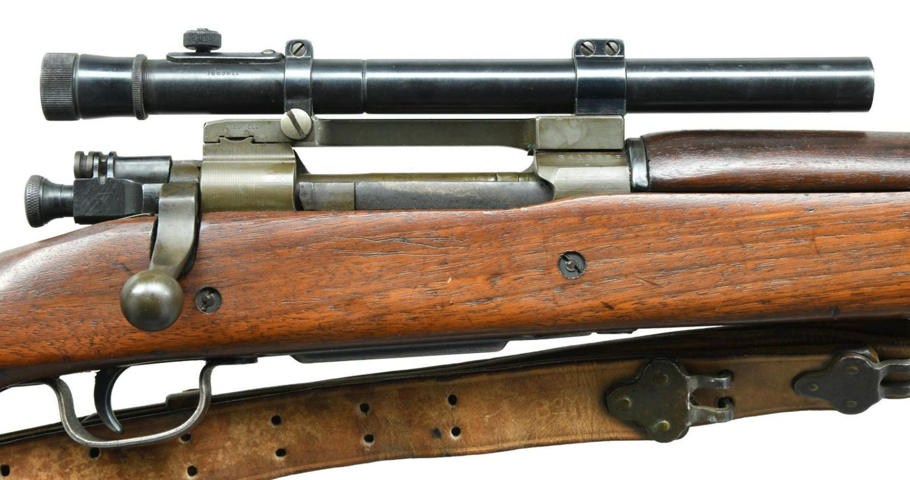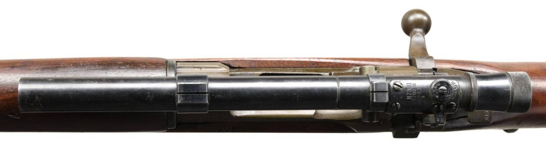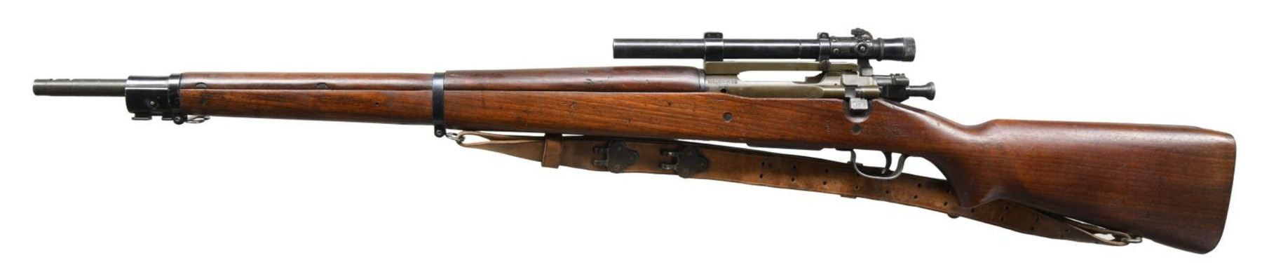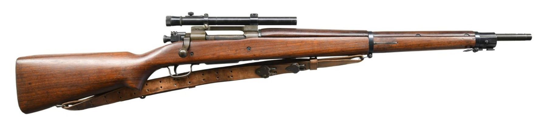 BOLT ACTION WWII SNIPER RIFLE. Cal. 30-06. S# 3413878. Bbl. 24". Marked "R-A""flaming bomb" "6-43". The barrel has never been fitted with a front sight. This very good correct Model 03-A4 has a late type pistol grip stock with crisp markings and an M73B1 telescopic sight. The receiver has off-set markings allowing them to be read with the scope mounted. The actual mark on the receiver is "MODEL 03-A3" which is correct for these rifles. Rifle is equipped with a M73B1 sniper scope marked "TELESCOPE M73B1" "STOCK NO.7579931" "SERIAL NO. The 3/4" tube scope is constructed of blued steel has a fine crosshair reticule and is numbered on the right rear 7669611. The base is marked on the right rear "REDFIELD" and has a single mounting screw at each end. the front of the base has a shim which is common on these bases. All visible rifle parts markings are "R".Correct bolt has clearance for scope. Walnut stock set. Stock has the proper cut for bolt handle. Stock is late type full pistol grip and two reinforcing screws. Stock is marked on left side over trigger guard with boxed "FJA" "RA" crossed cannons and "RA-P" which was likely a test and check at Raritan Arsenal. There are a number of assembly marks forward of trigger guard tang. "Circle P" proof under pistol grip as well as "D". All stamped furniture including the checkered buttplate & the "small bow" trigger guard. Tan "BOYT" model 1907 leather sling. UNATTACHED ACCESSORIES: unmarked original leather scope caps. CONDITION: scope retains most of its original blue finish w/ light wear & sm. scratches. Optics appear slightly cloudy but serviceable. Stock set has its original finish w/ crisp markings w/ light wear small scratches & handling marks throughout. Notable parallel gouges under forend due to improper removal of lower band. Receiver, barrel & scope base have most of their original wartime gray green parkerized finish. Furniture has Light wear & thinning of blue finishes. Very good shiny 2 groove bore. PROVENANCE: from the estate collection of Thomas J. Mulligan. (23-1201/RW). CURIO. $2,500-3,500.