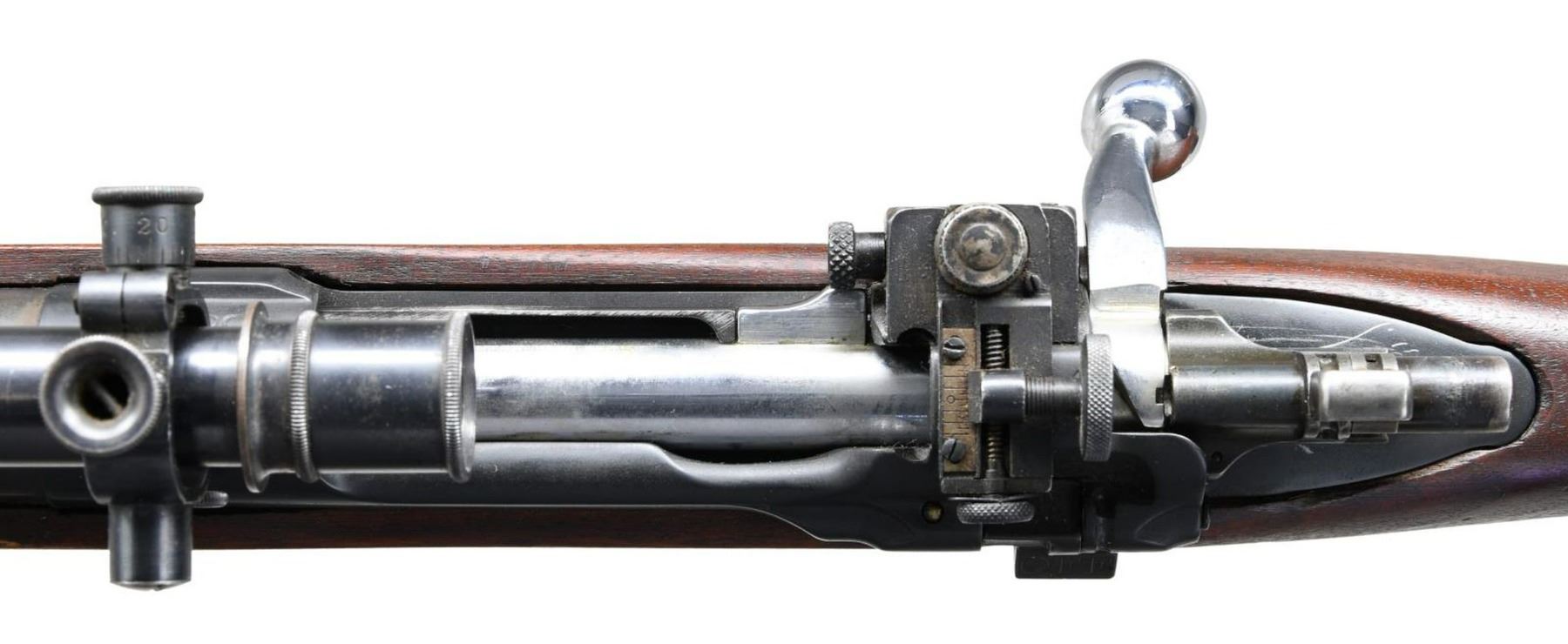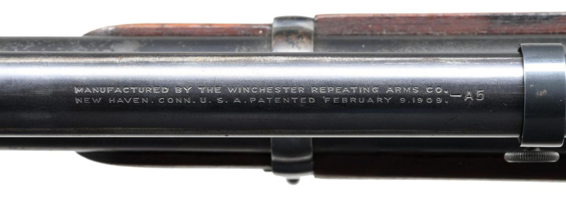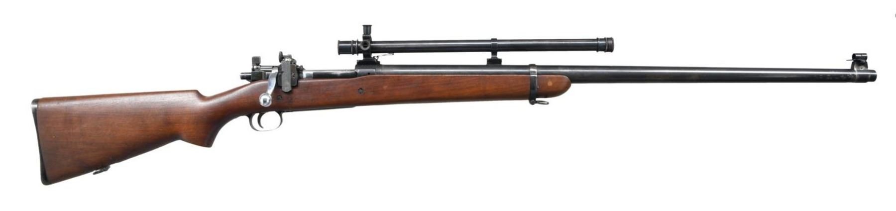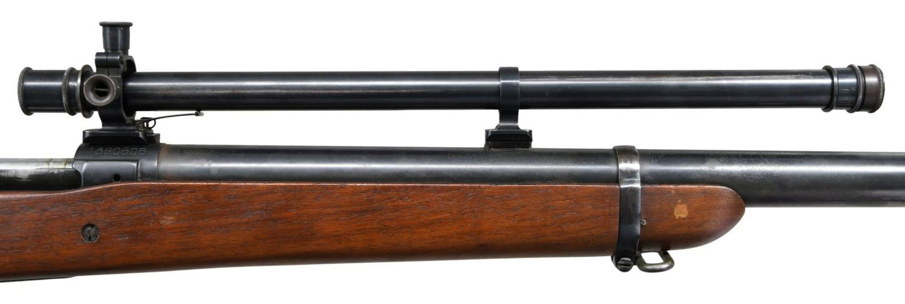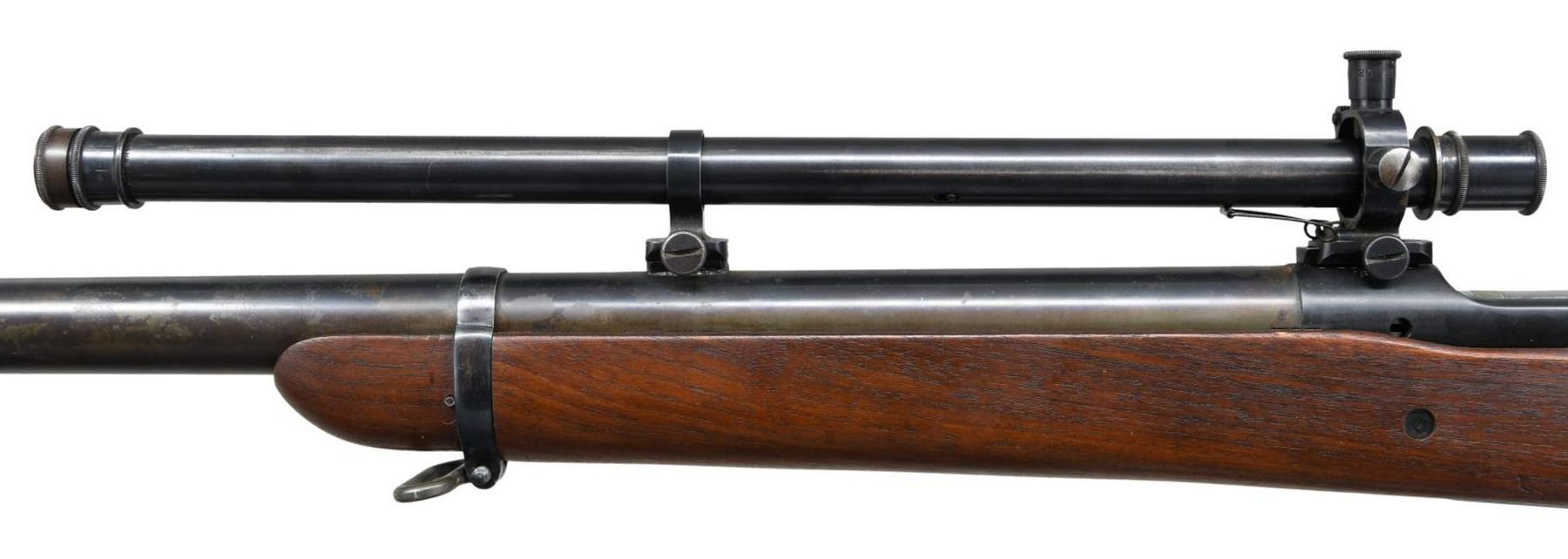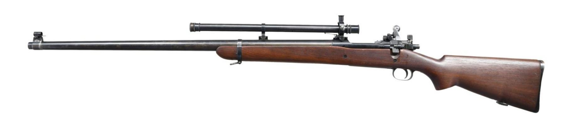 TARGET RIFLE. Cal. 30-06. S# 1380606. Bbl. 29 7/8". These target rifles were mfg. at Springfield Armory for use in competition shooting including World, Pan Am and Olympic matches. They were available for purchase by NRA members through the Director of Civilian Marksmanship as well as being available to military personnel for match competition. These rifles made on a limited production basis may vary in features or specifications. This rifle has a receiver mfg. in 1931 fitted with a heavy 29 7/8" Springfield barrel. Barrel marked at bottom "P" proof, "SA", "E-12". The receiver made without polished rails has the center punch mark in the right rail. Lyman 48 rear sight w/ matching internal numbers is graduated to 125 points. Winchester 67A globe front sight mounted on base adapted from the Browning Automatic Rifle. Receiver and barrel fitted w/ scope blocks spaced approximately 7 3/8" apart. Winchester A5 telescopic sight. The 5 power externally adjusted scope has fine cross hair reticle. Standard military grooved trigger. Bolt has been heavily polished and top of bolt handle has been ground to clear scope. Standard safety. Headless cocking piece. Bolt is marked underneath handle with "S" and punch mark. Standard trigger guard w/ blue finish. Walnut target type stock is secured to forend by 1 band. Stock has 2 recoil bolts & is fitted w/ cup type checkered buttplate used on match & sporting rifles. Stock is marked at belly w/ "SA6597". Cut out recess marked w/ "S" "9". CONDITION: stock set has very nice appearing original finish w/ light wear and occasional handling marks. Barrel channel has added fiber shim ahead of receiver. Barrel band has additional deeper inletting at bottom. Not visible when band is in place. Receiver has notably more dull blue finish than the bbl. which has thinning, wear, spots of peppery oxidation & notable spots of missing finish in area on front sight. Telescope retains 75% original thinning blue finish w/ light wear & scattered handling marks. Optics appear slightly cloudy but serviceable. Vertical cross hair is partly detached midway of top half. Very good shiny bore w/ sharp lands. PROVANANCE: from the Estate Collection of Thomas J. Mulligan. (23-1199/RW). CURIO. $3,000-5,000.
