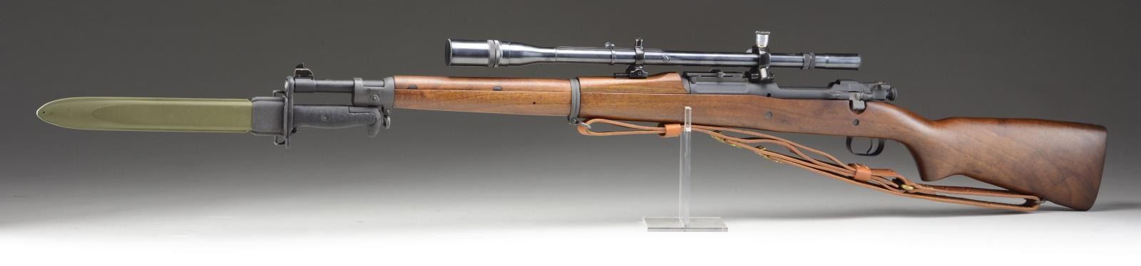 ASSEMBLED BY MILTECH AS A MODEL 1903 A1 SNIPER RIFLE. Cal. 30-06. S# 1522245. Bbl. 24" marked behind front sight "SA" flaming bomb "5-42". Muzzle has notable flat crown. Ladder rear sight graduated to 2850 yards. Flat windage & elevation knobs. Blade front sight. Receiver & bbl. fitted w/ scope blocks approx. 7 1/4" on center. Handguard has been milled to clear front scope block. Receiver has "Hatcher" hole. 1903 A3 bolt. Bolt handle markings have been obscured. All milled furniture including smooth trap buttplate which only partially opens. Grooved trigger. Matching walnut stock set. Buttstock is 1903 A3 style w/ pistol grip, 2 recoil bolts inletted at receiver ring for 1903 A3 handguard retaining ring. Tan leather military type sling w/ brass hooks. UNATTACHED ACCESSORIES: Unertl external adjustment 8 power 3/4" steel tube telescopic sight; S# "14545"; marked on top w/ Unertl logo. Screw in scope caps; aluminum scope mts., reticle and return spring are not present. 9 5/8" fullered blade M1 bayonet marked on left ricasso "AFH" flaming bomb "US". Grooved composite grips. Green plastic scabbard w/ metal throat marked w/ "US" w/ flaming bomb. Bayonet has been restored & retains most of its arsenal rework finish. Tan leather Model 1907 type sling. Reprinted copy of TM 9-1270 Maintenance Manual for U.S. Rifles of the Model 1903 Type. 5 steel stripper clips. 2 spare trigger guard screws & hand written data card for scope settings. Attractive military style wooden chest w/ foam pads. Chest is marked w/ Miltech logo & markings on chest include matching rifle S#. CONDITION: rifle in very good to near excellent condition. Professionally restocked & restored w/ only light high point wear. Very good shiny bore w/ sharp lands. Chest & accessories are in good serviceable condition except as noted. (23-4933/RW). CURIO. $1,000-1,500.