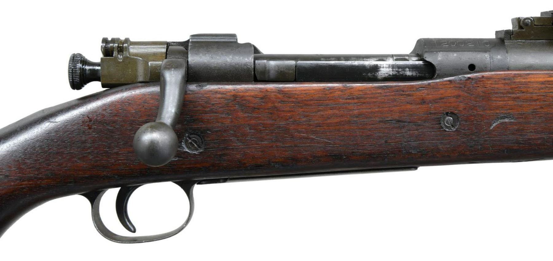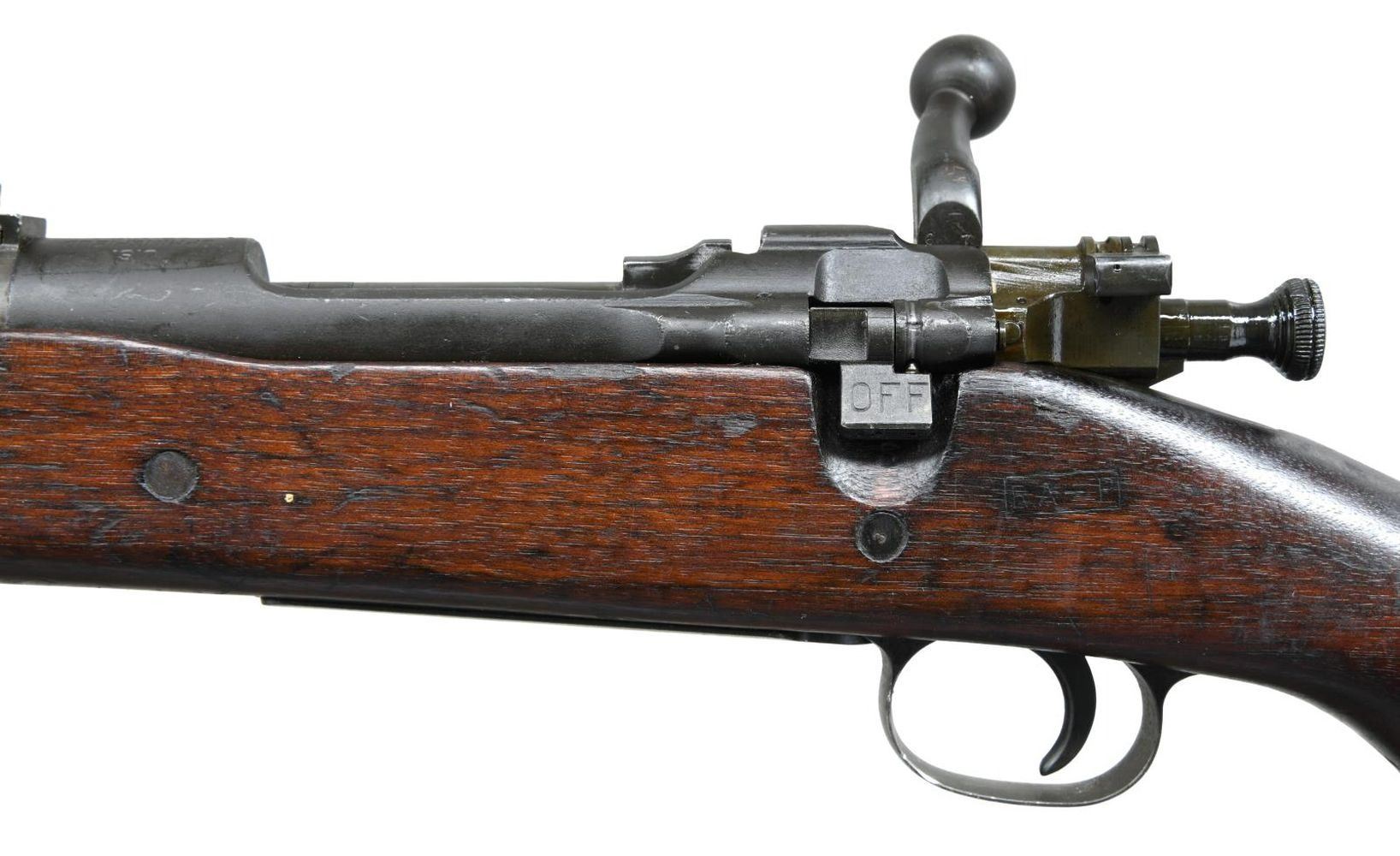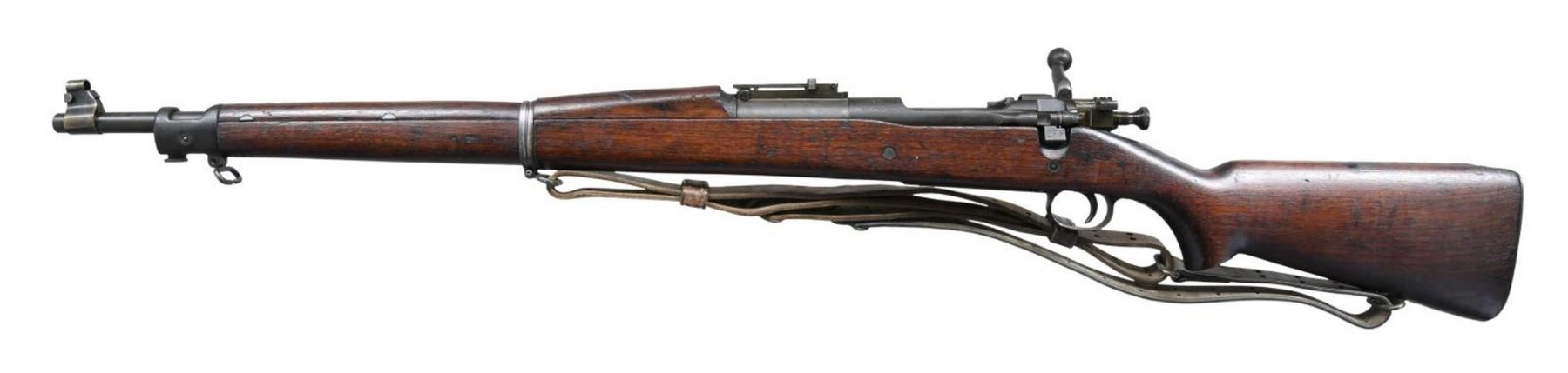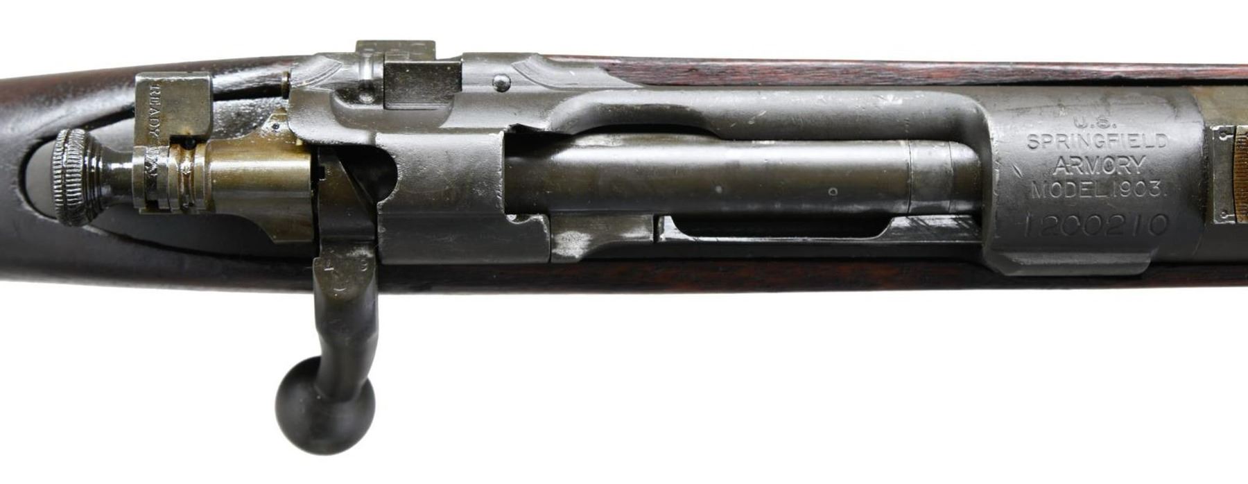 Cal. 30-06. S# 1200210. Bbl. 24" marked "SA (Flaming bomb) 8-42". WW2 era rebuild of an interwar 1903. Blade front sight w/ USGI sight hood. Ladder rear sight graduated to 2850yds. w/ volley notch. Swept handle bolt w/ punch mark on bottom of handle & "6 7" on top. Cocking piece & front band are marked "R" denoting they are of Remington mfg. WW2 era 1903A1 pistol grip stock set w/ boxed "RA-P" Raritan arsenal rebuild cartouche on left side. Bottom mounted sling swivels w/ Western Mfg. M1907 sling. CONDITION: front of handguard shows a couple long cracks, stock otherwise shows scattered dings & handling wear. Metal retains 50% arsenal reworked parkerized finish scattered thinning to gray, silvering & handling wear. Good plus bright bore that shows some frosting & a couple spots of light pitting. (23-869/MJC). CURIO. $700-900.