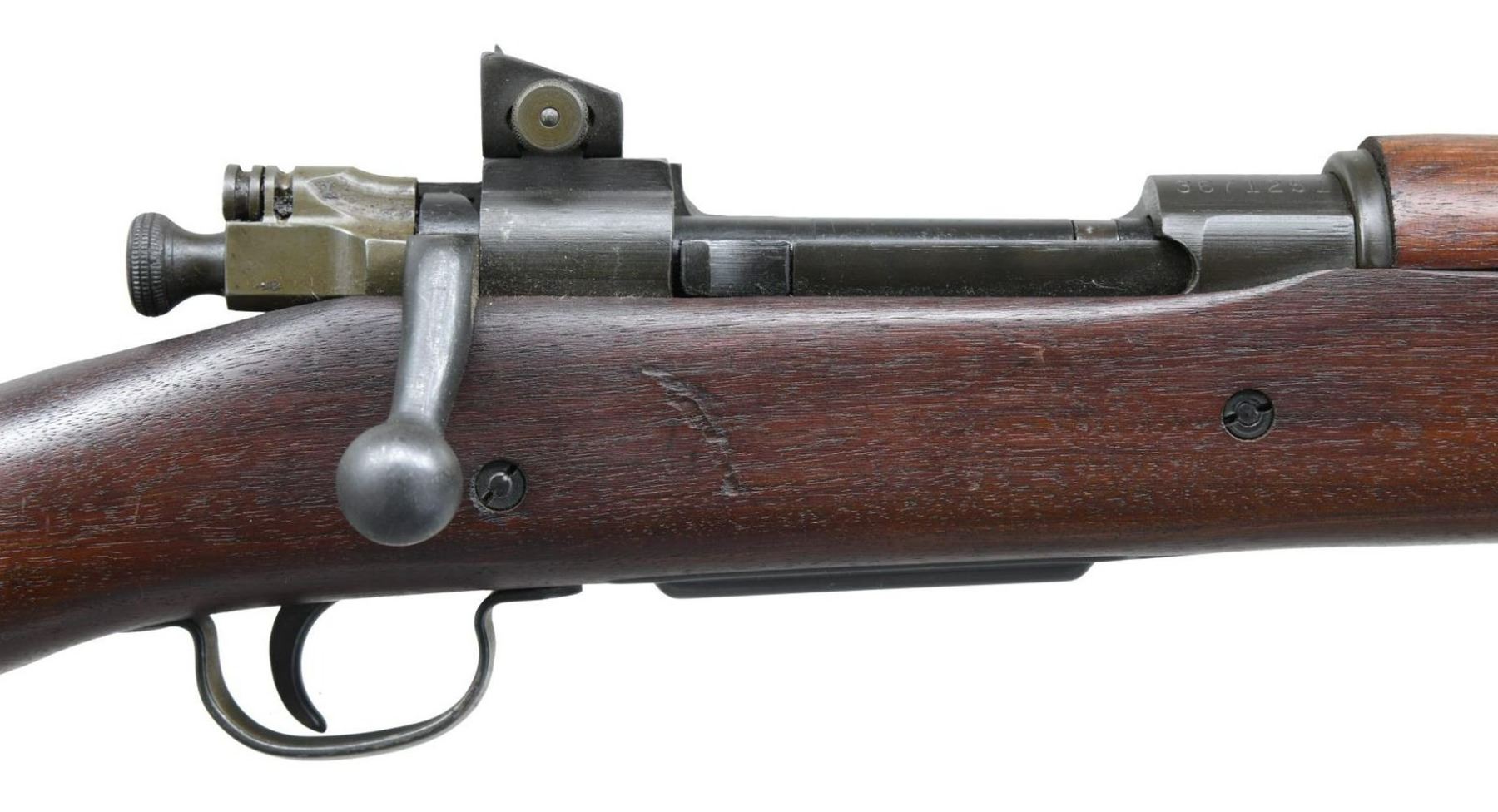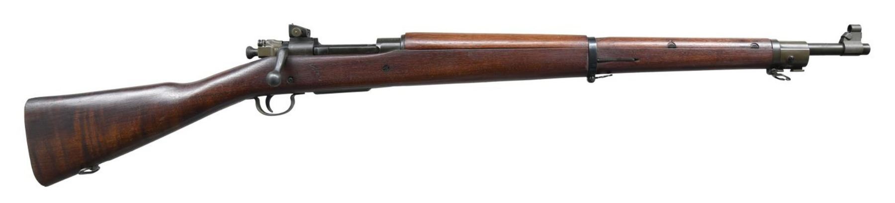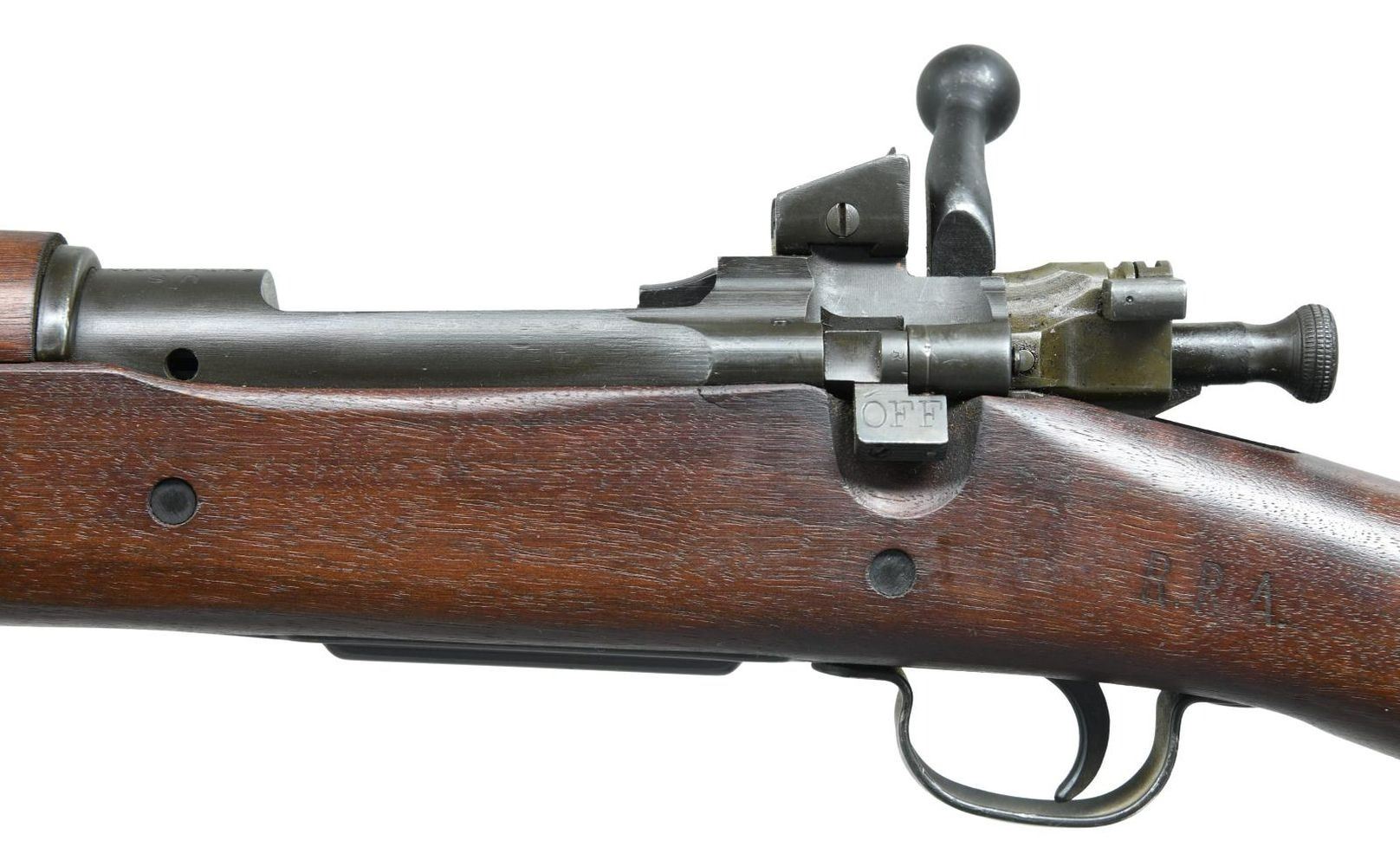 Cal. 30-06. S# 3671251. Bbl. 24" marked "SC (Flaming bomb) & 4-43. Aperture rear sight graduated to 800yds. Blade front sight w/ USGI sight hood. Top of bolt handle is marked "X". Trigger guard is of Smith Corona mfg. Mag cutoff & front band are of Remington mfg. Walnut stock set w/ "RRA" rebuild marking on left side & boxed "P" firing proof on bottom of wrist. No other visible stock markings. Bottom mounted sling swivels. CONDITION: middle of handguard shows some scarring from improper rear band removal, stock otherwise shows some scattered dings & handling wear. Rear band retains 95% arsenal blue. Balance of metal retains 90% arsenal parkerized finish w/ some silvering, light fading & handling wear. Very good bright bore. PROVENANCE: From the estate collection of Thomas J. Mulligan. (23-1237/MJC). CURIO. $700-1000.