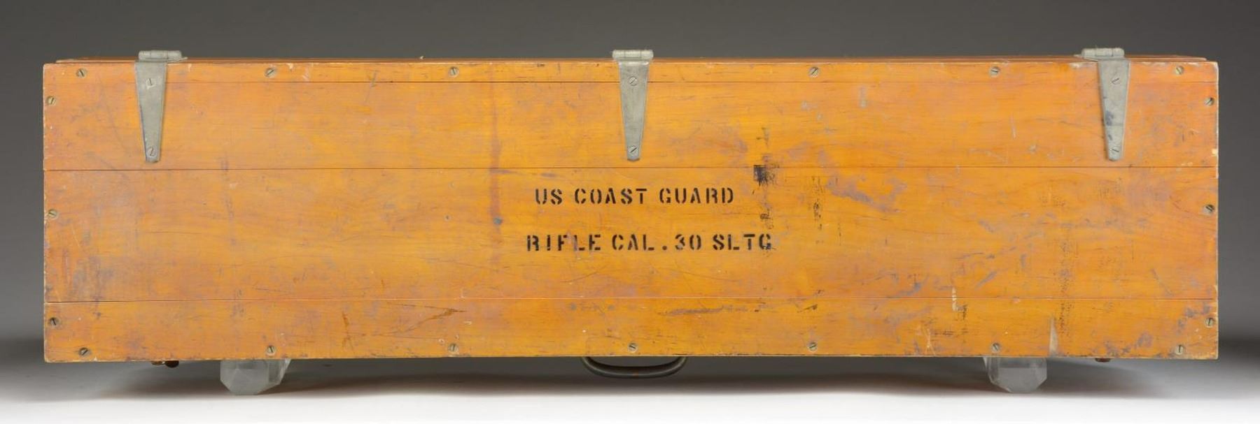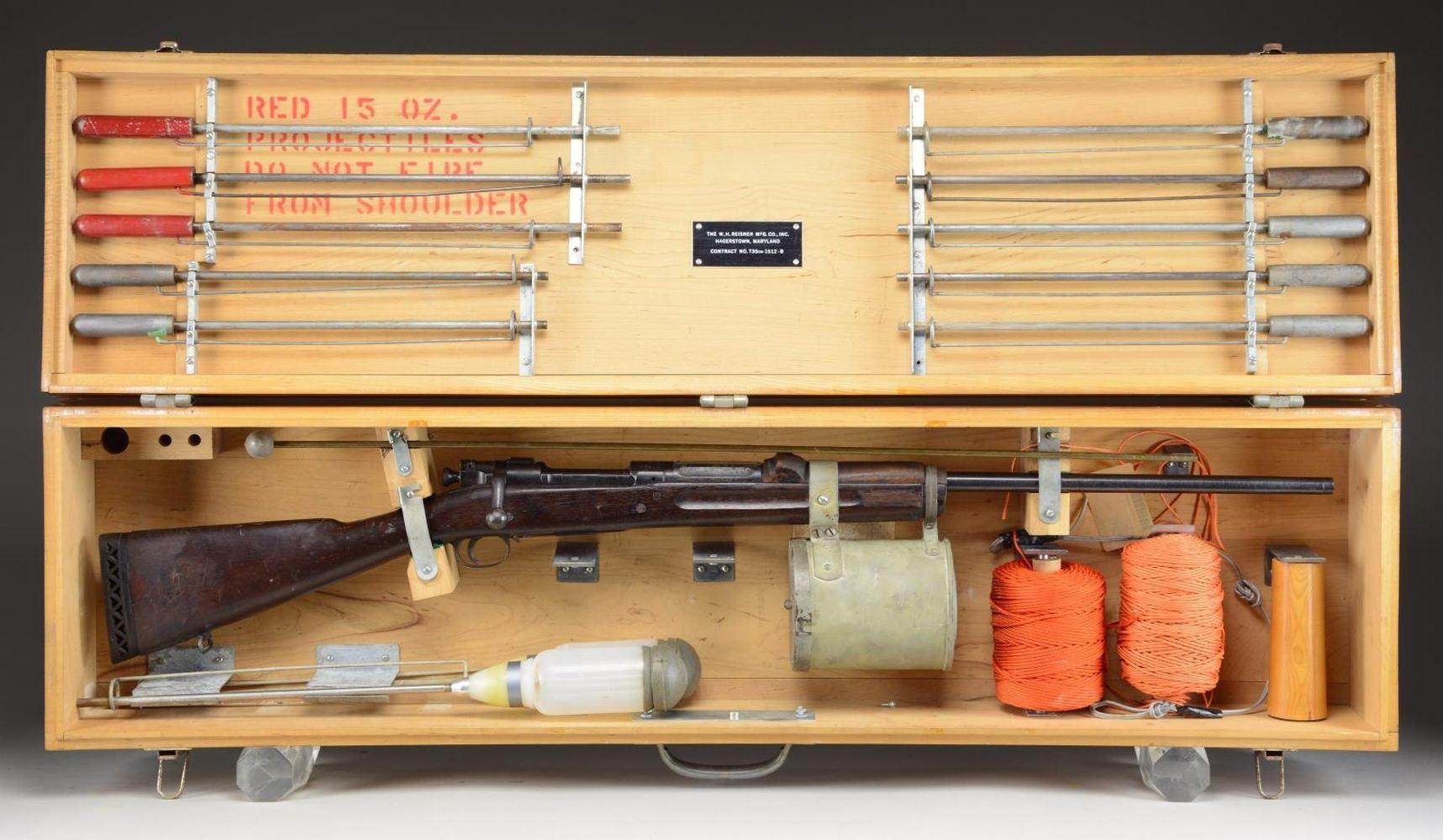 RIFLE. Cal. 30 Blank S# 660727. Bbl. 24" unmarked. US Navy line throwing 1903 rifle. No sights present. Mag follower assembly is present. Straight handle bolt is electro pencil matching to receiver. Rear of bbl. has brass plaque marked "U.S.N. NOrd 3914 30 CAL LINE THROWING RIFLE MADE BY VAN KARNER CHEM ARMS CORP NEW YORK USA". Line throwing canister present on forend. Shortened two-bolt walnut stock w/ 1" Hawkins recoil pad. Bottom mounted sling swivels. Right side of stock has "US anchor" marking behind grasping groove. Left side of stock has stamped "A.H.A." marking. Bottom of wrist has one circled & one plain "P" firing proof. UNATTACHED ACCESSORIES: W.H. Reisner mfg. case w/ Coast Guard markings on the outside of lid. Also included are two spools of modern orange line, a brass cleaning rod, three 15 ounce projectiles, seven 13 ounce projectiles & two illuminated buoyant projectiles. CONDITION: comb of stock has a large 7" crack that is causing the stock to separate. Stock otherwise shows a u-shaped repair at heel, scattered handling wear & dings. Metal retains 50% arsenal blue & parkerized finishes w/ some scattered pitting most notably on rear sight base, scattered oxidation, fading to brown & edge wear. Good bright smoothbore w/ some moderate pitting. PROVENANCE: From the estate collection of Thomas J. Mulligan. (23-1193/MJC). CURIO. $2500-3500.