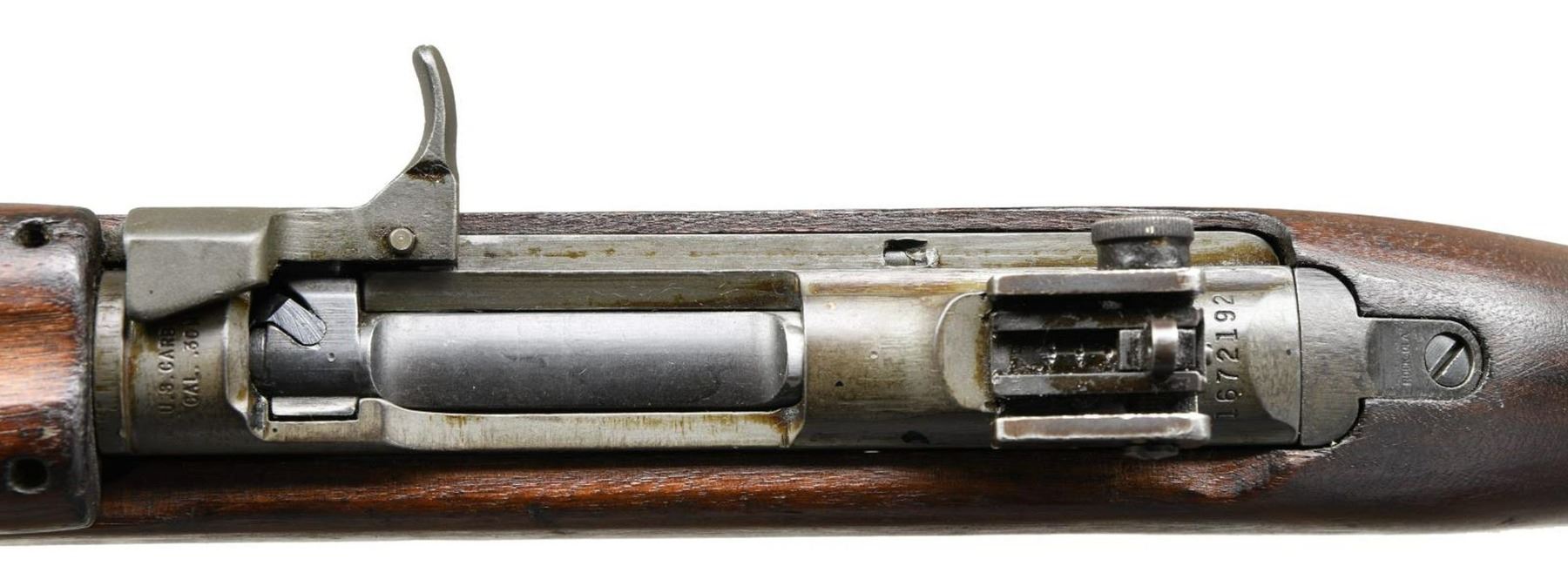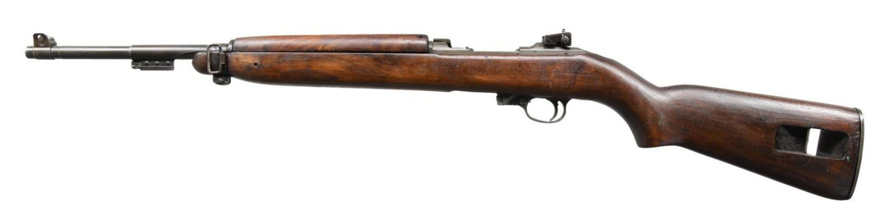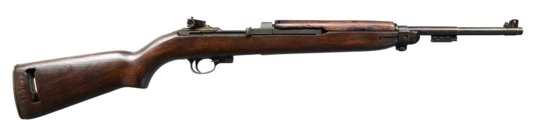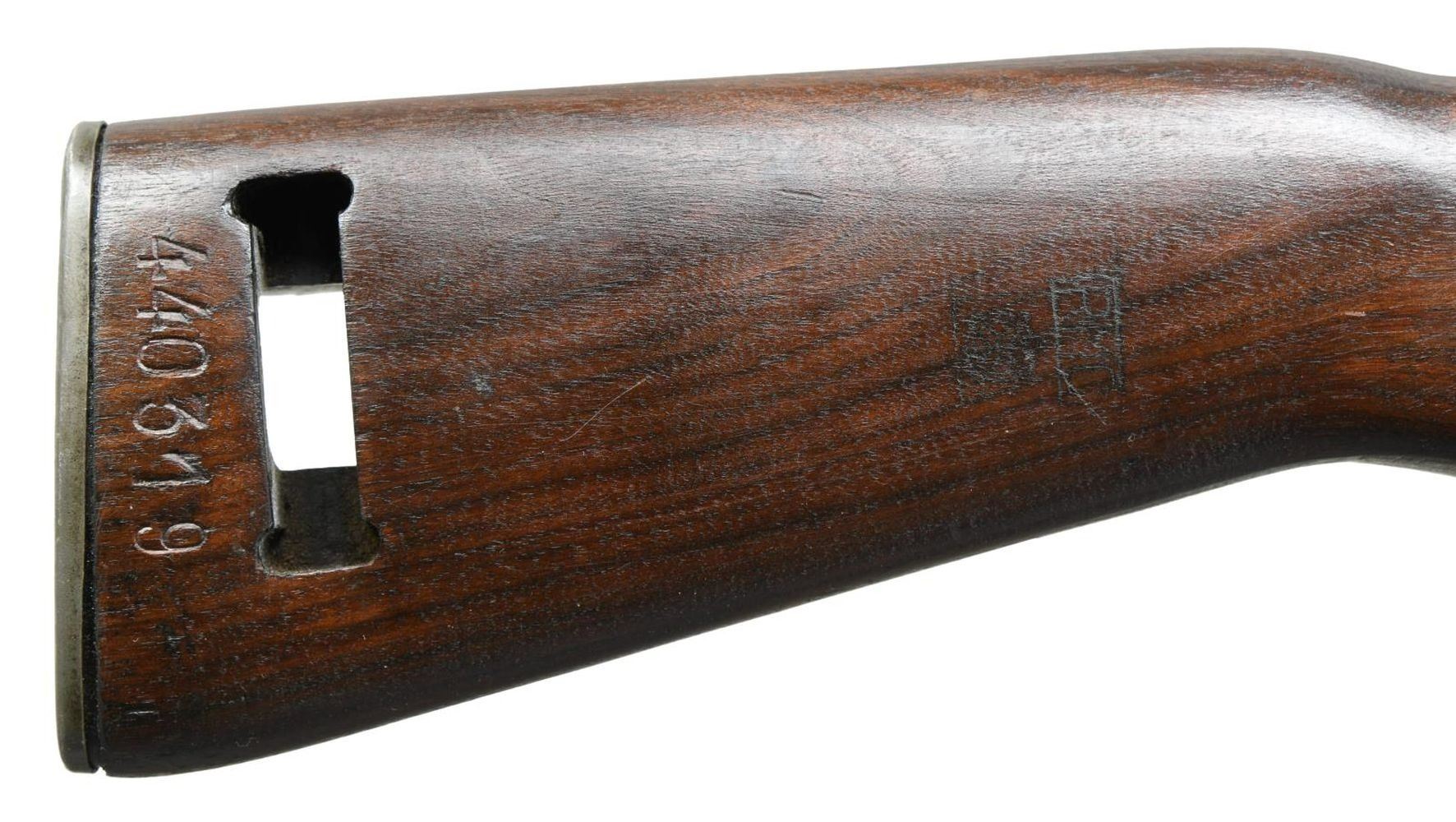 Cal. 30 Carb. S# 1672192. Bbl. 18" marked behind front sight "ROCK OLA". Nice appearing carbine with many "ROCK OLA" marked parts. Updates likely done at the Augusta Arsenal during overhaul. Replacement milled rear sight marked "SA". Blade front sight w/ protective ears. Barrel band with bayonet lug marked "SI". Straight cut slide marked "ROCK OLA". "Flat cut bolt marked "ROCK-OLA. Receiver Mfg. with detachable recoil spring tube. Recoil plate marked "ROCK-OLA". Milled triggerguard marked "ROCK-OLA". Rotary safety. Mag. catch marked "WA". Straight cut hammer marked "ROCK-OLA". "T-Cut " "low-wood" Walnut stock marked on right side of butt with vertically orientated " crossed cannons' and boxed "RMC". Marked in sling slot "RMC". Marked on the left side over trigger guard with faint " AAL" indicating overhaul at the Augusta Georgia Arsenal. Faint "P" proof under grip. Numbered behind sling slot on right side of butt "440319". Two rivet handguard marked "RMC". CONDITION; Stock set has light wear and handling marks with a notable loss of wood in inletted areas due to the arsenal rework finish. Metal retains 80% of its original parkerized finish with thinning and light wear. Very good shiny bore. (23-2664/RW). CURIO. $1,200-1,800.