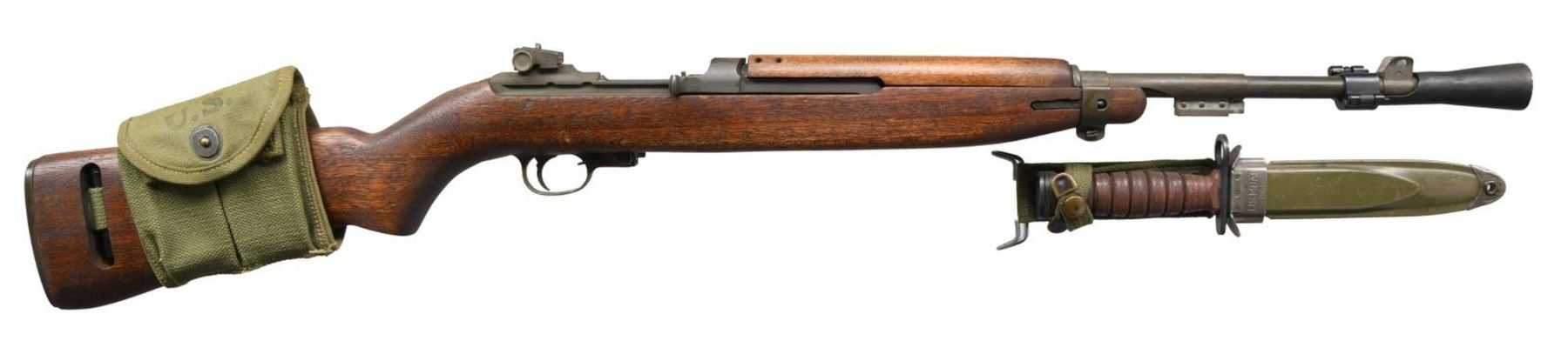 Cal. 30 Carb. S# 5570396. Bbl. 18". Bbl. is unmarked. Milled adj. rear sight. Blade front sight w/ protective ears. Bbl. band w/ bayonet lug marked "MMQ" "EMQ". 6 o'clock slide marked "PI". Import marked on bottom of bbl. Flat bolt marked "EM-Q". Milled trigger housing marked "W". Rotary safety. Mag. catch has 30 rd. mag. extension. Straight cut hammer marked "HI". Unmarked replacement hardwood stock set w/ "potbelly". Unmarked 4 rivet handguard. UNATTACHED ACCESSORIES: 6 5/8" blade bayonet marked "U.S. M4 CAMILLUS". Leather washer handle. Green plastic scabbard marked "U.S. M8A1". Bayonet in very good condition. Blade has been sharpened. Scabbard has wear but is in good serviceable condition. Canvas muzzle cover w/ green web retaining strap. Clamp on flash hider marked "HIDER, FLASH-M3". 2 pocket "U.S." marked mag. pouch by Hoyt dated "1943" CONDITION: stock set has light wear & staining w/ 2 notable chips at end of pistol grip. Metal retains 80% arsenal rework parkerized finish w/ thinning & light wear. Very good shiny bore. (23-1970/RW). CURIO. $600-900.