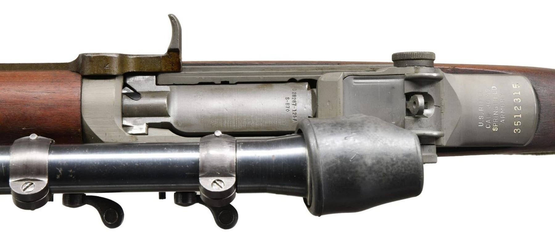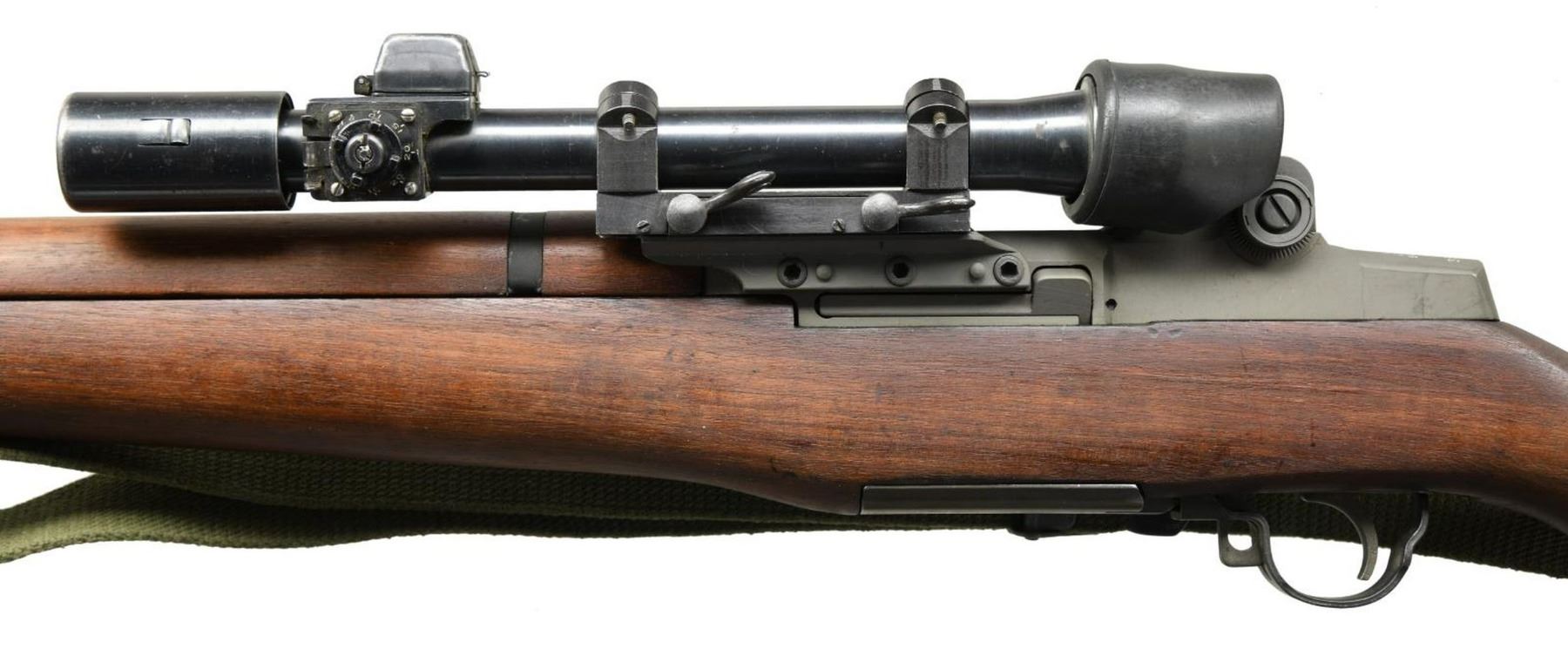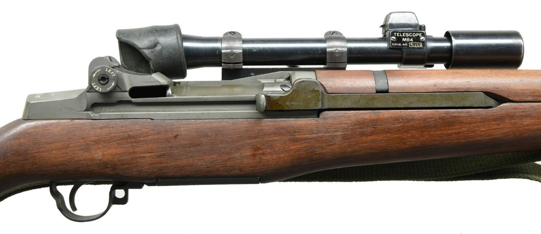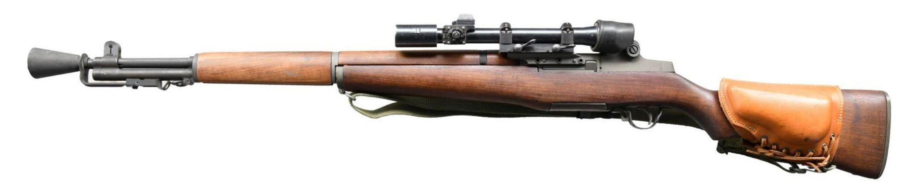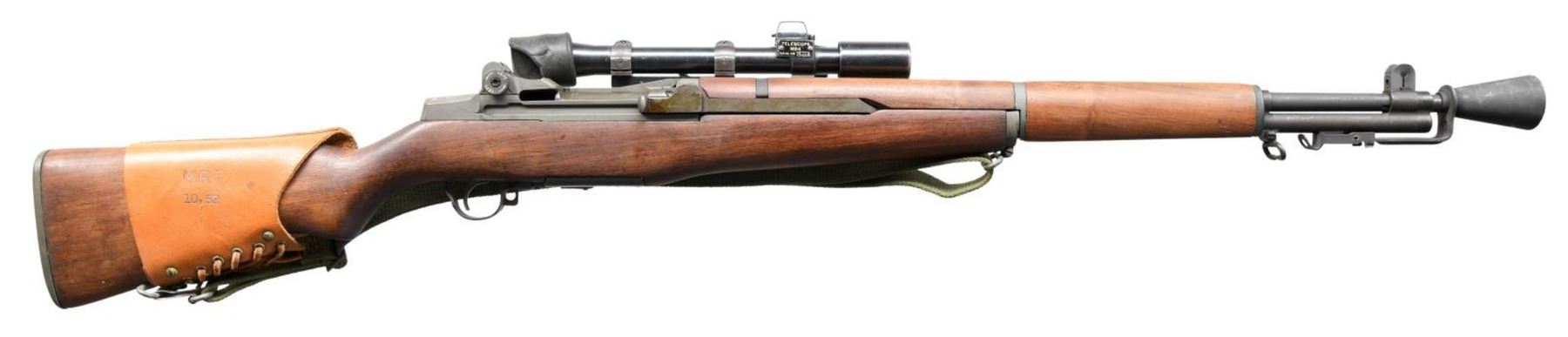 MILITARY RIFLE. Cal.30-06. S# 3512315. Bbl. 24" marked on right side only w/ partial "WP" in oval. Throat & muzzle gauge 3.0. "T105E1" Aperture rear sight. Blade front sight w/ protective ears. Rifle is likely assembled using a receiver which was originally fitted w/ a M1C Griffin & Howe base which is serial numbered to match the rifle. The base shows evidence that it has been removed from the rifle & the screws re staked. The M84 telescope has been installed using a blued steel reproduction slide which is unmarked. The M84 telescope S# "40358" has a post & crosshair reticle plus features a correct rubber eye cup & sliding metal sunshade. The square hinged cover for the windage knob is not present. All major rifle components are marked "SA". Walnut stock set. Buttstock has been given an arsenal rework type finish. Hand guards appear to be replacements. Buttstock is fitted w/ a leather lace on cheek pad which is additionally fastened w/ rnd. head brass screws. Pad is marked "MRT 10-52". Green web sling. UNATTACHED ACCESSORIES: cone type flash hider marked "HIDER FLASH M2 B HART MFG CO.". Cleaning kit & plastic oiler in butt. CONDITION: stock set has light wear, staining & handling marks. Buttstock has several flecks of white paint. Metal has arsenal rework type parkerization w/ very light wear & handling marks. Receiver markings are enhanced w/ white. Scope has a lg. percentage of original blue finish w/ scattered spots of oxidation. Optics appear slightly cloudy but serviceable. Scope has several lens spots. Bore is shiny w/ sharp rifling. PROVANANCE: from the Estate Collection of Thomas J. Mulligan. (23-1243/RW). CURIO. $2,000-3,000.