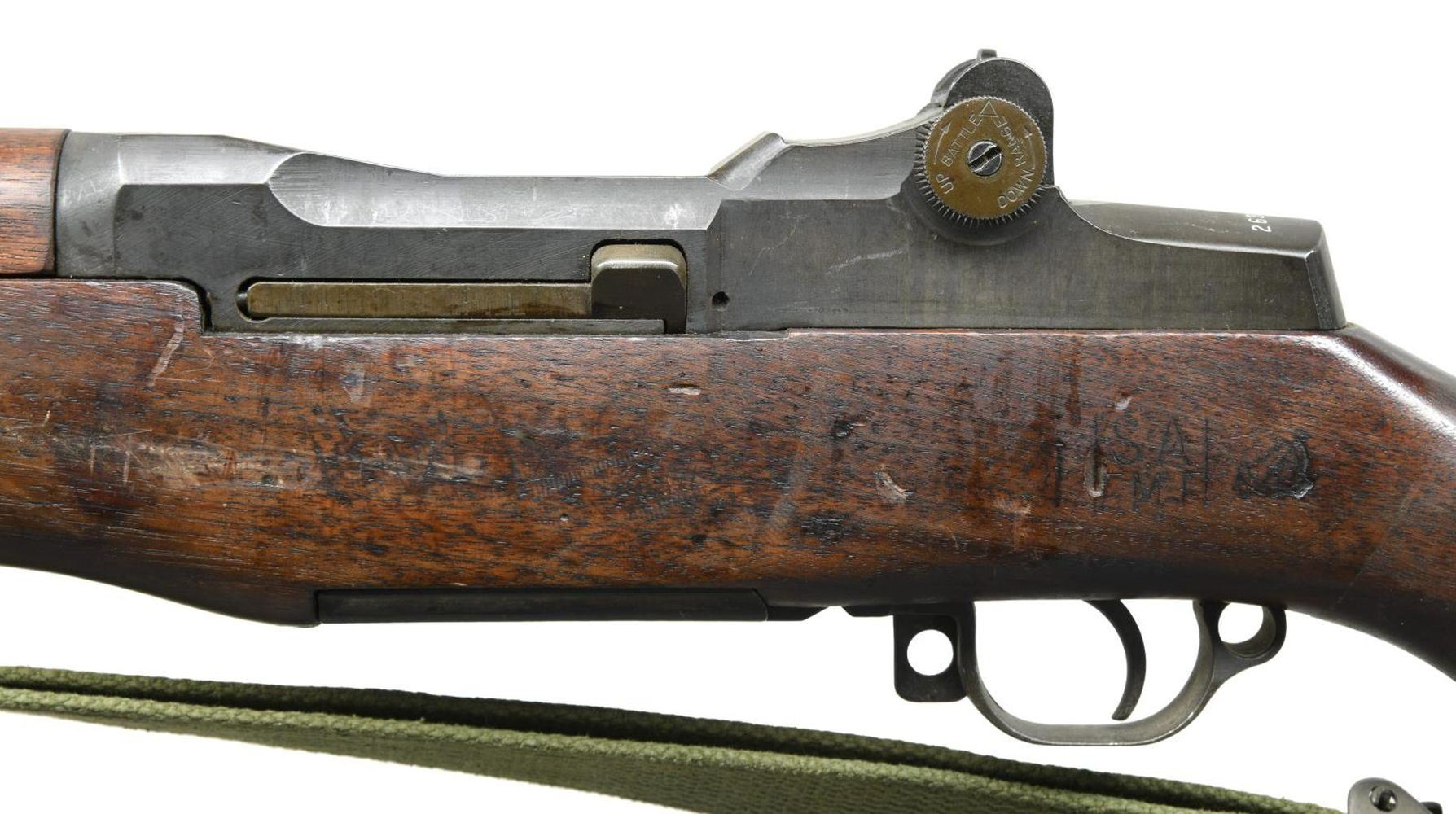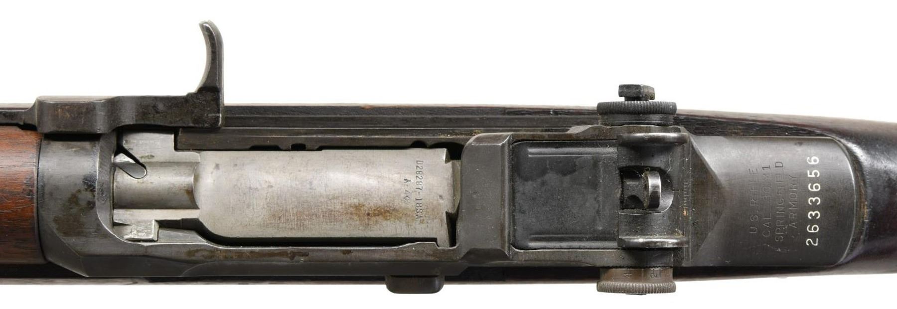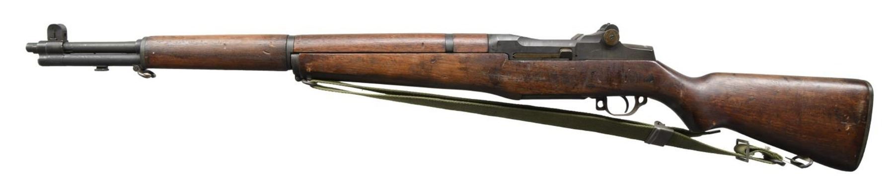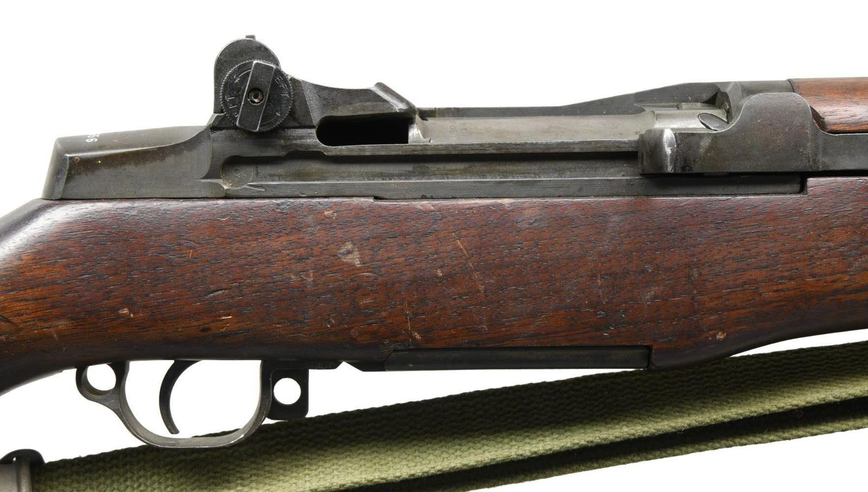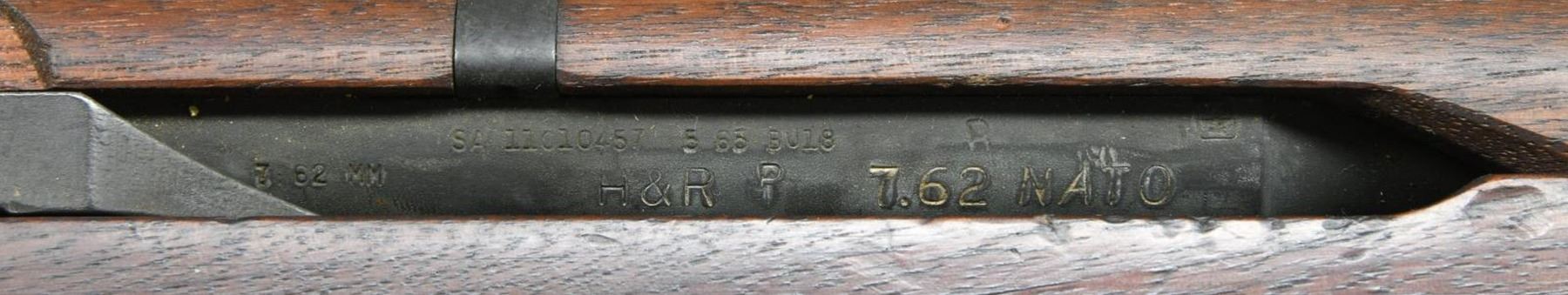 SPRINGFIELD M1 GARAND SEMI-AUTO MILITARY RIFLE. Cal. 7.62 Nato. S# 2633656. Bbl. 24" marked on right side "SA 110104575 66 BU18". Stamped "7.62MM". Additionally stamped w/ "H & R P 7.62 NATO DEFENCE ACCEPTANCE EAGLE". These rifles were rebarreled in the years 1965-66 by "AMF" & "H&R" to the 7.62 Nato cartridge using standard M1 Garand rifles. The rifles were then given the designation "U.S. Rifle Navy MKII Mod 1 Cal. 7.62MM." The muzzle gauges 1.0. "Locking Bar" Aperture rear sight w/ battle range elevation knob. Blade front sight w/ protective ears. All major parts markings are "SA". Milled trigger guard. Walnut stock set. Buttstock is marked on left side over trigger guard w/ faint boxed "SA E. McF." crossed cannons. Partial encircled "P" proof under grip. "27" rack no. at heel & tiny crossed cannons at end of grip. Green webs sling. CONDITION: stock set has well worn original finish w/ staining & handling marks throughout. Metal has arsenal rework dark parkerized finish w/ moderate wear & thinning. S# enhanced w/ white. Near excellent shiny bore. PROVANANCE: from the estate collection of Thomas J. Mulligan. (23-1197/RW). CURIO. $1,000-1,500.