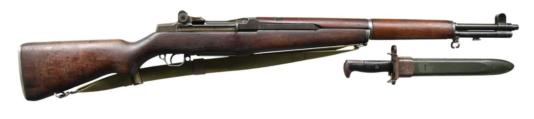 RIFLE. Cal. 30-06. S# 2301925. Bbl. 24" marked on right side w/ partial "WP" proof. Throat & muzzle gauge 1.0. T105E1 aperture rear sight w/ replacement cover. Blade front sight w/ protective ears. All major parts markings are "SA" except bolt which is "HRA". Milled trigger guard. Walnut stock set. Buttstock is marked on left side over trigger guard w/ partial defense acceptance mark & marked under grip w/ faint encircled "P". Green web WWII era sling. Date appears to be "1944". UNATTACHED ACCESSORIES: 10" fullered blade bayonet. Blade was shortened from 16" Model. Marked on left ricasso upper case "PAL" in oval "US" w/ flaming bomb & "1943". Grooved composite grips. Green plastic scabbard. Metal throat marked with "US" in flaming bomb. Bayonet has been sharpened. Blade turning gray & patina. Balance of metal turned patina. Grips have heavy wear & handling marks. Scabbard over painted green w/ wear & flaking. 4 - 8 rd. clips. CONDITION: replacement stock has well worn finish w/ staining & handling marks throughout. Buttstock has crack on left side approx. 3" long from trigger guard to behind grip. Stock has added bedding compound showing hobbyist gunsmith type workmanship. Metal has 75% worn original finish w/ scattered handling marks. Good shiny bore w/ strong lands. (23-1398/RW). CURIO. $1,200-1,800.