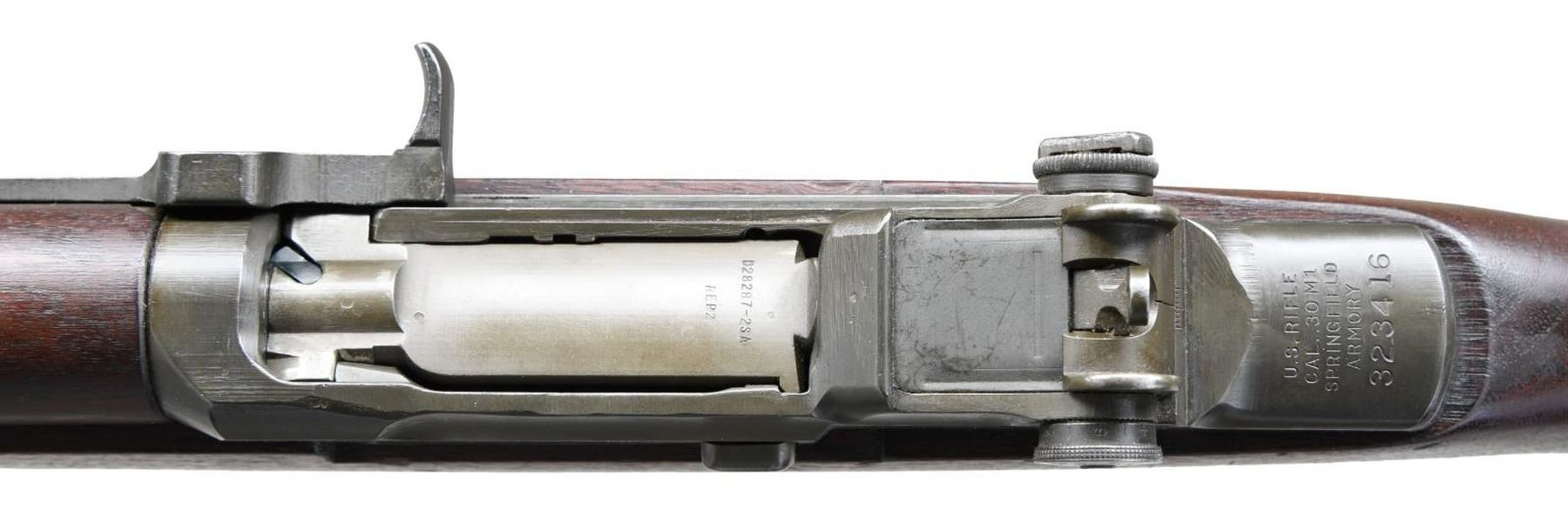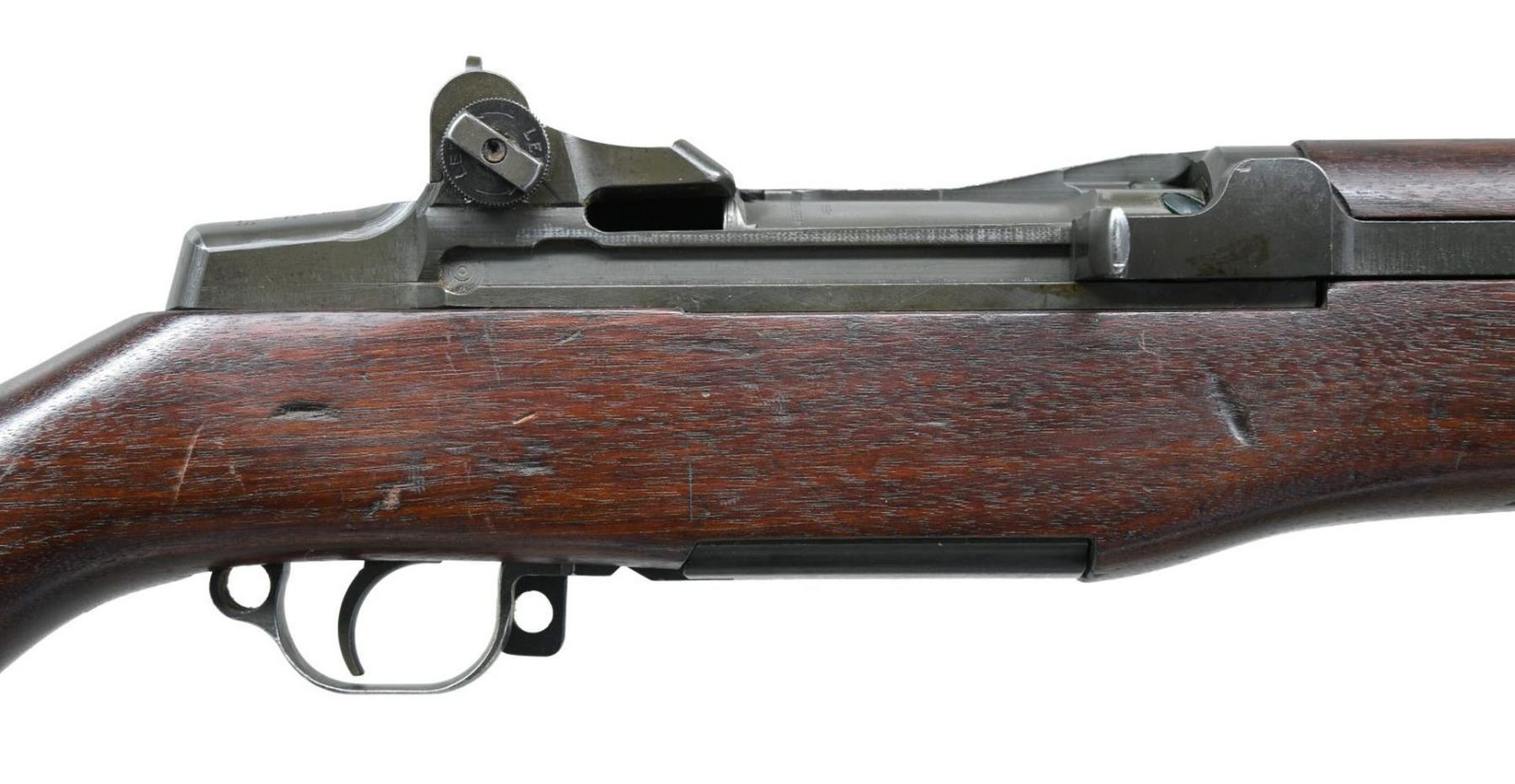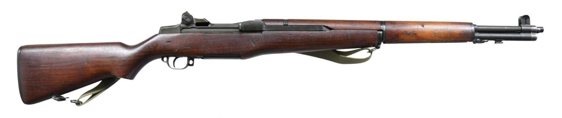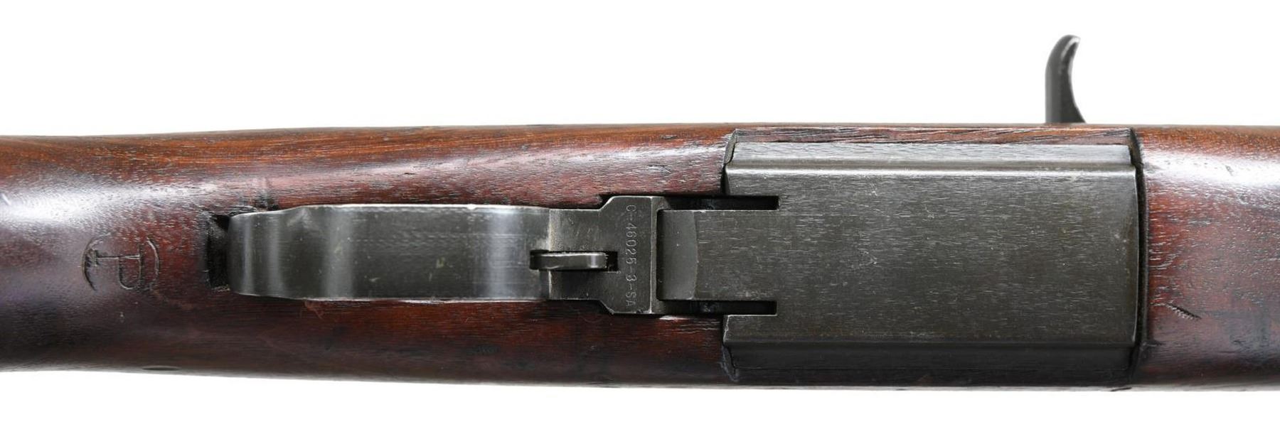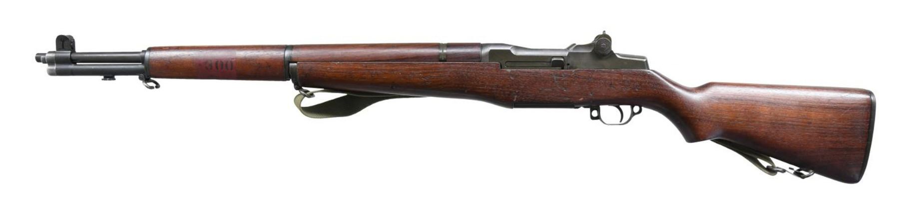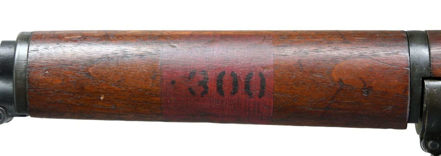 LEASE SEMI-AUTO MILITARY RIFLE. Cal. 30-06. S# 323416. Bbl. 24". Bbl. markings are inverted on left side & include "S-A 8-41" plus "5". Bbl. has the Birmingham Nitro proof export markings on top in front of gas cyl. ring. Throat & muzzle gauges 1.0. On March 27, 1941, Garand rifles were authorized to be shipped to Great Britain under the Lend/Lease Act along w/ a second appropriation on Oct 27th of that year resulting in a total of approx. 38,000 rifles supplied to G. Britain until deliveries were halted in June, 1942 due to the shortage of these rifles needed to arm US troops. The rifles were slightly modified by the addition of a red band around or in the case of this rifle on the left side of the forend w/ the stenciled marking either ".30 or .300" w/ or w/out the periods. This example has the 300 w/ the period. The reason for this was to prevent confusion of ammunition types between the U.S. rimless .30 caliber & the British 303 cal. which used a rimmed case. The rifles apparently saw little or no use during the war except by the Home guard & other security forces. At the end of the war some of these rifles were sold to Am. Arms dealers & in order to leave Great Britain they were given commercial export proofs. This example has the crown over "BNP" indicating the Birmingham proof & is also marked "8 tons per". There are also a crossed swords marking w/ "LB 2". The crown "NP" appears on top of the receiver ring. The operating rod & bolt lugs are unmarked. Locking bar rear sight w/ battle range elevation knob. Blade front sight w/ protective ears. Front sight screw retains its original protective seal. Operating rod, trigger housing w/ milled trigger guard, hammer & safety all marked "SA". Gas cyl. marked "S" behind stacking swivel. Unmarked single slot gas cyl. lock screw. Walnut stock set, buttstock correctly marked on left side w/ boxed "S.A. & GHS" plus crossed cannons. Circle "P" proof under grip. Front handguard has dark red painted rectangle enclosing black stenciled .300. Green web sling dated, "1944". UNATTACHED ACCESSORIES: buttstock contains plastic oiler & grease container. Two cleaning rod sections, cleaning rod tip & handle. White plastic muzzle & front sight protector. CONDITION: stock set has original finish w/ a good appearance. Stock has scattered handing marks throughout. Handguards have moderate wear & handling marks. Additional marking on handguard has light wear but remains legible. Metal retains 70% original parkerized finish w/ light wear & scatter handling marks. Gas cyl. lock has notable loss of finish. Bore has sharp lands & generally shiny appearance w/ light frosting toward the muzzle & the bbl. PROVANANCE: from the estate collection of Thomas J. Mulligan. (23-1209/RW). CURIO. $1,000-1,500.
