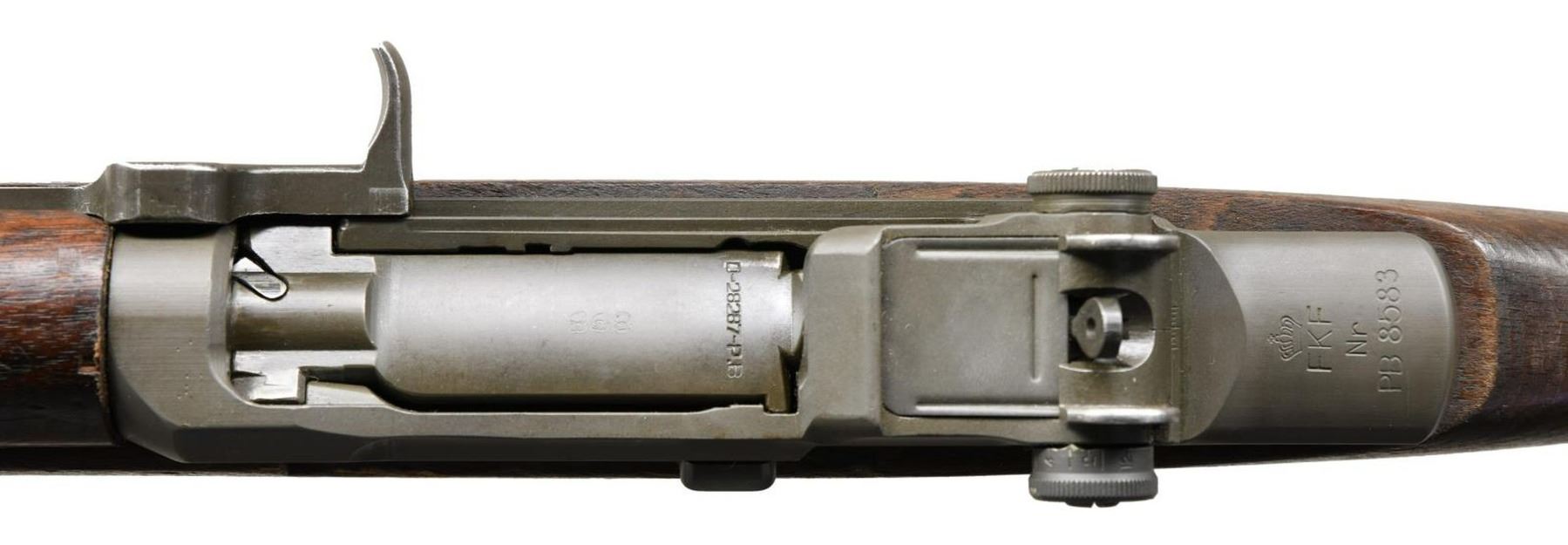Cal. 30-06. S# PB8583. Bbl. 24" marked "RSC 1955" & "PK". Blade front sight marked "PB". Aperture rear sight marked "PB" on all components. Op rod follower, trigger housing, safety, hammer, gas cyl. plug, follower, front sling base, clip latch & bolt are all "PB" marked for Beretta. Bolt has electro pencil number that appears to read "898". Top of gas cyl. marked "BMB" for Breda. Op rod & balance of other parts appear unmarked. Top of receiver marked w/ crown, Danish FKF marking & serial. Left side of receiver has Beretta markings. Beech stock & walnut handguards. Bottom mounted sling swivels w/ GI style canvas sling. Underside of butt is matching numbered to receiver. UNATTACHED ACCESSORIES: clear plastic muzzle cover. CONDITION: stock set shows scattered dings & handling wear. Metal retains 70% arsenal parkerized finish w/ notable silvering on the front end & scattered edge wear. Fair bore w/ scattered frosting but strong rifling. PROVENANCE: From the estate collection of Thomas J. Mulligan. (23-1195/MJC). CURIO. $1000-1500.