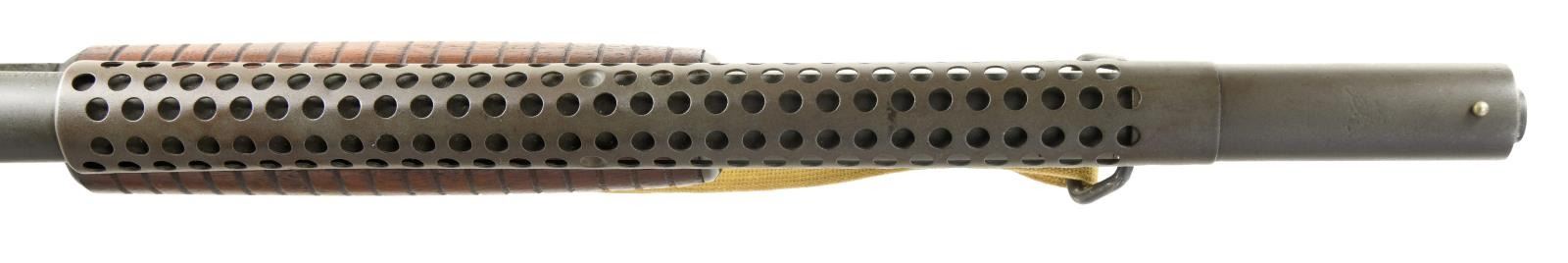 SHOTGUN. Cal. 12 ga. 2 3/4". S#. 958630. BBL. 21" Cyl bore with bayonet lug & 6 row handguard. Parkerized finish. Left side of frame is marked "U.S." with the flaming bomb. Small round grooved forend & replacement pistol grip stock with original buttplate is stamped "RIA" on left side. Web sling on original swivels. CONDITION: Over 90% parkerizing. Refinished wood shows handling marks & small chips. Very good bright bore. Trigger will release before the action is closed & must be repaired to be safe to fire. PROVANANCE: From Estate Collection of Thomas J. Mulligan. (23-1250/DS). CURIO. $1500-2250.