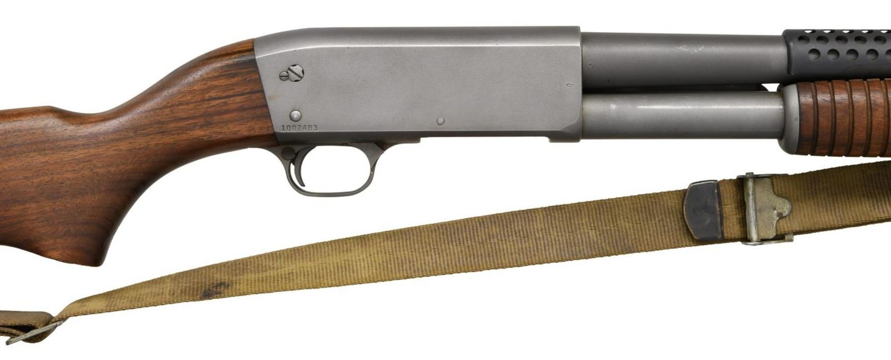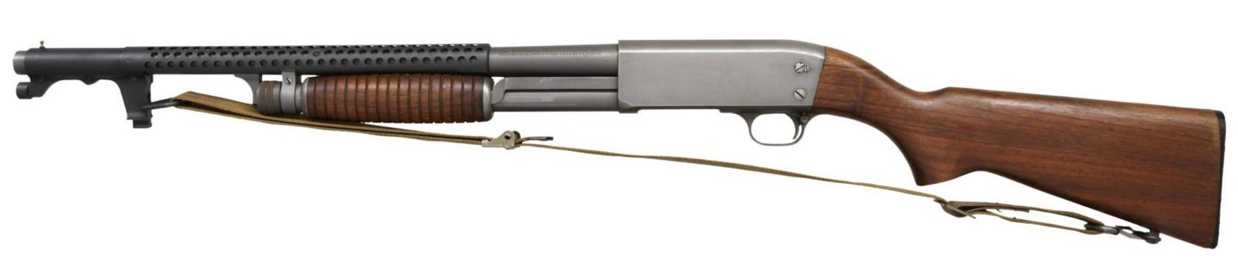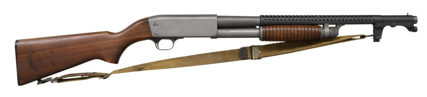 Cal. 12 ga. 2 3/4". S# 1007483. The M&P was a commercial law enforcement continuation of the WWII military shotguns. Bbl. 20" with unusual MOD choke. 5 round mag. Parkerized finish. Non engraved "Business Gun" action. Fitted with optional M1917 bayonet lug & 6 row handguard. Small grooved forend & uncheckered pistol grip stock with plastic buttplate. Bottom of pistol grip has a circular tag marked "4". Canvas sling on factory swivels. CONDITION:. 90% lightly faded parkerized finish showing edge & carry wear. Wood finish shows wear & spots of darkening. Very good bright bore. PROVENANCE: From the estate collection of Thomas J. Mulligan. (23-1251/DS). CURIO. $500-750.