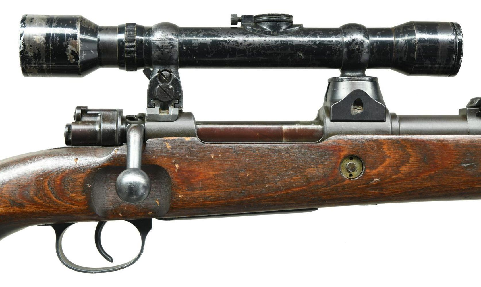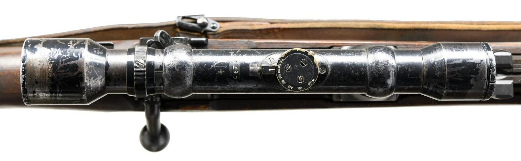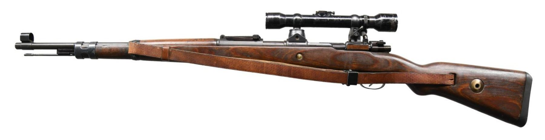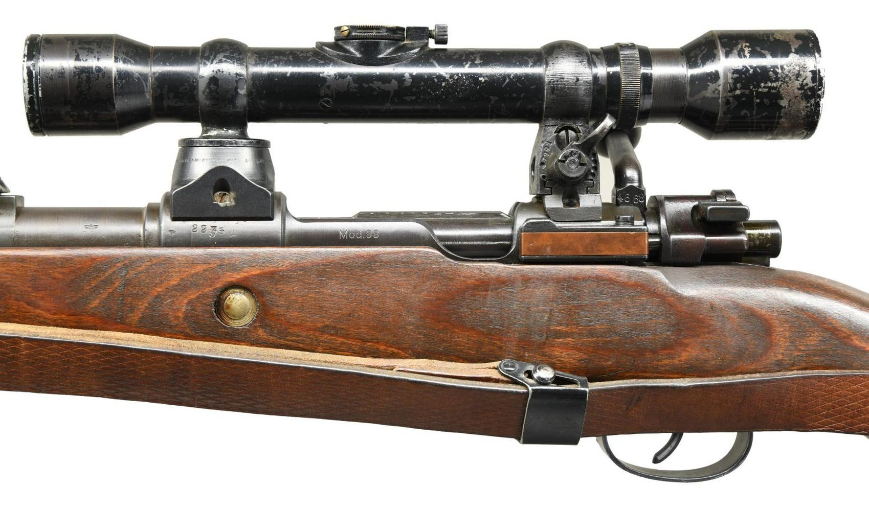 SNIPER RIFLE. Cal. 8mm Mauser. S# 2235d. Bbl. 24". Post war assembled K98k turret sniper rifle. Mismatched numbers throughout. Unnumbered bbl. Blade front sight w/ repro hood. Tangent rear sight graduated to 2000m. Safety is the correct shortened type but it is mismatched. Front left of receiver ring appears to be marked w/ eagle "37" Waffenamt indicating this rifle was made by JP Sauer. Given the location of this marking it is possible the receiver itself was indeed part of a legitimate Sauer high turret sniper rifle. Rifle is equipped w/ a 4x power unmarked German style scope on post war turret mounts. Scope is numbered "42908" but lacks a maker's marking. Scope has a post reticle w/ optics that have a green tint. Scope body & rings show scattered flaking enamel. Laminated stock set w/ left side sling provisions & repro sling. Cleaning rod present. CONDITION: stock set appears lightly sanded w/ added finish, a few laminate cracks on butt, a few dings & handling marks. Metal has a dull gray arsenal rework type finish w/ some tool marks on bands, light oxidation on bottom metal, scattered silvering & a few light dings. Bore shows scattered oxidation & strong rifling but may clean up better. (23-2617/MJC). CURIO. $3500-5000.
