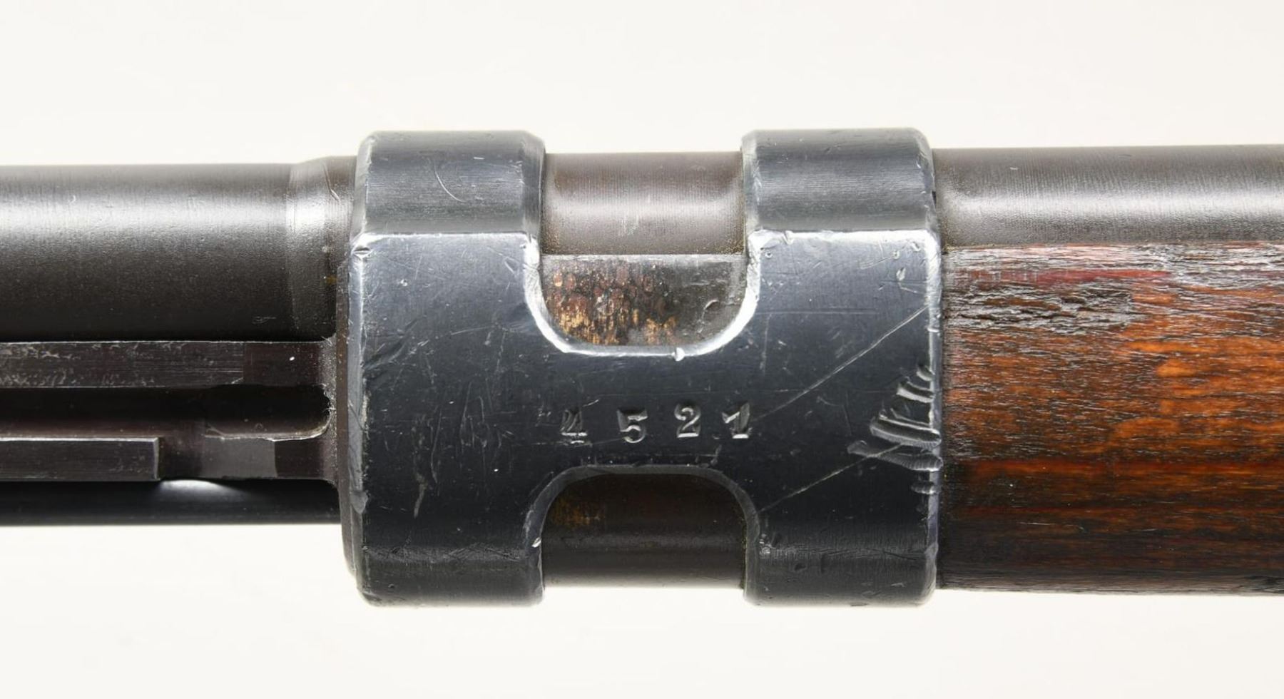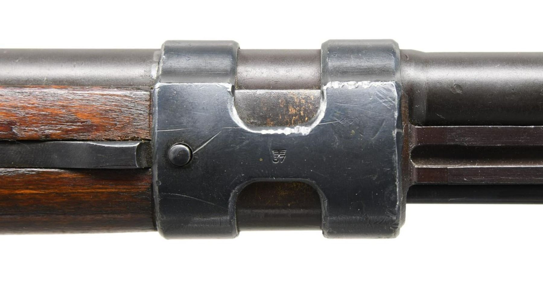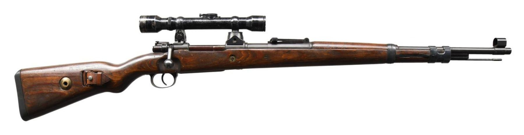 SNIPER RIFLE. Cal. 8mm Mauser. S# 2235d. Bbl. 24". Post war assembled K98k turret sniper rifle. Mismatched numbers throughout. Unnumbered bbl. Blade front sight w/ repro hood. Tangent rear sight graduated to 2000m. Safety is the correct shortened type but it is mismatched. Front left of receiver ring appears to be marked w/ eagle "37" Waffenamt indicating this rifle was made by JP Sauer. Given the location of this marking it is possible the receiver itself was indeed part of a legitimate Sauer high turret sniper rifle. Rifle is equipped w/ a 4x power unmarked German style scope on post war turret mounts. Scope is numbered "42908" but lacks a maker's marking. Scope has a post reticle w/ optics that have a green tint. Scope body & rings show scattered flaking enamel. Laminated stock set w/ left side sling provisions & repro sling. Cleaning rod present. CONDITION: stock set appears lightly sanded w/ added finish, a few laminate cracks on butt, a few dings & handling marks. Metal has a dull gray arsenal rework type finish w/ some tool marks on bands, light oxidation on bottom metal, scattered silvering & a few light dings. Bore shows scattered oxidation & strong rifling but may clean up better. (23-2617/MJC). CURIO. $3500-5000.