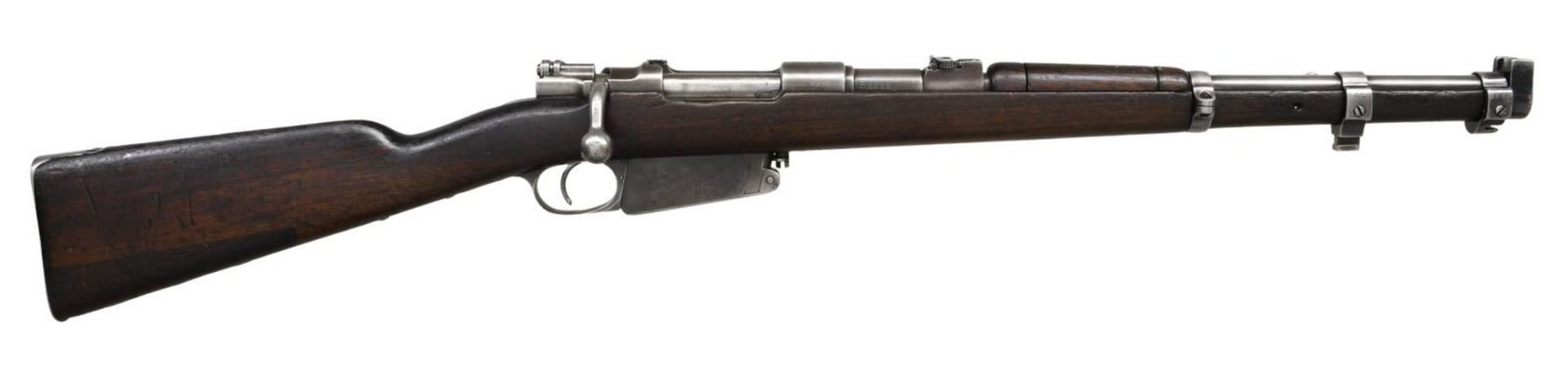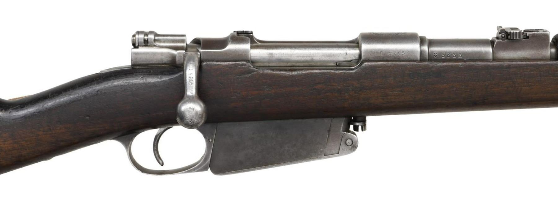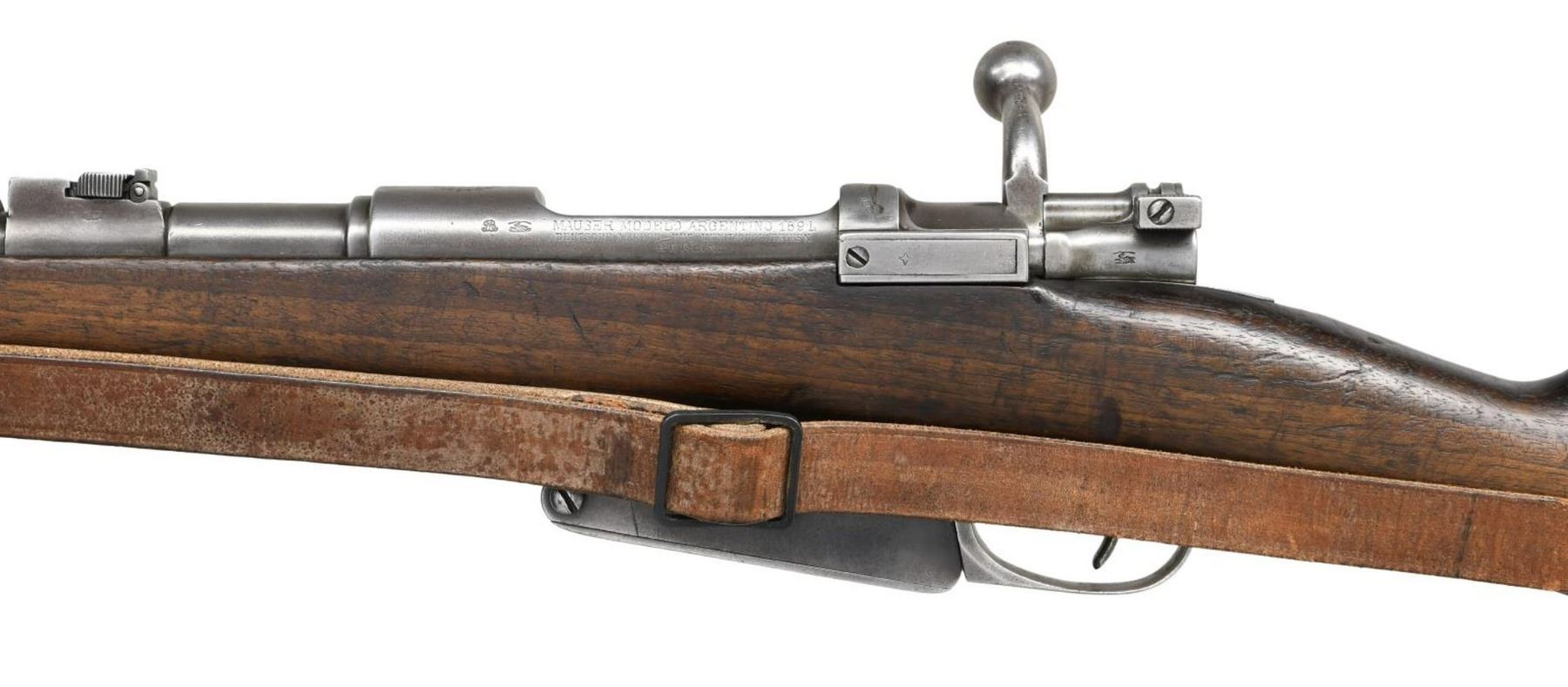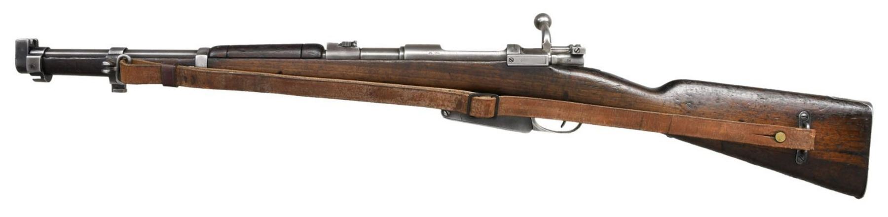 Cal. 7.65 Arg. S# C5265. Bbl. 17 3/4". Matching numbers on bolt, rear band, bbl & floorplate. Front band is numbered "256", stock number is faint & rear sight appears mismatched. Top of receiver marked w/ Argentine crest. Left side of receiver has DWM & Argentine markings. Ladder rear sight graduated to 1400m. Blade front sight w/ protective ears. Two bands w/ bayonet lug for Rolling Block bayonet. Walnut stock set w/ left side sling swivels. Saddle bar behind trigger guard has been filled in w/ arsenal added steel filler & two screws. Leather sling present. CONDTION: arsenal reworked stock set has a large armorer repair at bottom of butt, a tight crack behind upper tang, a crack at front of handguard, scattered dings & handling marks. Metal is a silvery gray patina w/ some spots of light pitting & oxidation. Worn bore w/ scattered frosting & pitting. (23-1932/MJC). CURIO. $400-700.