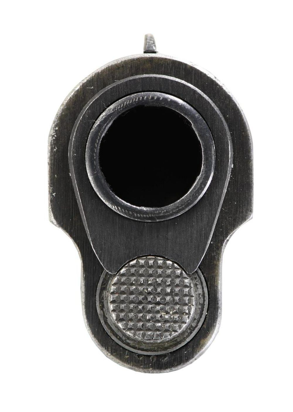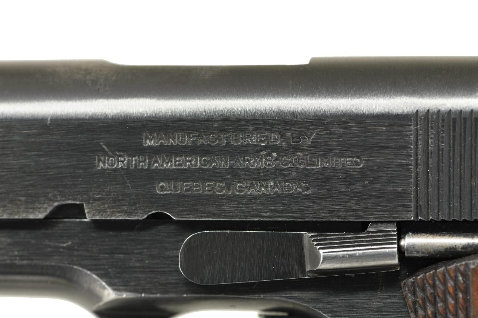 PISTOL. S# 6. Cal. 45 ACP. North American Arms of Quebec, Canada was awarded a contract with the US Ordnance Department to produce 500,000 model 1911 pistols for the US military during WWI on July 1, 1918. The pistols were to be manufactured in the former Ross Rifle factory that was leased by North American Arms Company for an 18-month period starting September 1, 1918. The US agreed to provide raw materials for the production of the pistols to North American Arms. The expectation set forth by the contract was to deduct the expense for raw materials from the invoices of the completed pistols. The US also contracted with North American to produce spare parts for the pistols. There was concern from the Ordnance Departments engineers regarding the capabilities of the company to produce the quite complicated pistol due to the rather dated methods and machinery utilized by the Canadian manufacturing plant. These complications proved to be a rather difficult hurdle for the company, and the requirement set forth for 100% interchangeability of the pistols’ parts with other manufacturers products, was one that the company was never able to achieve. On Dec. 4, 1918, the contract for North American Arms to produce the pistols was suspended, ending the production of the pistols before any deliveries were made. There were only about 100 pistols that were completed during the time that the company was tooling up for production or, as some believe, from parts that the company competed that the firm assembled after the contract was suspended. When the cancelled contract was settled between the US government and North American Arms, a small amount of partially finished parts was reclaimed by the Ordnance Salvage Board and later destroyed. As Charles Clawson states in his publication, “Colt .45 Service Pistols – Models of 1911 and 1911A1” pg. 204, “The pistols are a bit crude, showing some hand fitting, but are good functioning weapons” There are some distinct differences between a pre-production toolroom North American pistol and a production Colt 1911. The North American pistols, such as this example, have a wide, long spur uncheckered hammer, an ejection port cut out that terminates on the flat facet of the slide, a “rounded” barrel bushing, and a serial/assembly number that is found on the slide, frame, & trigger. North American pistols were also produced with a main spring housing that has no provisions for a lanyard loop; however, this example has a Colt main spring housing that has a provision for a lanyard ring. The barrel is unmarked. Consignor notes that some Colt parts were possibly used by North American to finish pistols. These pistols were never submitted for inspection and carry no proof markings. The pistol is fitted with 13-line, double diamond walnut grips. The slide stop is serrated and the safety lock is checkered. MAGS: (1) unmarked, two tone 7 rd. CONDITION: Metal surfaces exhibit a coarse polish with a “black army” type, blued finish that has wear located in carry and holster rub locations. The bare metal shows little to no signs of oxidation which is rather remarkable given the age of this pistol. As Clawson notated in his book, the fit between the slide and the frame of this example shows a hand fit or cruder tolerance level than one would find on Colt or other 1911 production-run pistol. Grips are very good with some relatively minor handling marks. Very good bore that shows some light frosting. Mechanically fine; however, on occasion, the magazine requires some additional pressure to properly lock in. (23-2627/ZAL). CURIO. $90,000-110,000.