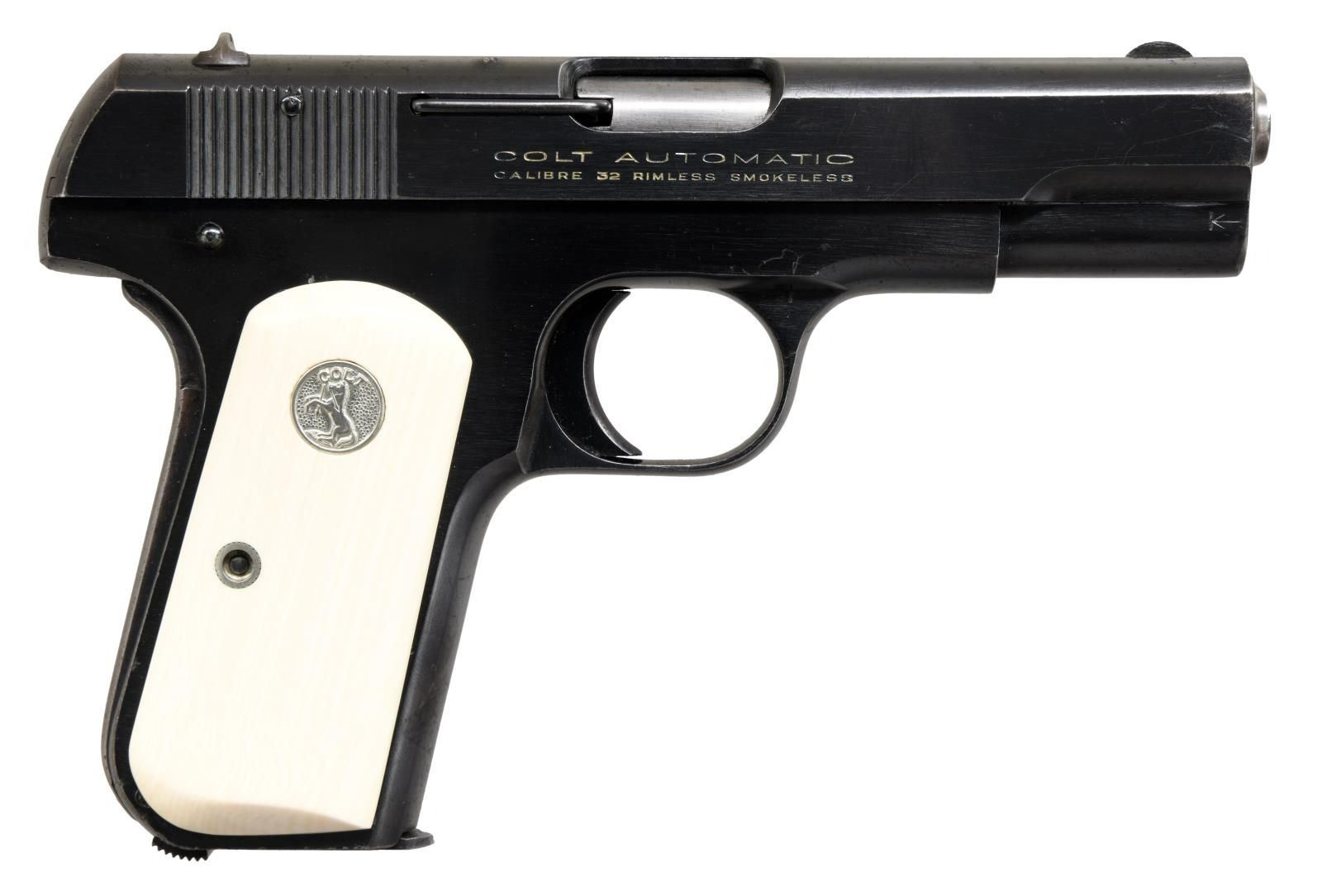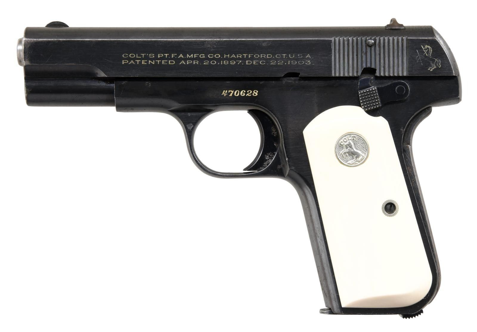Cal. 32 ACP. S# 470628. Bbl 3 3/4". Model 1903 semi-automatic pistol manufactured by Colt in 1927. Left side of slide is stamped with Colt's address and patent information followed by the Rampant Colt logo, with the right side bearing the caliber designation. Address, Rampant Colt log, caliber designation, as well as the serial number have been lightly highlighted with gold colored filler. Metal components exhibit a blued finish, with the frame being mounted with 2 piece Colt silver medallion faux ivory grips. Interior of grips have been modified via the addition of 2 small plastic panels, which stop the grips from spinning when removing them from the frame. MAGS: 1 8 rnd. CONDITION: metal components retain the majority of their original factory blue finish, exhibiting areas of wear and superficial handling marks overall, with some scattered areas of pitting. Bore exhibits consistent mild pitting and strong rifling throughout. Grips are very good overall. (23-1760/MLW). CURIO. $500-800.