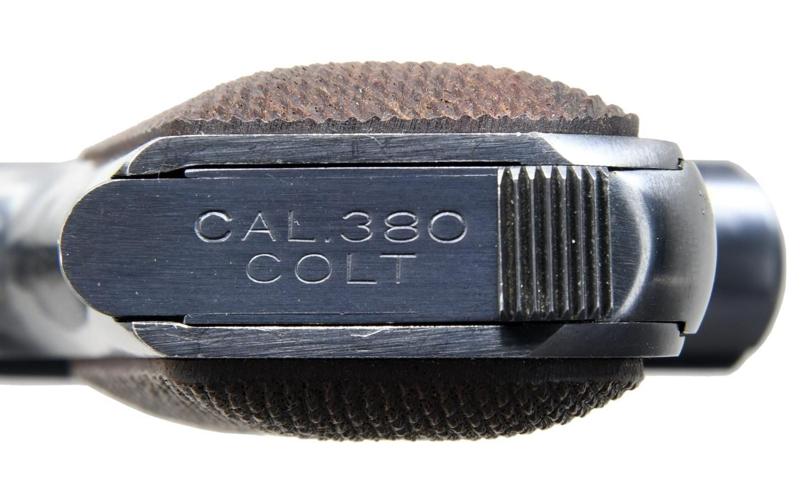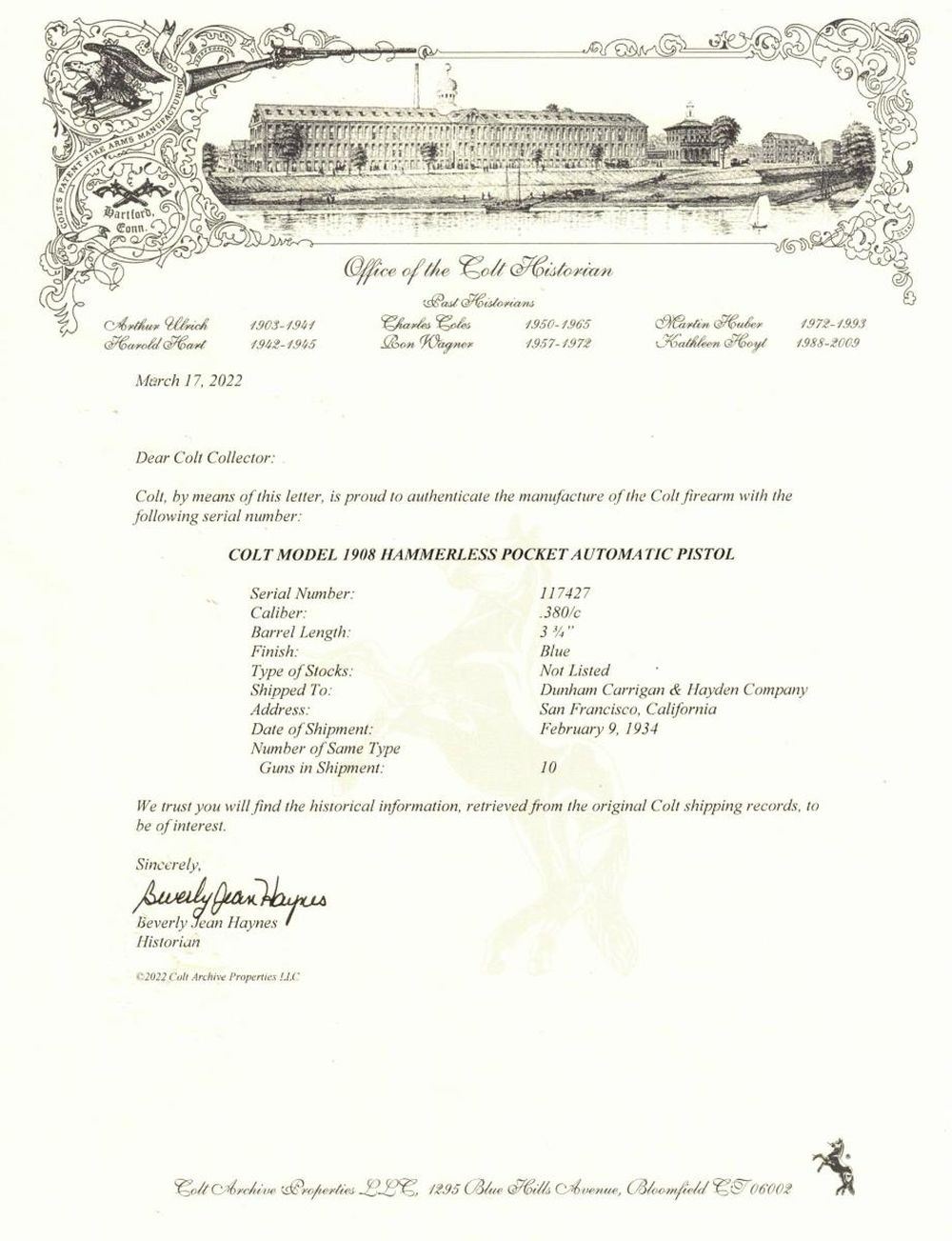 HAMMERLESS SEMI-AUTOMATIC PISTOL WITH FACTORY LETTER. Cal. 380 ACP. S# 117427. Bbl 3 3/4". Model 1908 Pocket Hammerless manufactured by Colt in 1934. The left side of the slide is stamped with Colt's 2 line address followed by the Rampant Colt logo, with the right side being marked "COLT AUTOMATIC/ CALIBRE .380 HAMMERLESS". Metal components exhibit a blued finish, with the frame being mounted with 2 piece Colt silver medallion checkered walnut grips. Frame and slide are matching. MAGS: 1 7 rnd dual-tone magazine. UNATTACHED ACCESSORIES: Colt factory letter indicating that this example was 1 of 10 Model 1908 pistols shipped to Dunham Carrigan & Hayden Company in San Francisco, CA on February 9th of 1934. CONDITION: Extremely fine, with metal components retaining virtually all of their original factory applied blue finish, save for a couple minute spots of extremely light edge wear, a few scattered superficial marks from handling and storage, as well as a small spot of light pitting on the rear of the frame. Barrel shows some light wear, appearing to be from hand cycling of the slide. Brilliant mirror bore, exhibiting well defined rifling throughout. Grips show some mild smoothing, but are otherwise excellent overall. An absolutely stellar 1935 production Colt Model 1908 Pocket Hammerless pistol that one would find near impossible to upgrade from. (23-1752/MLW). CURIO. $1,500-2,000.