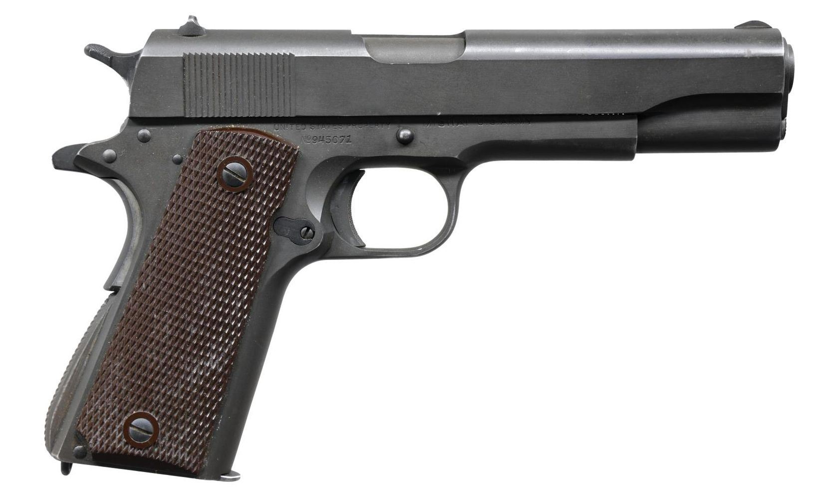 Cal. 45 ACP. S# 945071 (S# range 857,000-1,609,529 mfg. 1943). Correct features include: Type 7 Coltwood stocks, Type B recoil spring guide, Type B slide lock, Type C magazine release lock, Type C safety lock tabs, Type D hammer, Type 3 mainspring, Type 2 Mainspring pin, Type 3 recoil spring plug, grip safety, Type C front sight, & Type C rear sight. Post WWII replacement parkerized 5" bbl. marked "45 AUTO / 7791193" on top, "P' on lug & bottom of bbl., & "SA" on right side of lug. "G.H.D." inspection stamp on frame above clearance cut. MAGS: 1 commercial style 7 rd. mag. marked "45 AUTO" on base w/ parkerized finish. Mag. has fair finish w/ peppery oxidation & light pitting throughout. CONDITION: very good parkerized finish showing sm. spots of wear along edges, in carry areas, cycling friction spots & slide lock wear. Sm. spots of pinprick oxidation on slide & grip area. Very good grips. Very good bore. PROVENANCE: From the estate collection of Thomas J. Mulligan. (23-2209/MD). CURIO. $1,000-2,000.