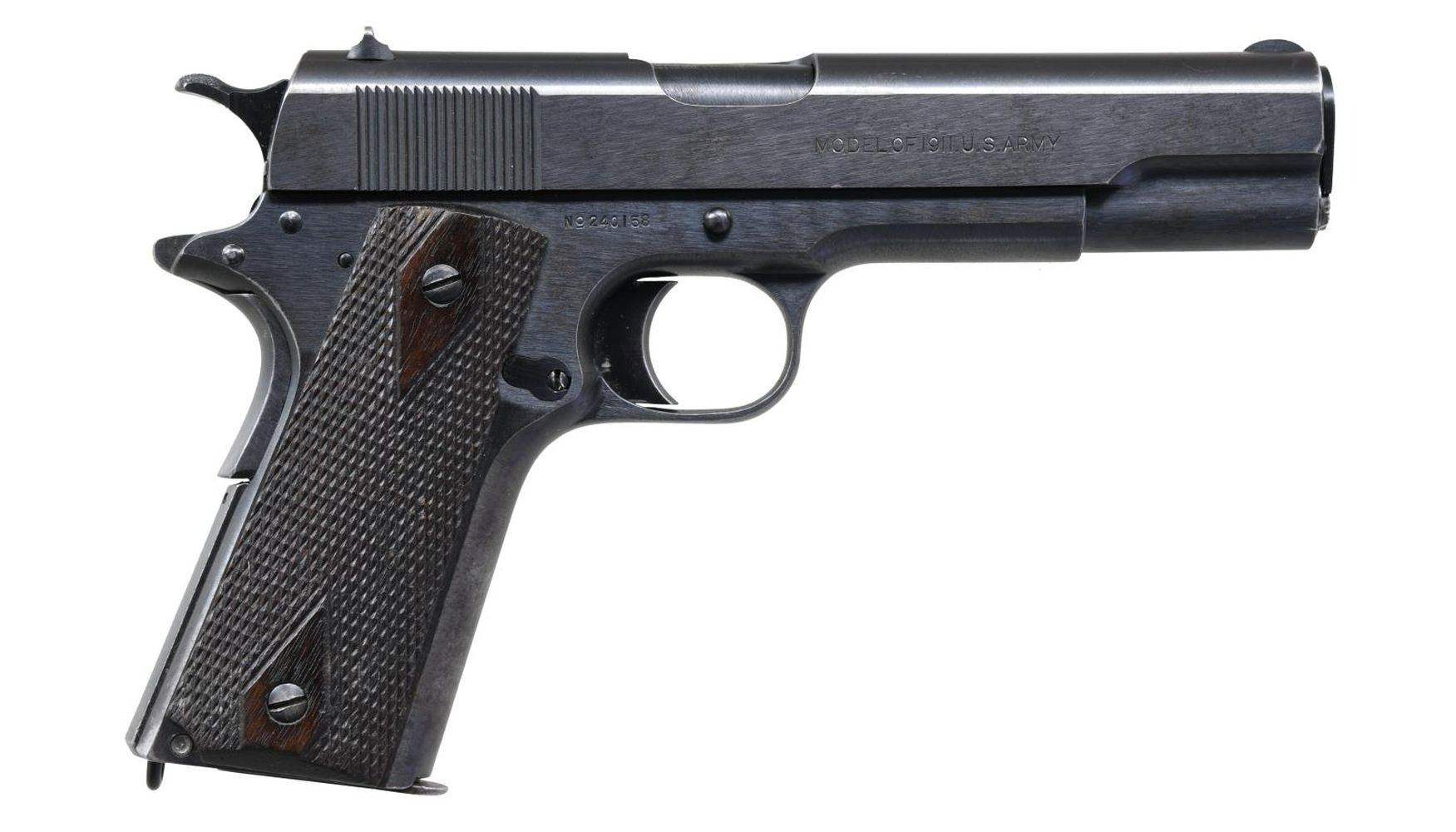 SEMI AUTO PISTOL. PISTOL. Cal. 45 ACP. S# 240158 (S# range 223,601-580,600; 347,000 batch mfg. 1918). Correct features include: 5" Type 4 bbl., Type 1 dbl. diamond checkered walnut stocks, Type B recoil spring guide, Type A slide lock, Type C magazine release lock, Type B safety lock tab, Type C hammer, Type 1 mainspring housing, Type 2 mainspring housing pin, Type A front sight, & Type 3 recoil spring plug, short tang grip safety, & long type trigger. Correct style Type B rear sight has notch expanded to .05" wide. Brush blued finish w/ "JMG" J. M. Gilbert inspector proof & "H" proofs on slide & bbl. MAGS: 1 WWII General Shaver Div. 7 rd. mag w/ good blue fading to silver from wear & scattered spots of pinprick oxidation. CONDITION: very good to near excellent over 90% brush blue finish w/ fading to silver on front strap, light wear from cycling & light edge wear. Scattered spots of patina on top of slide & front strap along w/ light marks on mainspring housing. Stocks in very good to near excellent condition showing scattered flattened diamonds & light marks. Bore has strong lands w/ light frosting in grooves. (23-901/MD). CURIO. $1,800-2,500.
