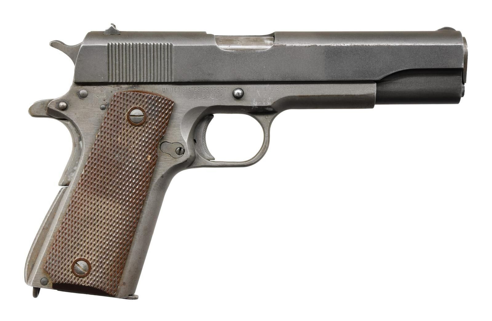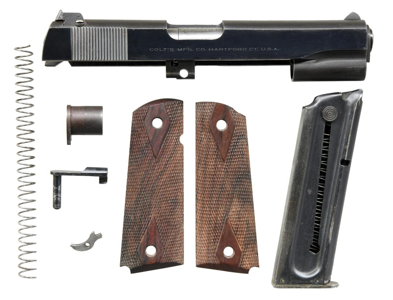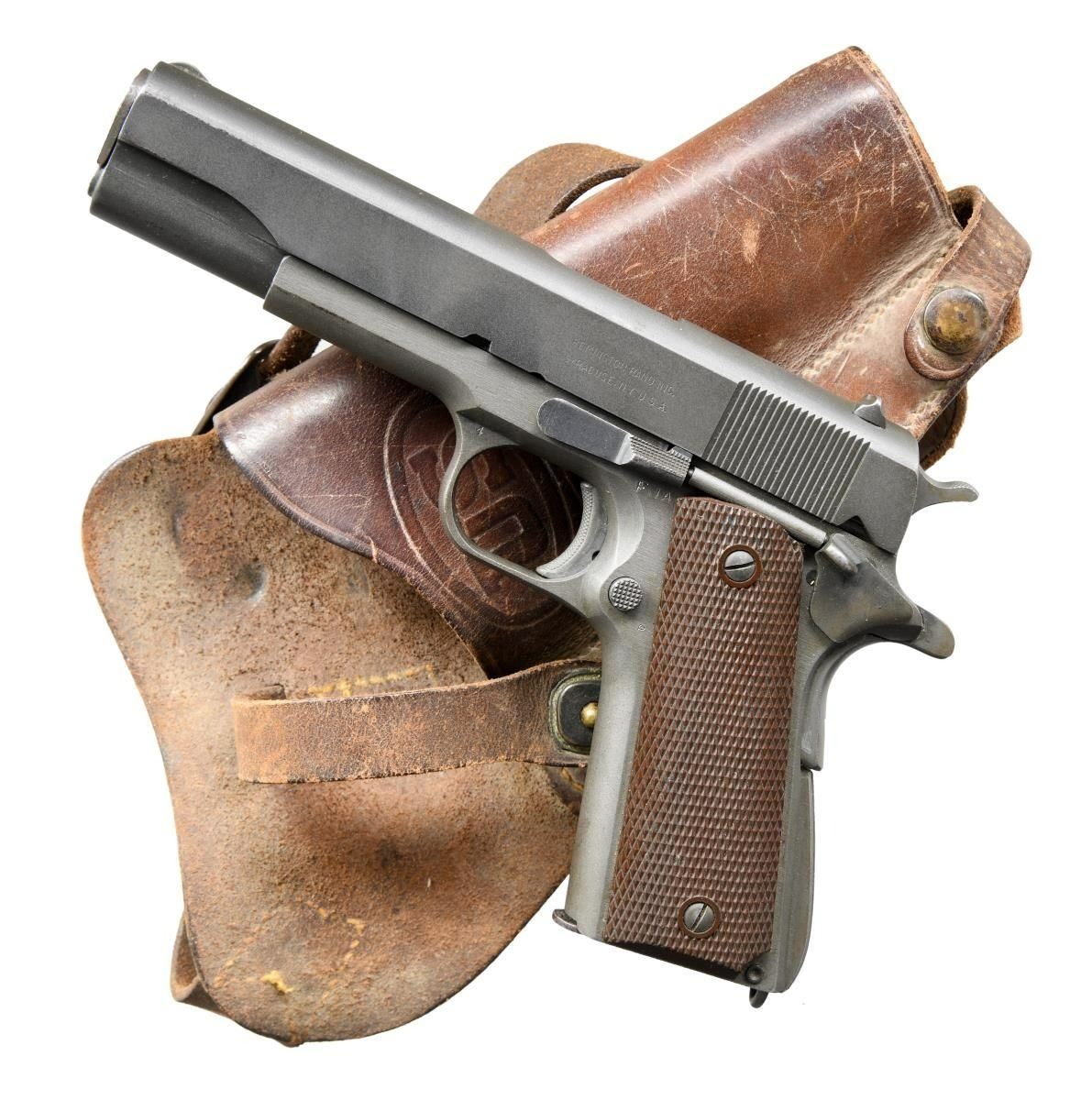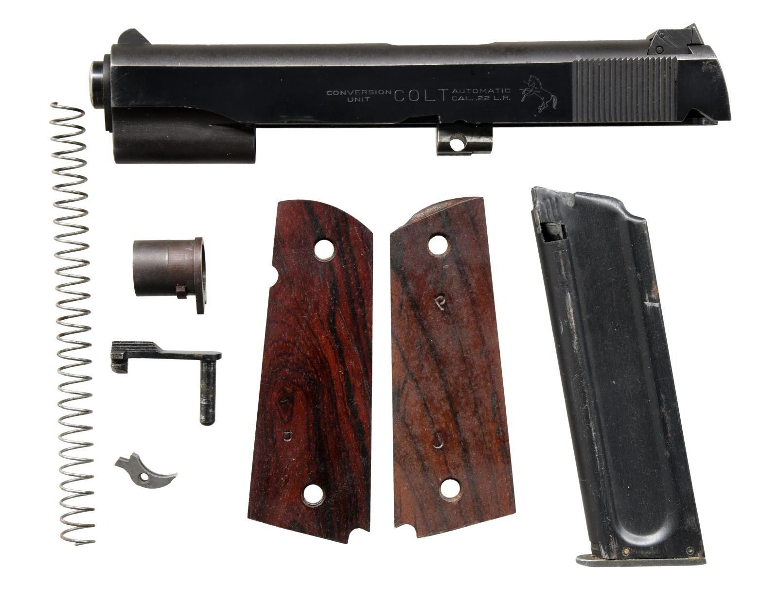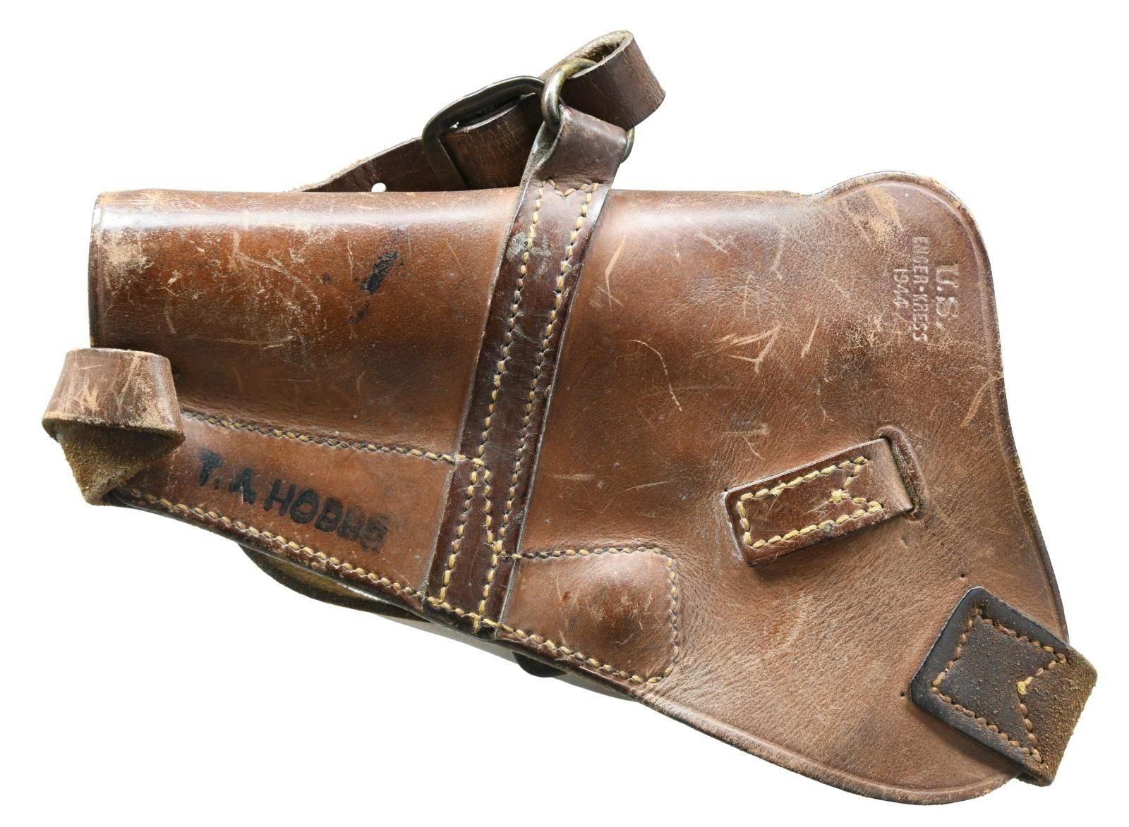 COVERSION UNIT & EXTRAS. Cal. 45 ACP. S# 2425418. Bbl. 5"; correct Type 18 High Standard. Mfg. 1945 for Army contract; one of larger groups supplied at 110,400 units. Per Harrison's reference, all correct parts & features including Keyes Fibre brown plastic grips w/ reinforcing rings around grip screws. Trigger guard markings of "4" at left top front plus right w/ "C" at top front & "H" at bottom rear. Properly parkerized including small parts; blued bbl. MAGS: 2 TOTAL; good WW-I Risdon 2 tone 7 rd. w/ scattered light pitting & oxidation. Very good Colt 10 rd. 22 LR conversion mag. w/ early aluminum follower. UNATTACHED ACCESSORIES: 1949-1955 Conversion Unit (determined by Coltmaster adjustable rear sight). Very good having some faint marks plus light cleaned oxidation along edge of matte top. Stained appearance on bbl. & floating chamber at port area; near excellent bore. Original appearing bbl. bushing plus plum toned aftermarket bushing. Blued slide stop, recoil spring & sear. Missing conversion unit ejector. Near excellent Cocobolo grips of early double diamond checkered military style. Good to very good (solid & complete w/ numerous scuffs & light marks) 1944 dated shoulder holster rig having Lift the Dot snap on retaining strap. Marked w/ "U. S." & "ENGER - KRESS". Bottom rear of back inked "T.A. HOBBS". CONDITION: very good condition w/ frame appearing grey & balance darker finished; appears original. Typical light high point use wear plus light marks in area by joining of trigger guard & frame at right front. Fine row of cleaned faint oxidation on right of slide along line of curved top & side from port to muzzle. Very good to excellent grips having hint of hand wear. Very good bore w/ hint of wear plus extremely faint frosting. (23-4902/NW). CURIO. $1,500-2,000.