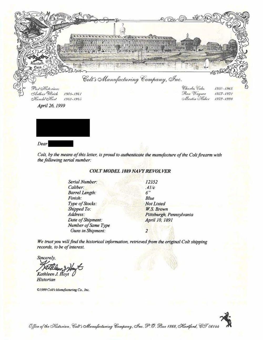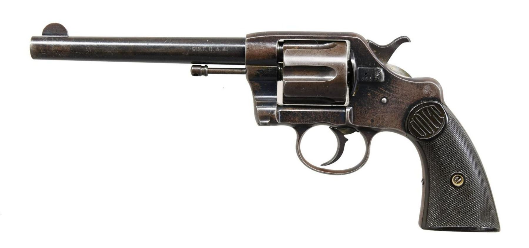 Cal. 41. S# 12352. Standard configuration, 6” barrel with two-line address and patents, “COLT D. A. 41” Stamped on left side. Assembly number “855” found on barrel, cylinder, frame, cylinder catch, and hinged cylinder pin. CONDITION: good to very good overall, revolver is refinished, markings mostly discernible, though address and serial number on barrel or partially obliterated. There are numerous small Dings on the backstrap, but the inscription is still discernible. Mechanically functional, good rifle bore with pitting. PROVENANCE: Ron Ogan, Little John’s Auction, Collection of Horst Kreiner. (01-24018/JS). $800-1,200.