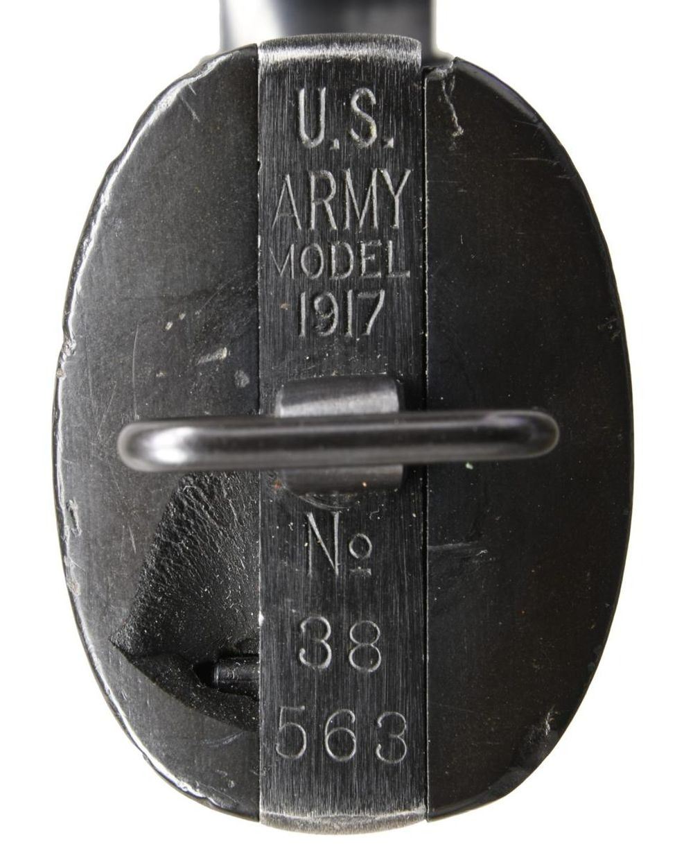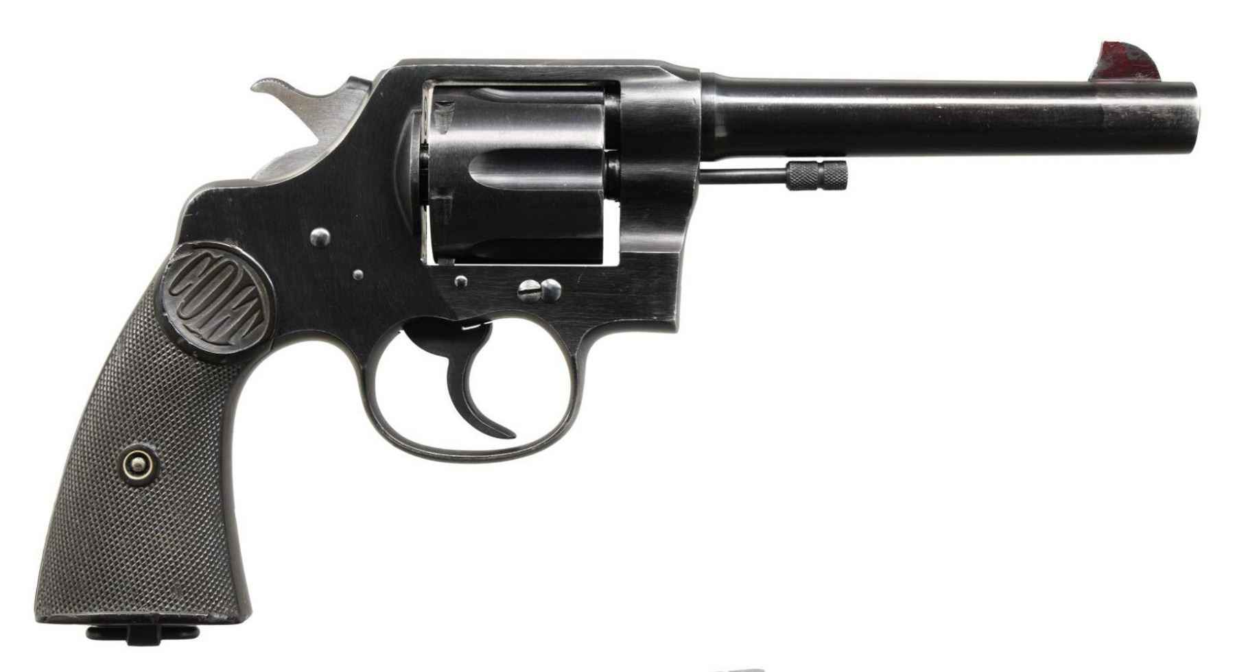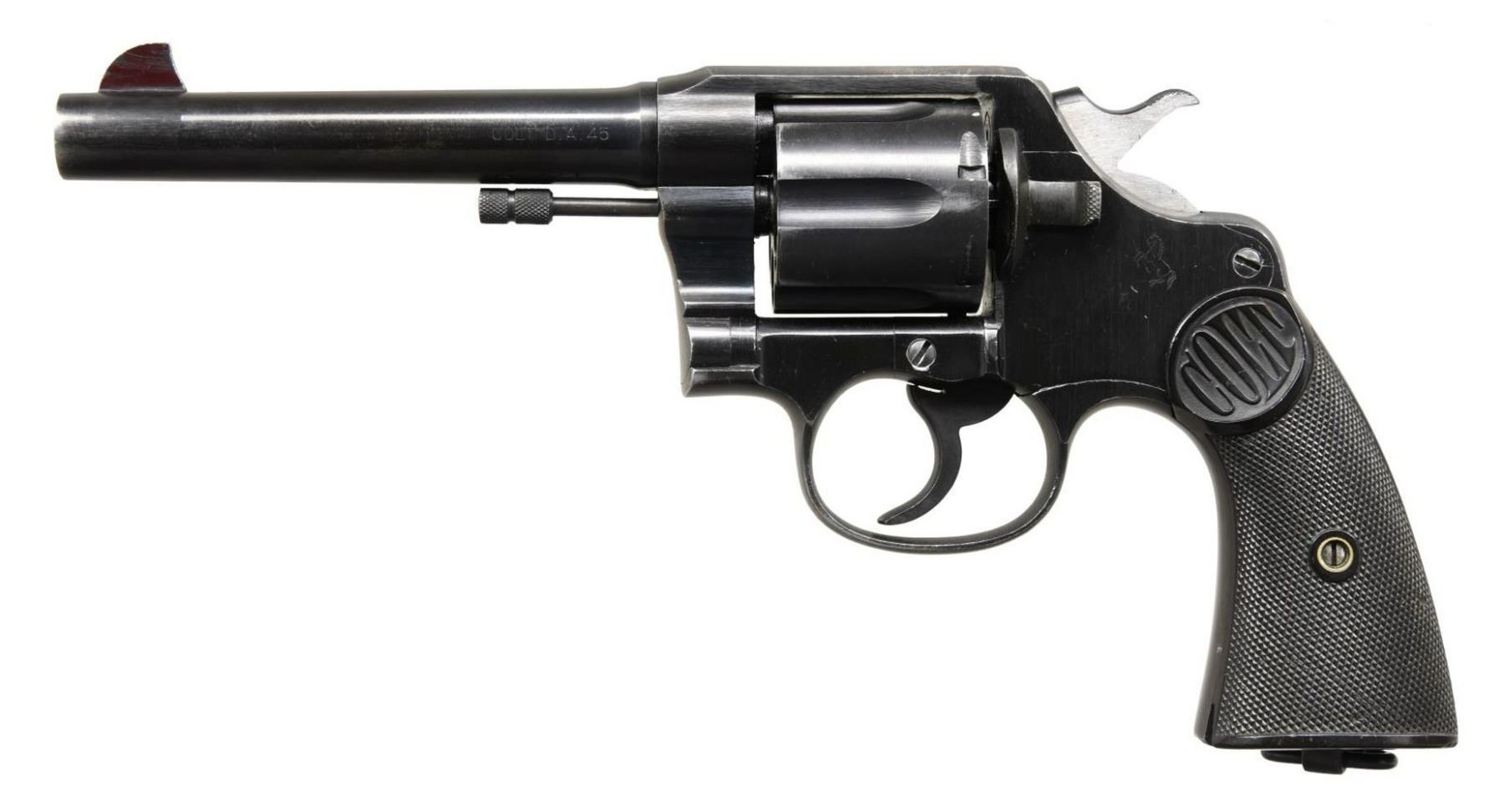 Cal. 45 ACP. S# 38563. Bbl 5 1/2". U.S. Army Model of 1917 revolver manufactured by Colt in 1919. Left side of barrel is stamped with the caliber designation, with Colt's 2 line address over the top and "UNITED STATES PROPERTY" on the underside. Left side of frame bears the Rampant Colt logo, with the military designation and serial number "38563" stamped on the butt. Metal components exhibit an arsenal reapplied blue finish, with the frame being mounted with 2 piece Colt black checkered hard rubber grips. Matching assembly number "1645" is present on the interior of the frame, as well as on the left side of the barrel beneath the caliber designation. CONDITION: metal components retain the majority of their arsenal reapplied blue finish, exhibiting some wear and thinning that shows through to gray patina, as well as some scattered superficial marks from handling and storage. Brilliant mirror bore, exhibiting well defined rifling throughout. Grips exhibit some smoothing and scattered marks from handling and storage, with the right panel exhibiting a loss on the butt. (23-2658/MLW). CURIO. $700-1,000.