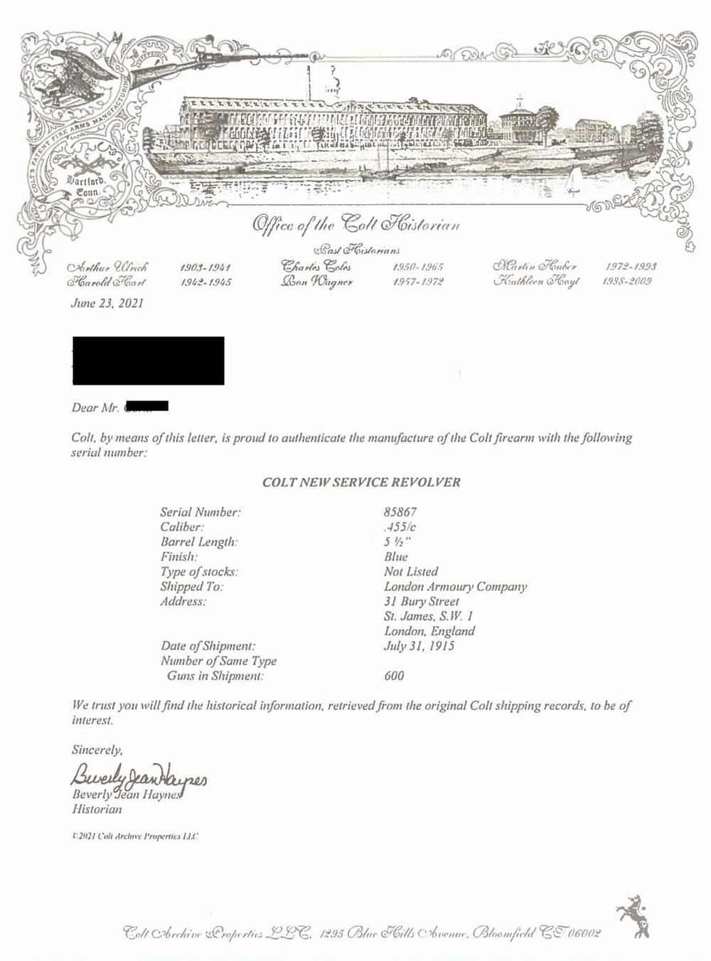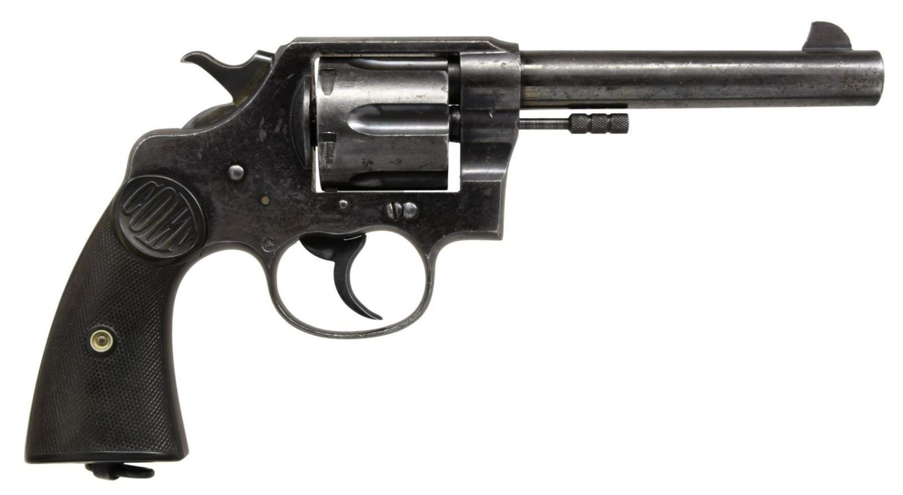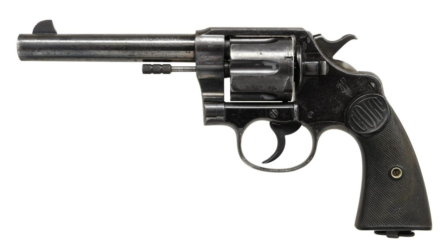 COLT NEW SERVICE DOUBLE ACTION REVOLVER WITH PROVENANCE. Cal. 45 Colt. S# 85867. Bbl 5 1/2". New Service originally chambered in .455 Eley manufactured by Colt and shipped to the London Armoury Company in London, England in 1915. The left side of the barrel is stamped "NEW SERVICE 455 ELEY" below a later applied "CAL. 45 COLT" stamp (indicating conversion to .45 ACP), with Colt's 2 line address across the top. Left side of frame bears the Rampant Colt logo and "VP" proof, with Canadian proofs stamped overall. Rear grip strap is stamped with a lined out "P.P.C.L.I 4.E.27" unit mark, indicating issue to the Princess Patricia's Canadian Light Infantry regiment. Former unit marking is mostly legible, reading "H (?) 2 COY 12 CMGC 15" indicating issue to the 2nd Company, 12th Platoon, Canadian Machine Gun Corps. Metal components are blued, with the frame being mounted with 2 piece Colt checkered brown hard rubber grips. UNATTACHED ACCESSORIES: Colt factory letter indicating that this example was 1 of 600 New Service revolvers shipped to the London Armoury Company in London England on July 31st of 1915, Ancestry Guns listing & letter of authenticity, as well as a brief summary of the Princess Patricia's Canadian Light Infantry regiment. CONDITION: metal components retain large amounts of what appear to be their original factory high polish blue finish, exhibiting wear and thinning overall that shows through to a pleasant gray patina that mixes with the bluing, as well as some light surface oxidation overall. Mirror bore, exhibiting strong rifling throughout. Grips show smoothing and a few scattered marks from handling and storage, but otherwise remain sturdy and serviceable. A scarce and extremely desirable and a Canadian double unit marked Colt New Service revolver. (23-1461/MLW). CURIO. $1,200-1,800.