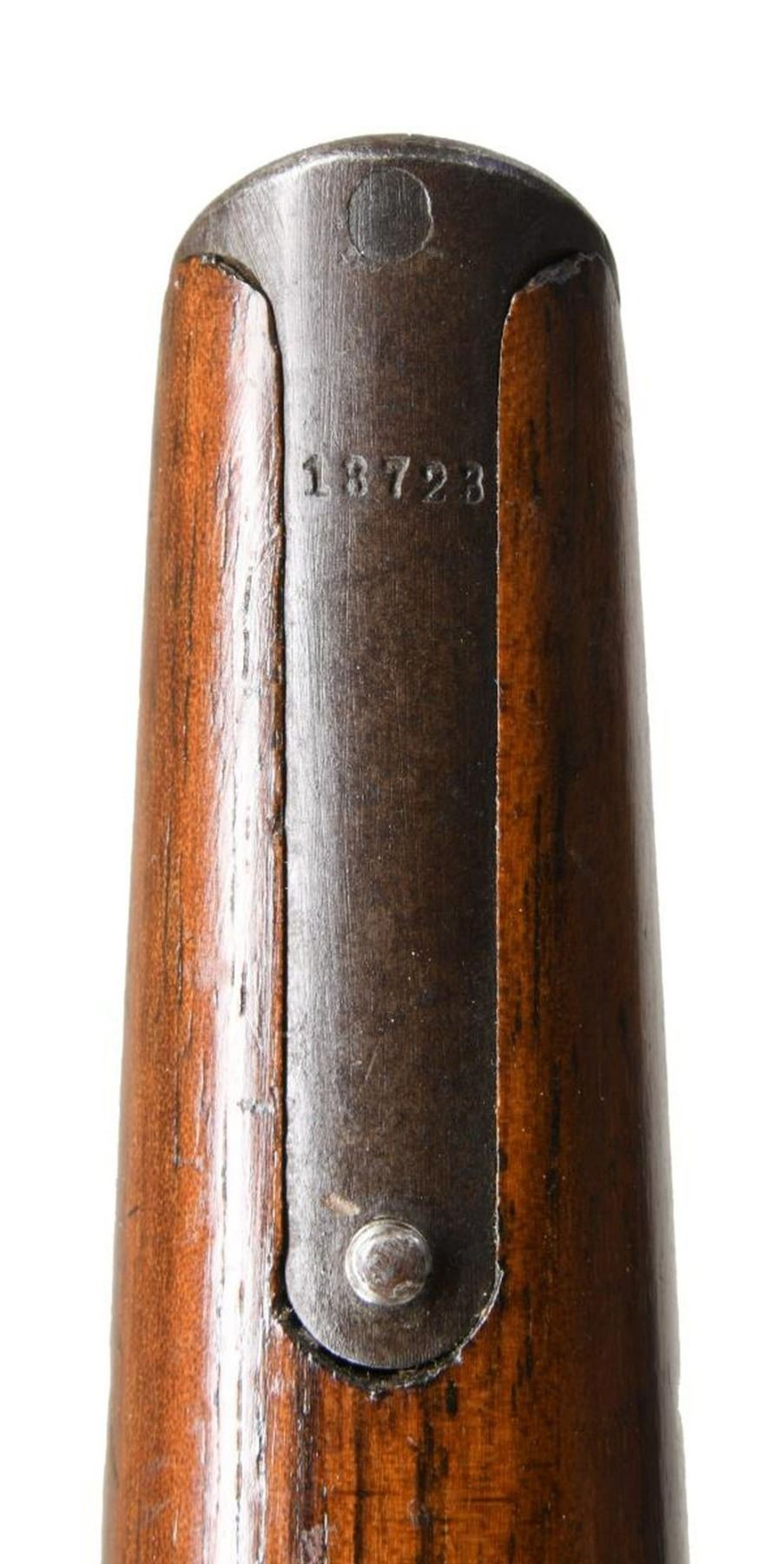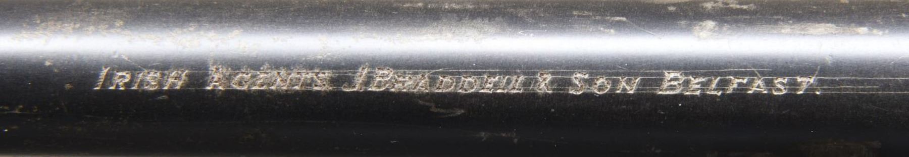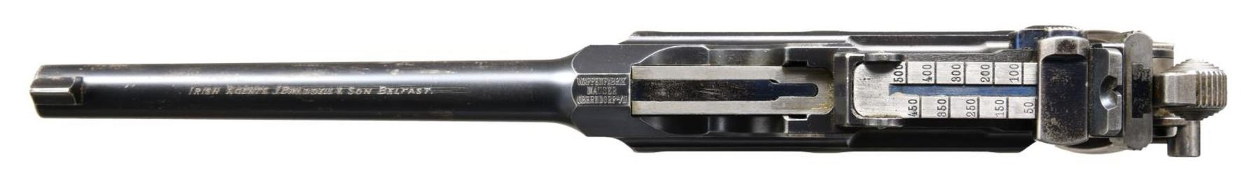 RETAILER MARKED, CORRECT STOCK. Cal. 7.63mm. S# 11817. Bbl 5 1/2". Very desirable Conehammer with retailer marking "IRISH AGENTS J. BRADDELL & SON BELFAST" on upper barrel. Standard features to include fixed front sight, tangent rear sight marked 50-500, long extractor independently secured firing pin, early safety. Three line address on chamber, with Crown/C/U on left side of barrel extension. Antler proofing on right side of extension. All external serial numbers matching including sight bar, cursor, and bolt stop. Disassembly shows matching follower, floorplate, subframe, locking block, transfer bar, firing pin, and both grip panels. Lanyard ring present. Complete with Conehammer stock with lug number "13723". CONDITION: very good to very good plus original blue, with expected wear from moderate use, particularly around forward magazine well, with superficial spotting on right side of barrel. Comparable condition fired blued small parts, showing no suggestion of enhancement. Grips with much original finish, superficial scattered handling marks, and oil related darkening. Bright bore, with shallow rifling. Perfect manual mechanics. VG+ stock, no cracks, with most original finish. Hinge and lug with flecks of oxidation, most finish from face of lug having faded. Excellent fit on pistol with minimal wobble. One of the scarcest early retailer markings, especially nice to find on a Conehammer with correct stock! (01-24240/LA). ANTIQUE. 5,000-7,500.