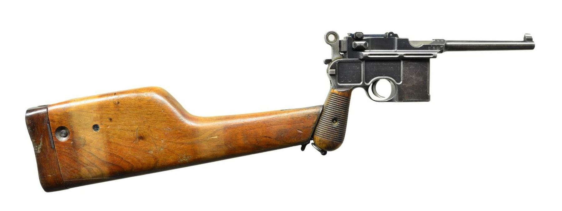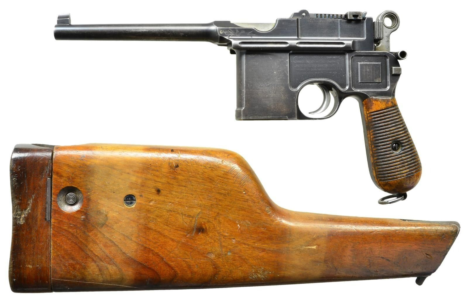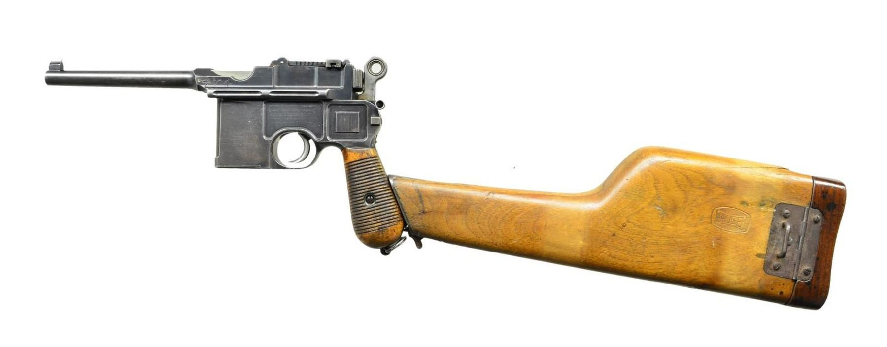 BRITISH MILITARY ACCEPTED WITH SHOULDER STOCK. Cal. 7.63mm. S# 12442. This is an example of Mauser's earliest Large Ring pistols that were assembled using Conehammer bolts and frames, later accepted for use by the British military. The pistol has a 5.5" bbl. w/ a fixed front sight & a pinned 50-500 graduated rear sight. Long extractor, early safety & independently secured firing pin. Top of chamber has the usual Mauser address. Crown/"C"/"U" on left side of bbl. extension; antler proof on right. Full S# is on back of frame. Upon British issue, the left side of the bbl. extension was impressed w/ a pair of bracketing broad arrow markings; British broad arrow acceptance and issue markings are on either side of the barrel extension. Major components rust blued. Most sm. parts fire blued; bolt, hammer, trigger & subframe are in the white. Detailed disassembly shows nearly all the usual parts matched w/ either full S# or last few digits including firing pin, locking block & each of the serrated wood panels. Floorplate is numbered "8951". Lanyard ring present. UNATTACHED ACCESSORIES: accompanied by a later era Mauser banner shoulder stock w/ lug numbered "464". CONDITION: overall very good, w/ handling marks & fading blue, especially on bbl., front of mag. well & front strap, commensurate w/ a pistol that has seen moderate field use. Comparable spotting & wear of the fire blued parts, sight bar having been cleaned along its graduations. Grips with dark oil staining and a scattering of handling marks. Generally bright bore w/ oxidation/roughness in grooves, easily discernable rifling. Perfect manual mechanics. Good stock w/ carrier related discoloration, numerous handling marks, 3" crack at upper spine extending into grip cutout. Hinge & lug w/ considerable oxidation. Pistol fits well in stock, lid closing, but lug will need fitting as it will not fully enter the slot. (01-22328/LMA). ANTIQUE. $3,500-5,500.
