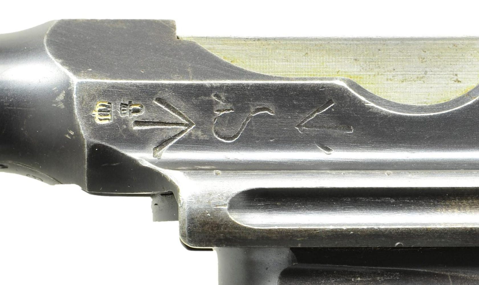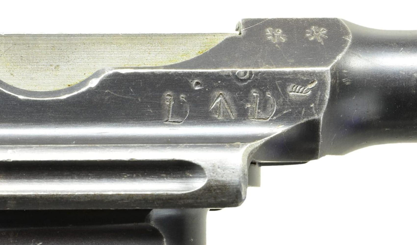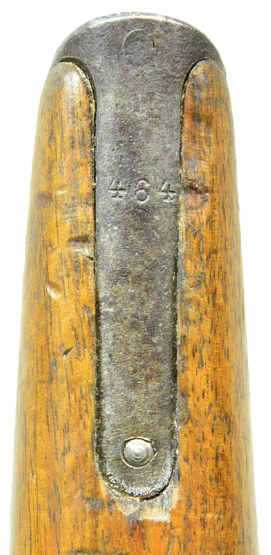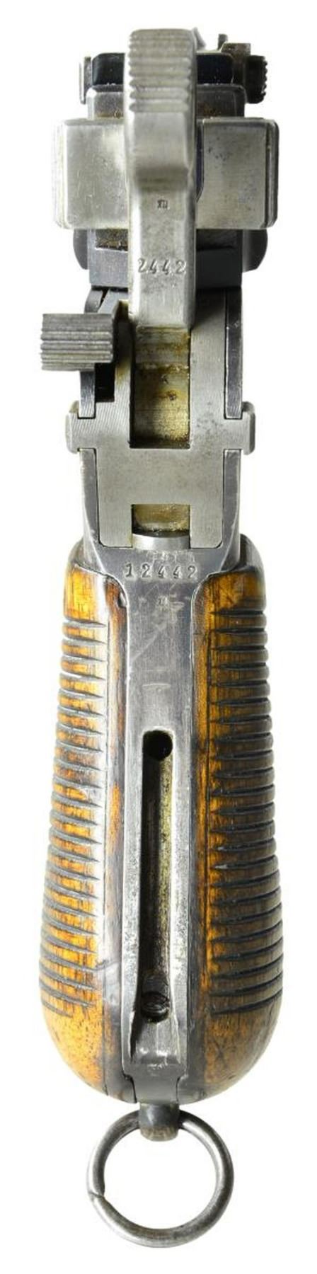 BRITISH MILITARY ACCEPTED WITH SHOULDER STOCK. Cal. 7.63mm. S# 12442. This is an example of Mauser's earliest Large Ring pistols that were assembled using Conehammer bolts and frames, later accepted for use by the British military. The pistol has a 5.5" bbl. w/ a fixed front sight & a pinned 50-500 graduated rear sight. Long extractor, early safety & independently secured firing pin. Top of chamber has the usual Mauser address. Crown/"C"/"U" on left side of bbl. extension; antler proof on right. Full S# is on back of frame. Upon British issue, the left side of the bbl. extension was impressed w/ a pair of bracketing broad arrow markings; British broad arrow acceptance and issue markings are on either side of the barrel extension. Major components rust blued. Most sm. parts fire blued; bolt, hammer, trigger & subframe are in the white. Detailed disassembly shows nearly all the usual parts matched w/ either full S# or last few digits including firing pin, locking block & each of the serrated wood panels. Floorplate is numbered "8951". Lanyard ring present. UNATTACHED ACCESSORIES: accompanied by a later era Mauser banner shoulder stock w/ lug numbered "464". CONDITION: overall very good, w/ handling marks & fading blue, especially on bbl., front of mag. well & front strap, commensurate w/ a pistol that has seen moderate field use. Comparable spotting & wear of the fire blued parts, sight bar having been cleaned along its graduations. Grips with dark oil staining and a scattering of handling marks. Generally bright bore w/ oxidation/roughness in grooves, easily discernable rifling. Perfect manual mechanics. Good stock w/ carrier related discoloration, numerous handling marks, 3" crack at upper spine extending into grip cutout. Hinge & lug w/ considerable oxidation. Pistol fits well in stock, lid closing, but lug will need fitting as it will not fully enter the slot. (01-22328/LMA). ANTIQUE. $3,500-5,500.