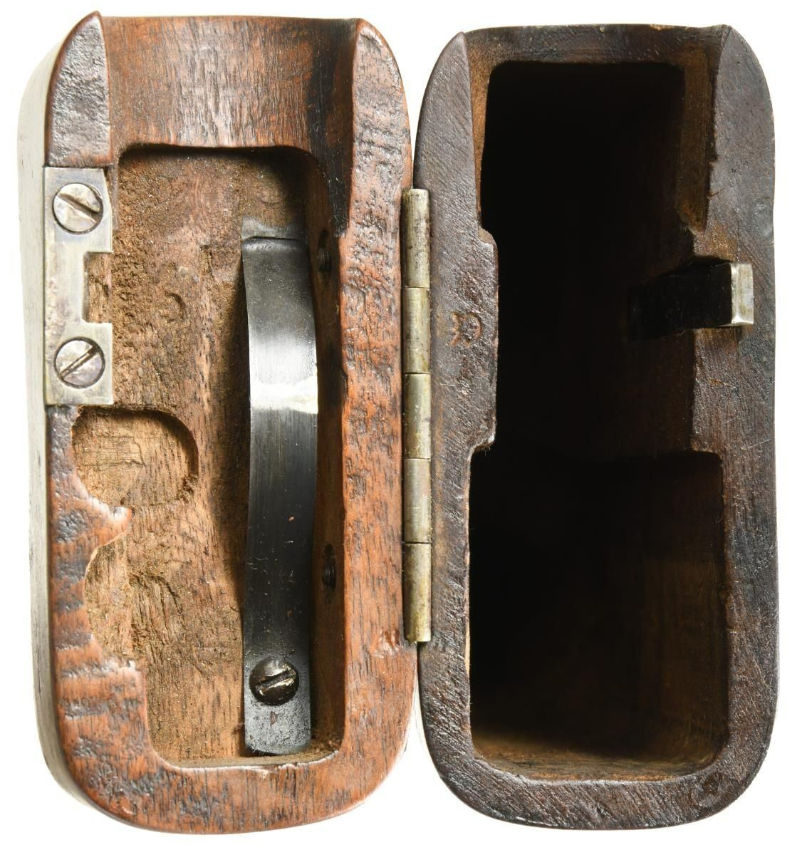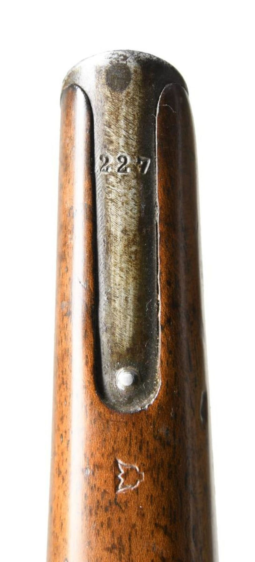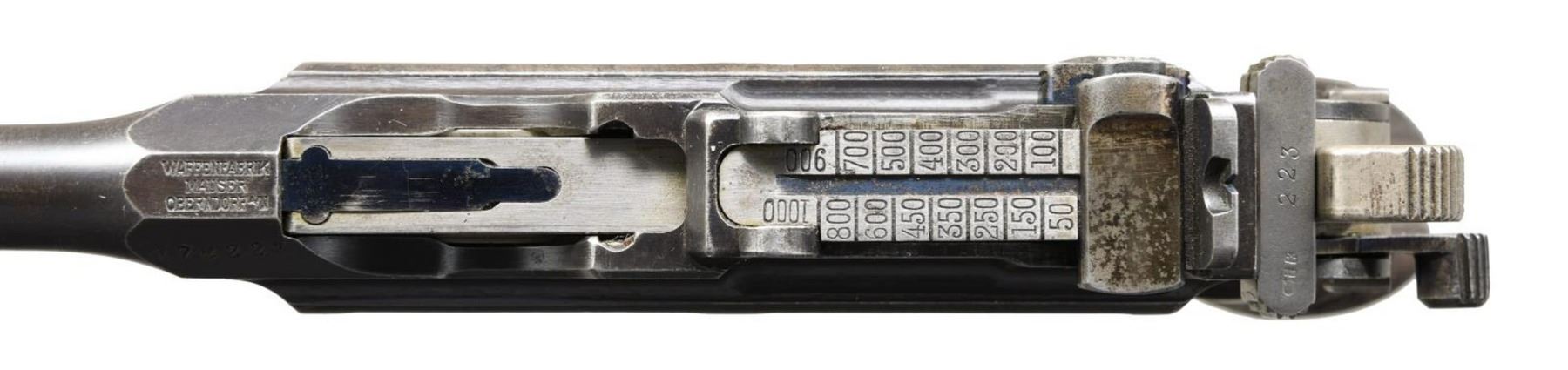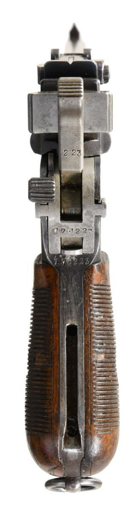 9MM EXPORT, STOCK. Cal. 9x25mm Mauser Export. S# 176223. Bbl 5 1/2". Very very few Pre-War Commercial pistols were chambered for the 9mm Export. This example is an otherwise standard configuration pistol with a 5.5" barrel, fixed front sight, and slip-in rear sight graduated 50-1000. Short extractor, two lug firing pin, small ring hammer, standard safety. Three line address on chamber with full serial number on left chamber flat. Crown/C/U on left side of barrel extension. Two line address on right side of frame. All external numbers are matched to the full serial number that is repeated on the back of the subframe and frame. Disassembly shows a fully matching pistol to include the floorplate, locking block, sear, and each of the grip panels. As true for most 9mm Export pistols and a number in 9mmP, the follower has a feeding groove. Lanyard ring present. Accompanied by a military accepted shoulder stock originally fitted for a Red-9, repair around lid release button, having hinge with no loop, and lug numbered "227". CONDITION: overall VG with approximately 85% original blue, early toning of the barrel with expected use related wear and some spotting on the right side of the barrel extension. Excellent original fire blue on the extractor, cursor, and bolt stop, the trigger having faded to a yellowish gray in the areas of usual contact. Comparable condition grips with oil discoloration, scattered dings, and a few patches of losses. Bright bore with sharp rifling. V-VG stock that has been refinished, repaired around the button as previously noted, with most of the fire blue from the hinge and lug having faded to a gray. A rare opportunity to own a Pre-War Commercial pistol in an extremely scarce caliber, with a later era Red-9 stock you can use for a different pistol! (22-3143/LA). CURIO. $2,000-4,000.