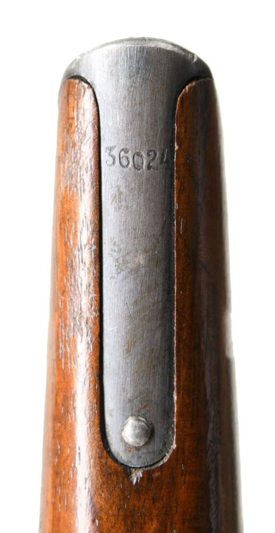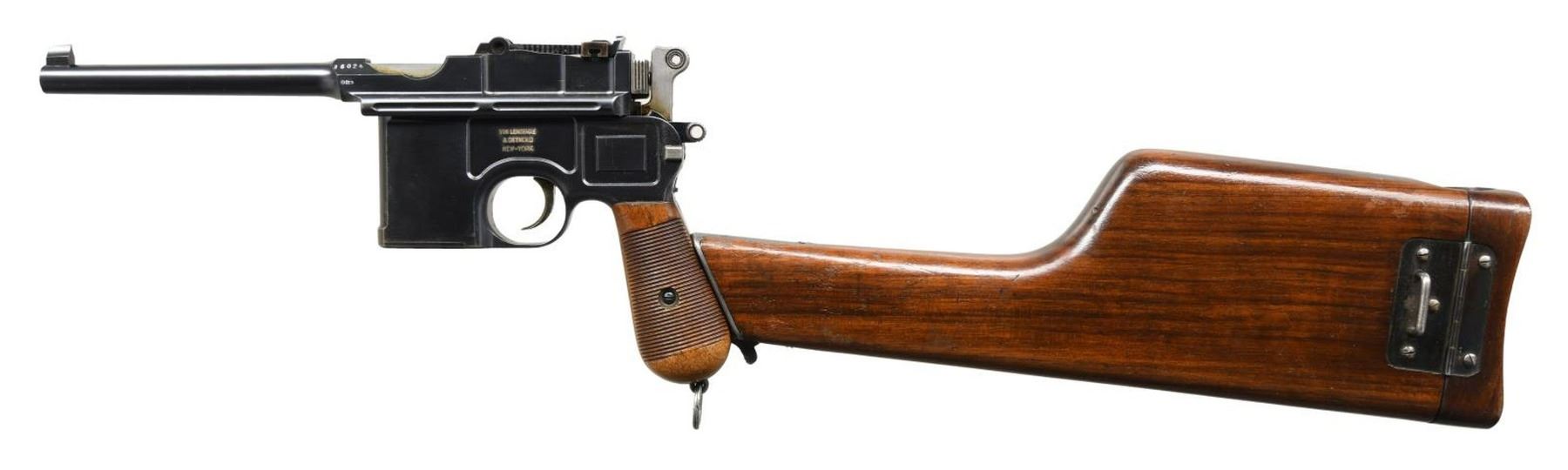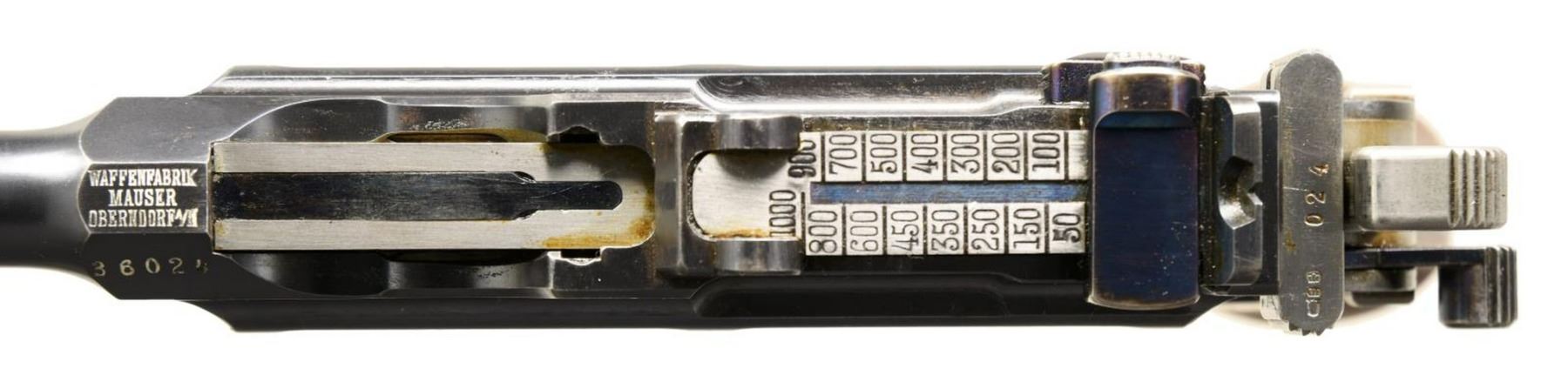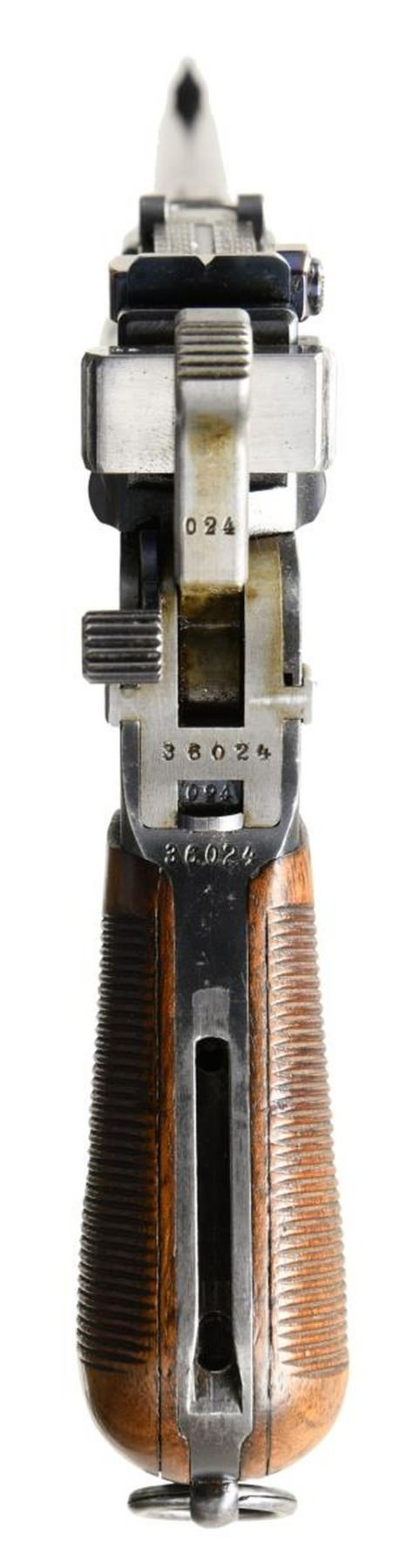 COMMERICIAL, WITH MATCHING STOCK. Cal. 7.63mm. S# 36024. Bbl 5 1/2". Early Pre-War Commercial Mauser C96 with fixed front sight and tangent sight graded 50-1000. Long extractor, two lug firing pin, small ring hammer, thin trigger. Three line address on top of chamber with full SN on left chamber flat. Crown/C/U on left side of barrel extension. Antler proof on right side. Two line Mauser address on right side of frame. Imported marked on left of frame "VON LENGERKE/ & DETMOLD/ NEW-YORK". Fitted with serrated wood panels. Fully matching internally and externally, including the grips. Complete with a factory matching stock. CONDITION: bright 98%+ original rust blue with a few minute flecks of oxidation and wear on forward magazine housing and other areas of expected contact. Fire blued parts at least 95% with thinning/wear in usual locations. Strawed trigger with slight fading on forward surface. Grips retaining most original varnish with just a few superficial handling marks. Bright bore with sharp rifling. Perfect manual mechanics. Comparable condition stock with original varnish, superficial handling marks, a few oxidative flecks under the congealed oil on hinge, and slight fading with patchy discoloration of lug with marred screw. A wonderful ensemble by any metric. (22-3089/LA). CURIO. $4,500-7,500.