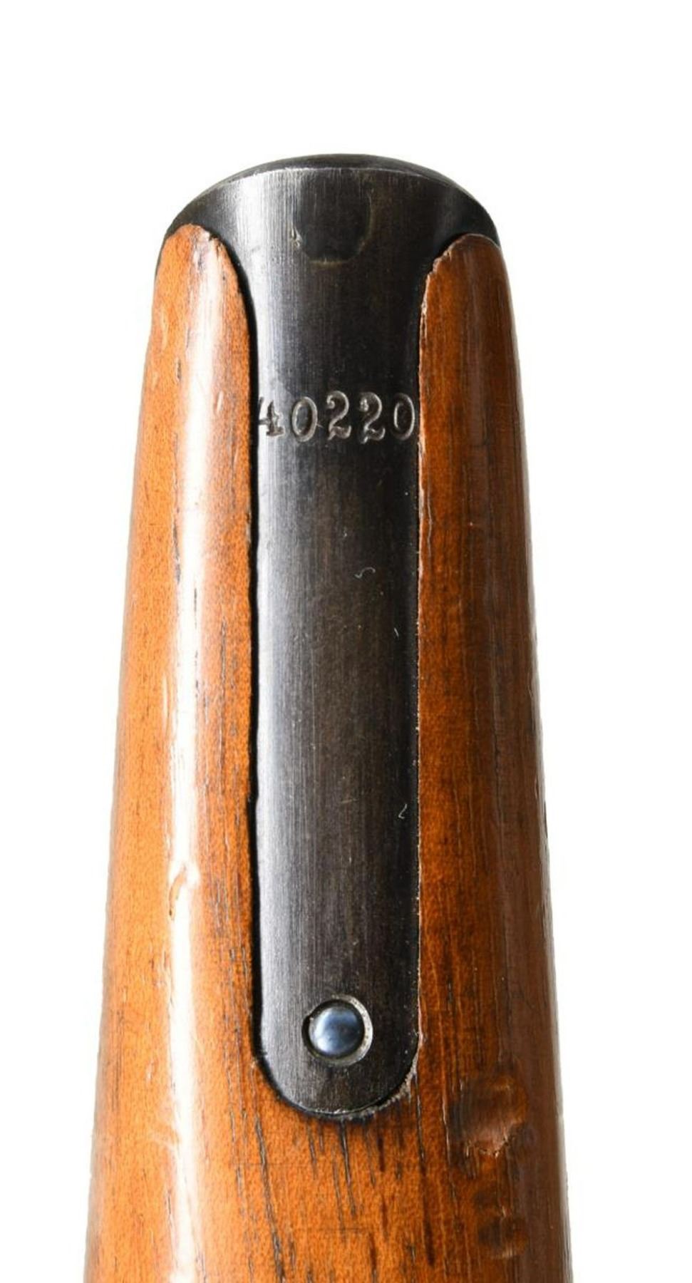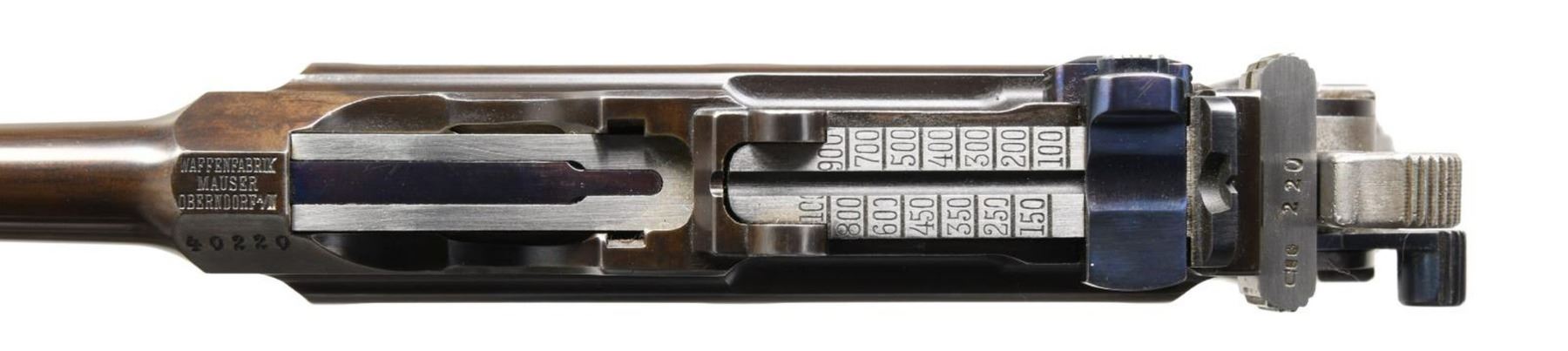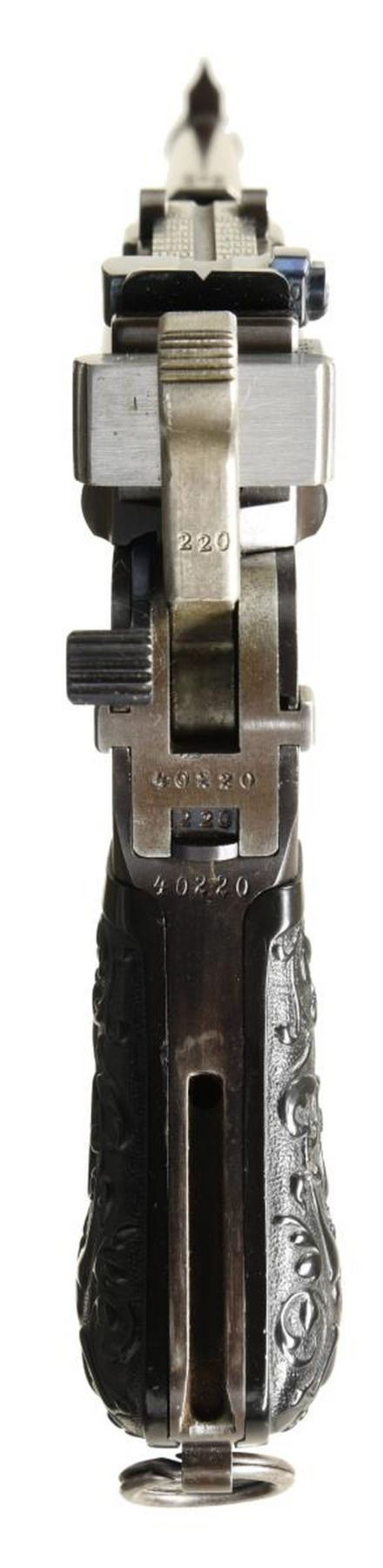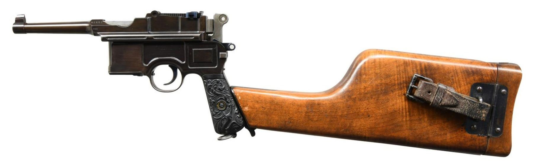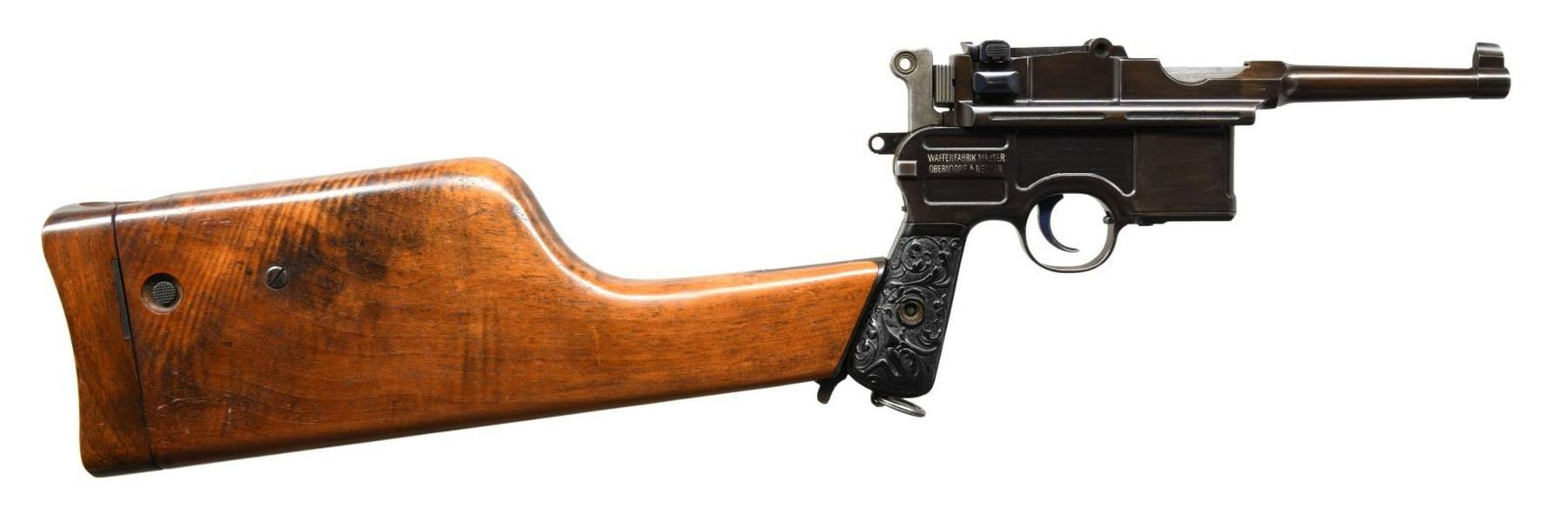 SIGHT, FLORAL GRIPS, MATCHING STOCK. Cal. 7.63mm. S# 40220. Bbl 4". Striking Pre-War 6-shot Bolo with fixed front sight and unusual rear sight with channel groove in sight bar that extends into lug and grooved cursor as customarily used on carbines. Long extractor, two-lug firing pin, small ring hammer, second variation safety. Three line Mauser address on chamber with full serial number on left chamber flat. Crown/C/U on left side of barrel extension. Antler proof on right side. Right side of frame with two line Mauser address. Full serial number on backstrap, repeated or with matching digits on all externally visible small parts. Disassembly shows a matching pistol with a numbered follower, floorplate, sear, locking block, and locking lever. Firing pin has no number or proof. Original grips, each very lightly scribed with the full serial number, secured with a transverse screw having an engraved head. Lanyard ring present. Accompanied by an original matching Bolo shoulder stock. CONDITION: virtually new as restored with restoration to include the fire bluing of all small parts. Dull bore with shallow rifling. Perfect manual mechanics. VG+ stock, wood, hinge, and iron with original finish, 3.5" hairline crack at spine. An extremely scarce C96 6-shot Bolo, particularly in having such a nice and factory matching stock! (22-3092/LA). CURIO. $4,500-7,500.