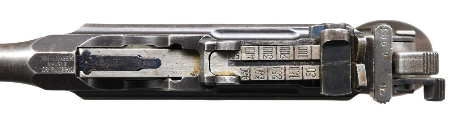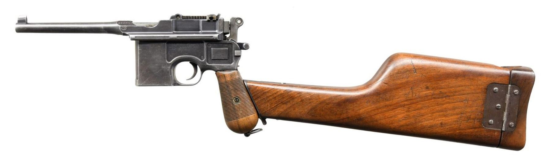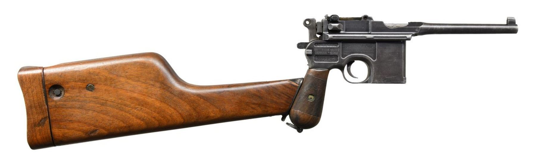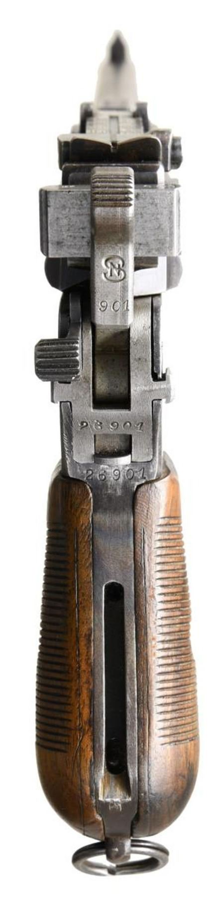 SEMI-AUTOMATIC PISTOL WITH STOCK. Cal. 9mm Para. S# 26901. Bbl 5 1/2". C96 chambered in 9x19mm Parabellum manufactured by Mauser for the Imperial German military during World War I. The right side of the frame bears stampings stipulating Mauser's manufacturer information, which is also present on the top flat of the chamber. Left side of receiver is stamped with a double Crown/U commercial proof, with the right side bearing a single crowned Imperial German military acceptance proof. Major metal components are rust blued, with some smaller components being in-the-white or nitre blued. All numbers are matching, with the exception of the grips. UNATTACHED ACCESSORIES: Imperial German proofed wood stock holster, with some faint carving on the side, with legible characters reading "Aust". CONDITION: major metal components retain the majority of their original factory blue finish, exhibiting mild wear and thinning overall that shows through to a gray patina. Bright bore, exhibiting moderate pitting and strong rifling throughout. Grips show some scattered marks and minor impressions from storage and handling, but are otherwise very good. Stock shows some scattered handling marks, with a couple small gouges, a loss on the left side at the stock iron, as well as a crack at the lid release button that runs down to the screw hole. (23-2472/MLW). CURIO. $1,000-1,500.