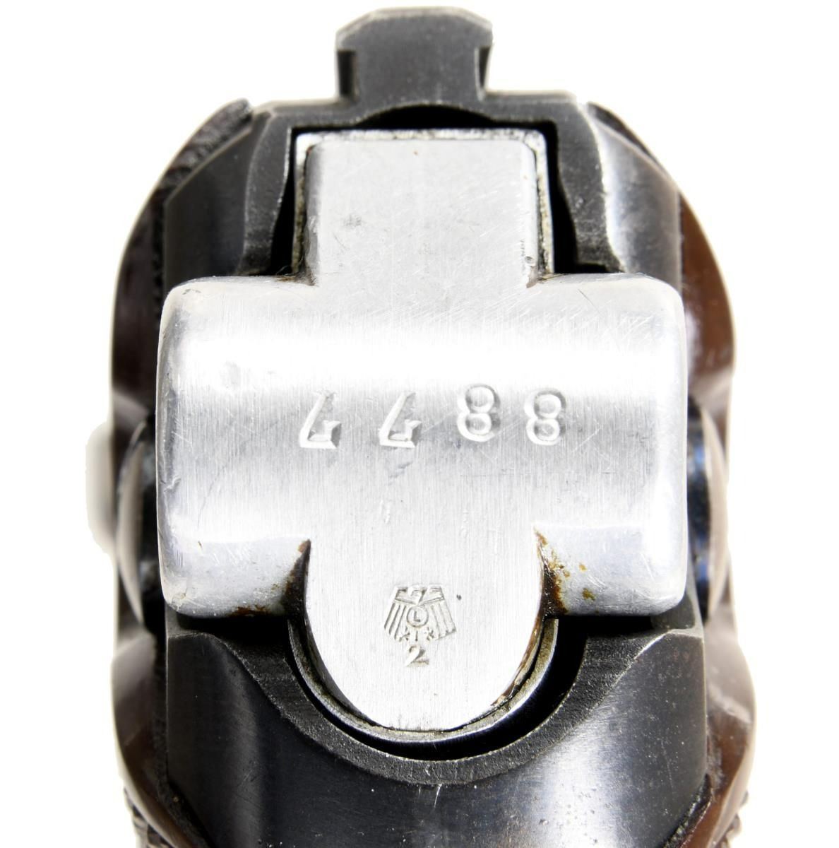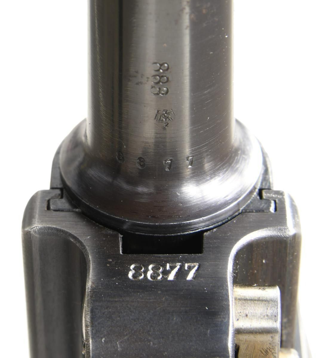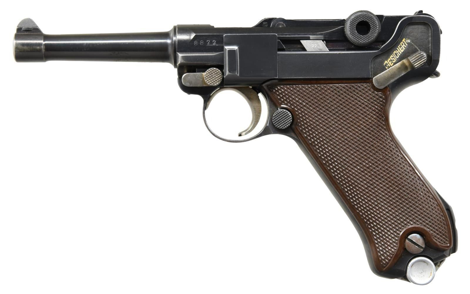 MATCHING MAGAZINE. Cal. 9mm. S# 8877. Bbl 4”. According to Jan Still, in the book Third Reich Lugers, this example was one of 2,550 Lugers that were made in 1937 in the range 7300-10000. It has a drift adjustable front sight and V-notch rear sight. “H/K” logo “KRIEGHOFF/ SUHL” on the front toggle link. Full serial number appearing under barrel, left side of barrel extension, and forward frame. Disassembly shows all matching numbers and appropriate acceptances. Matching stainless steel extruded magazine, unmarked except for plug. CONDITION: approximately 97% bright blue, with the sideplate having been refinished. Comparable condition straw with toning and fading of the trigger in usual contact areas. Comparable condition grips and magazine whose plug has been freshened. Dull bore with shallow rifling. Perfect manual mechanics. A very attractive and all matching Krieghoff Luger. (23-4742/LA). CURIO. $9,000-15,000.