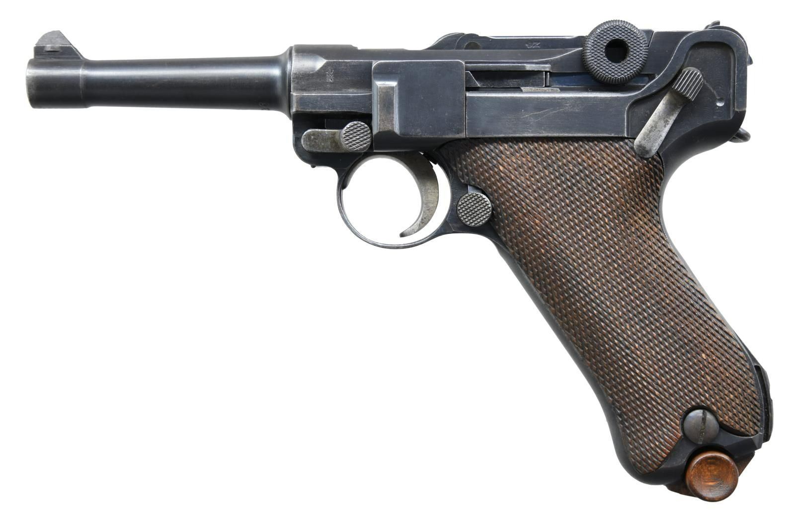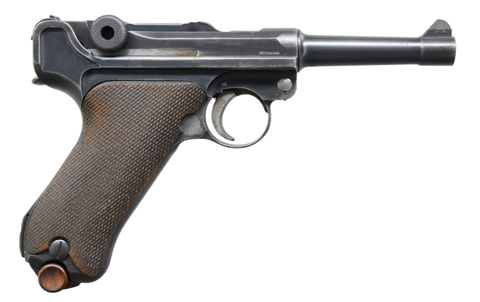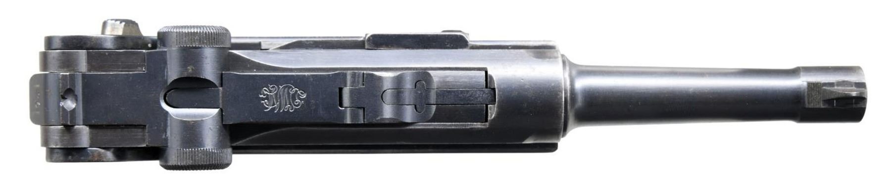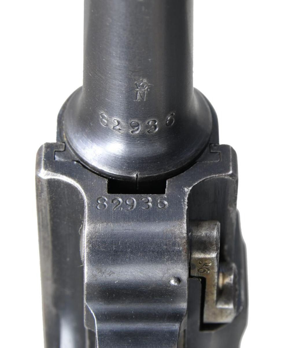 PISTOL. 30 Luger. S# 82936. Bbl 3 3/4". Model 1923 Commercial Luger manufactured by DWM for domestic and foreign commercial sales. Toggle bears the intertwined "DWM" monogram. Crown/N commercial nitro proof is present on the left side of the receiver and toggle, as well as on the underside of the barrel. Right side of receiver bears the upper half of a "GERMANY" stamped. Major metal components exhibit a rust blued finish, with some smaller components being strawed or nitre blued. Frame is mounted with 2 piece checkered wood grips. All numbers are matching in the commercial "hidden" fashion and include the frame, takedown lever, sideplate, trigger, barrel, breechblock, and rear toggle link. MAGS: 1 8 rnd. CONDITION: metal components retain the majority of their original factory blue finish, exhibiting areas of wear and thinning overall, as well as some areas of surface oxidation, which are mainly present on the grip straps. Strawed components exhibit varying degrees of wear, with areas of oxidation and discoloration overall. Mirror bore, exhibiting good rifling throughout. Grips show smoothing and some scattered handling marks, but are otherwise sturdy and serviceable. (23-2461/MLW). CURIO. $800-1,200.