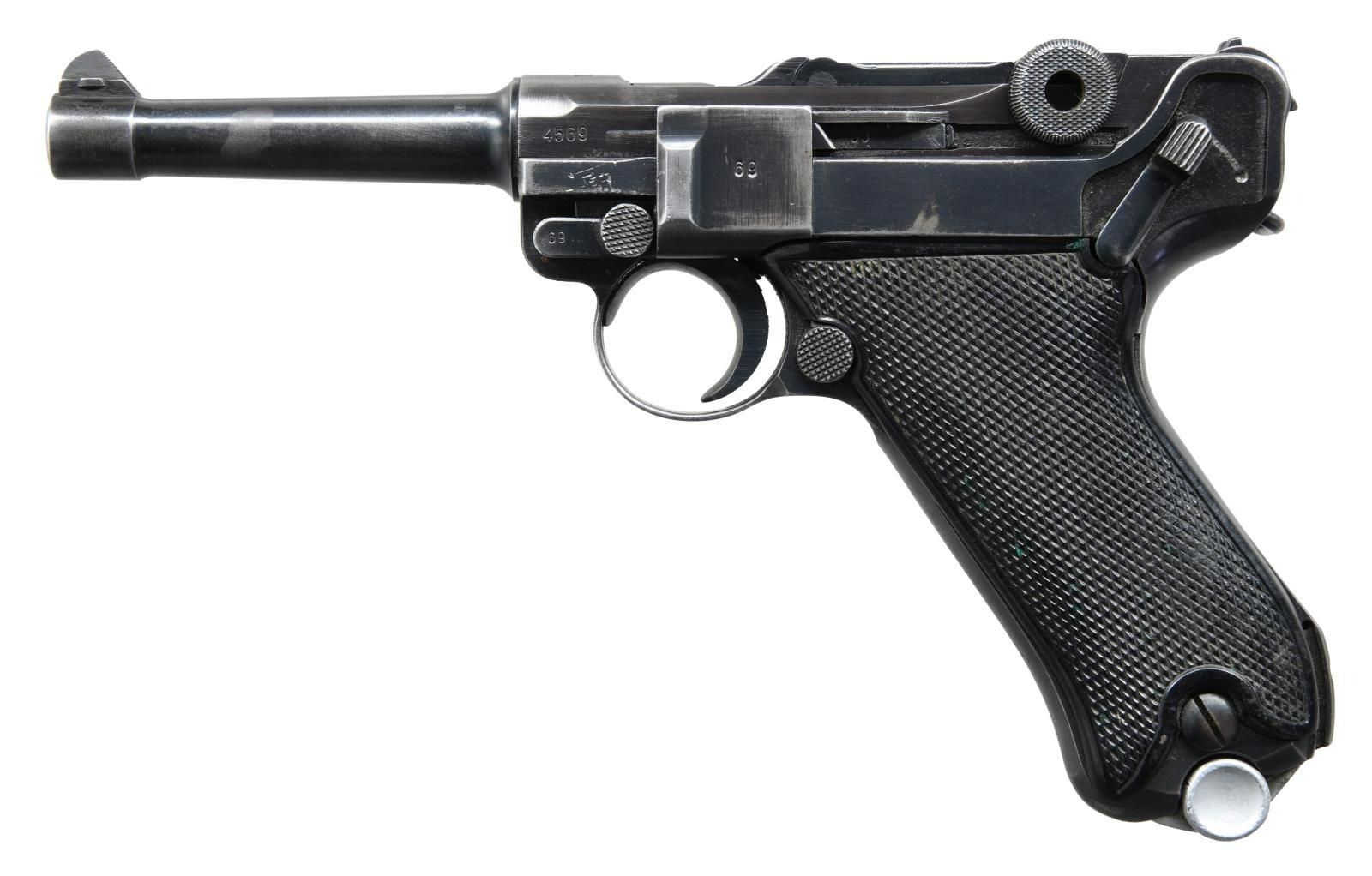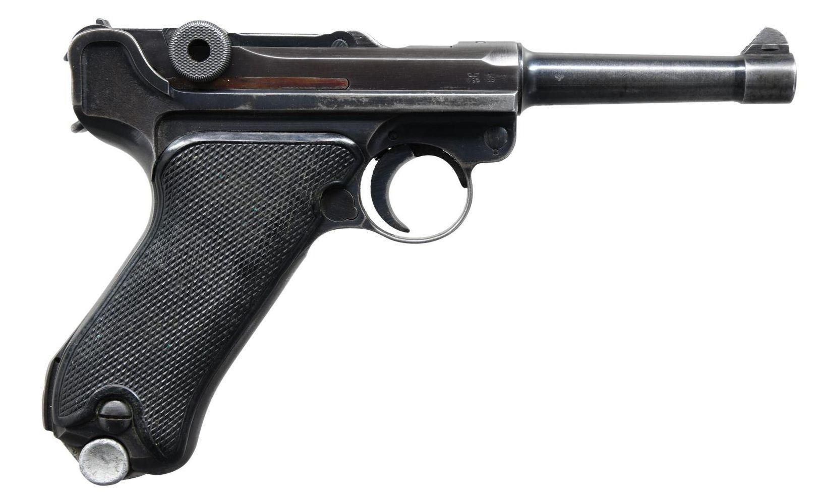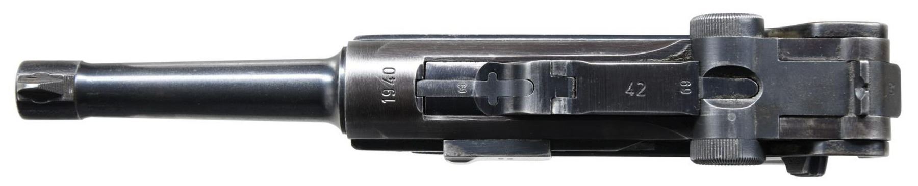 SEMI-AUTOMATIC PISTOL. Cal. 9mm L. S# 4569h. Bbl 3 7/8". P.08 manufactured by Mauser in 1940. The receiver is stamped "1940", with Mauser arsenal proofs on the right. Toggle bears Mauser's "42" manufacturer code. Metal components exhibit a salt blued finish, with the frame being mounted with 2 piece checkered black plastic grips. All numbers are matching, with the exception of the aluminum bottom magazine. MAGS: 1 8 rnd. CONDITION: metal components retain large amounts of their original arsenal blue finish, exhibiting areas of wear and thinning that show through to gray patina, with surface oxidation and spots of mild pitting overall. Bore exhibits pitting and fair rifling throughout. Grips show smoothing and scattered marks and impressions from storage and handling, but otherwise remain sturdy and serviceable. (23-1866/MLW). CURIO. $1,000-1,500.