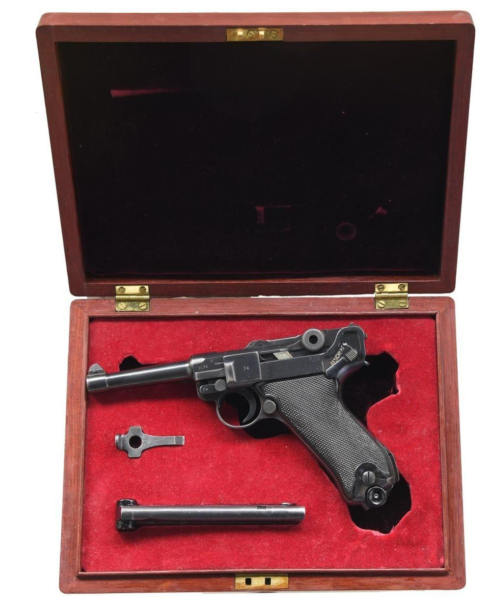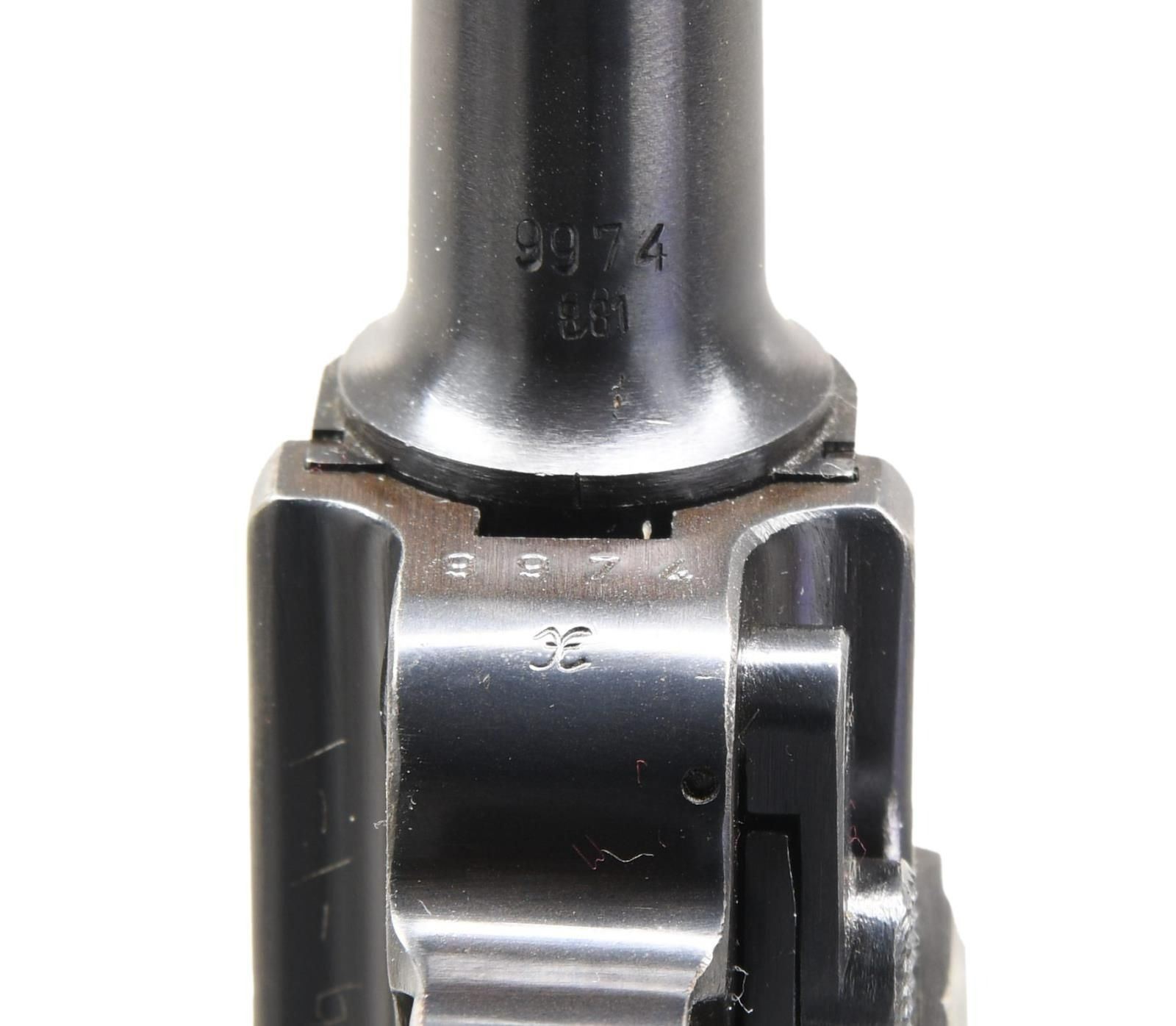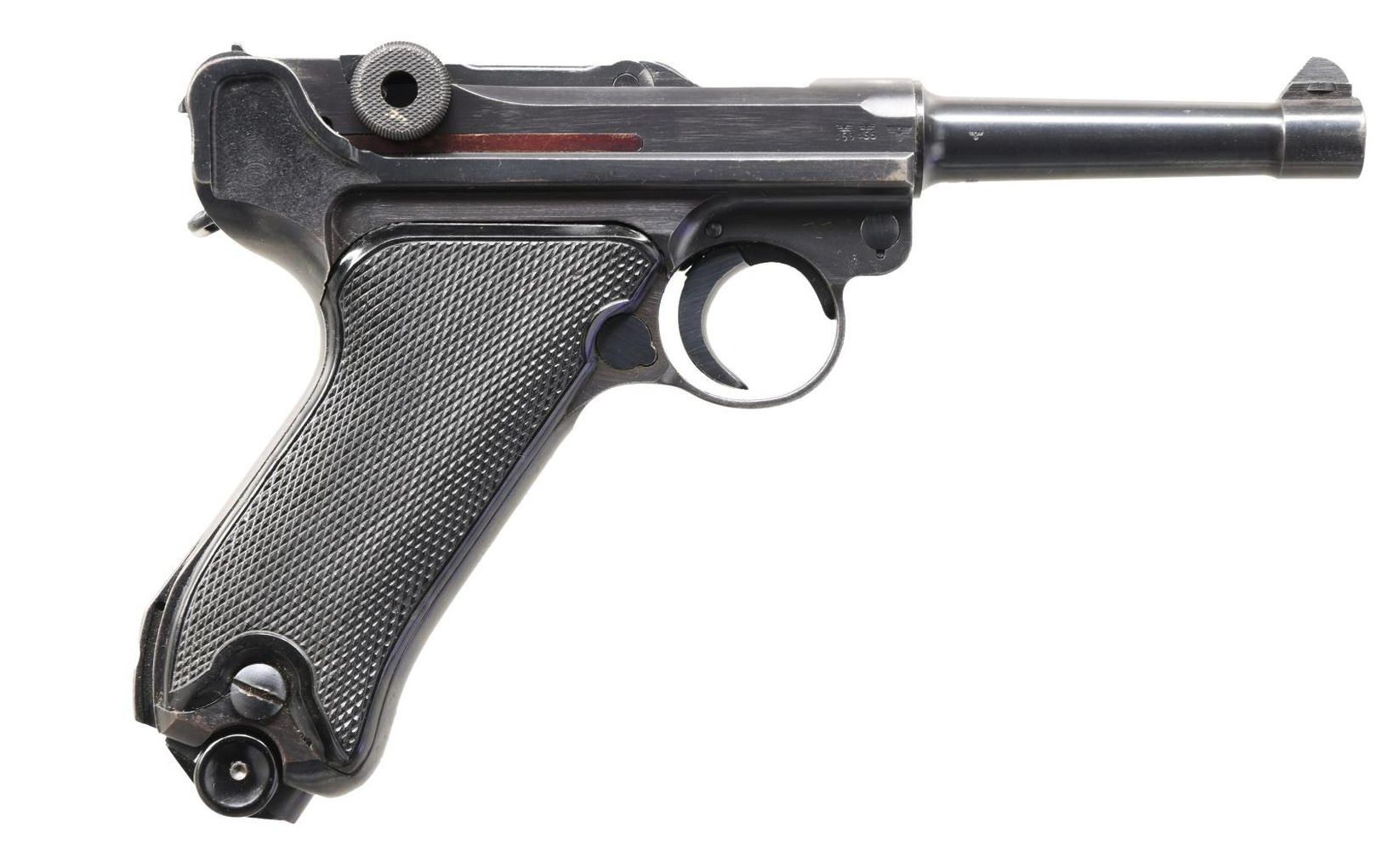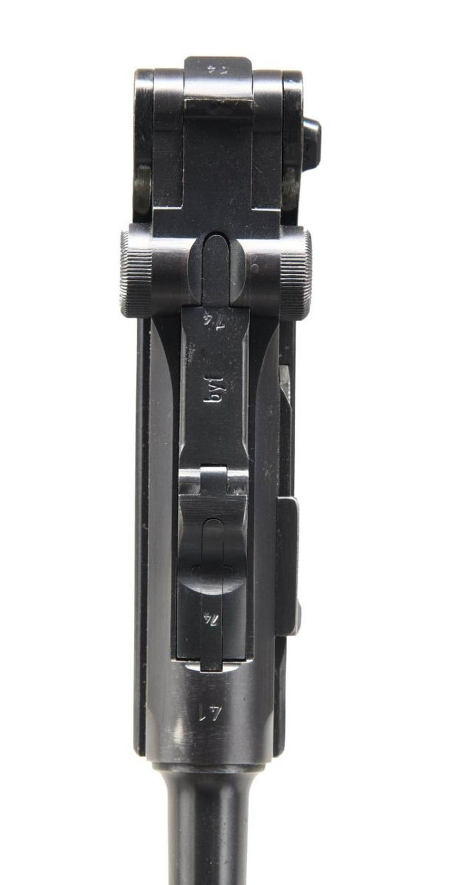P.08 LUGER SEMI-AUTOMATIC PISTOL. Cal. 9mm Parabellum. S# 9974x. Bbl 4". P.08 Luger manufactured by Mauser in 1941. The receiver is stamped "41" over the chamber, with Mauser Eagle/655 waffenamts followed by an eagle firing proof stamped on the right. Toggle bears Mauser's "byf" manufacturer code. Right side of frame is light scratched "DLD" and "1-1-61". Metal components are blued, with the frame being mounted with 2 piece checkered black plastic grips. Blued magazine with black plastic bottom. All numbers are matching and include the frame, takedown lever, sideplate, trigger, safety bar & lever, hold-open latch, receiver, trigger bar, barrel, breechblock, extractor, firing pin, as well as the toggles. MAGS: 2 8 rnd. UNATTACHED ACCESSORIES: high quality wood display case featuring a red velvet interior and containing 1 spare black plastic bottom magazine, as well as a loading tool. CONDITION: metal components retain the vast majority of their original arsenal blue finish, exhibiting some spots of mild thinning and wear that show through to pleasant gray and brown patinas, with some mild surface oxidation on the grip straps, and a few scattered spots of mild freckling overall. Bore is bright, exhibiting moderate amounts of light surface pitting and retaining strong rifling throughout. Grips show some scattered nicks and marks to the diamonds, but otherwise remain sturdy and serviceable. Case exhibits some mild exterior wear, but is otherwise fine. A very nice example of a desirable Mauser "Black Widow" P.08 Luger. PROVENANCE: Collection of Horst Kreiner. (23-5064/MLW). CURIO. $2,000-4,000.