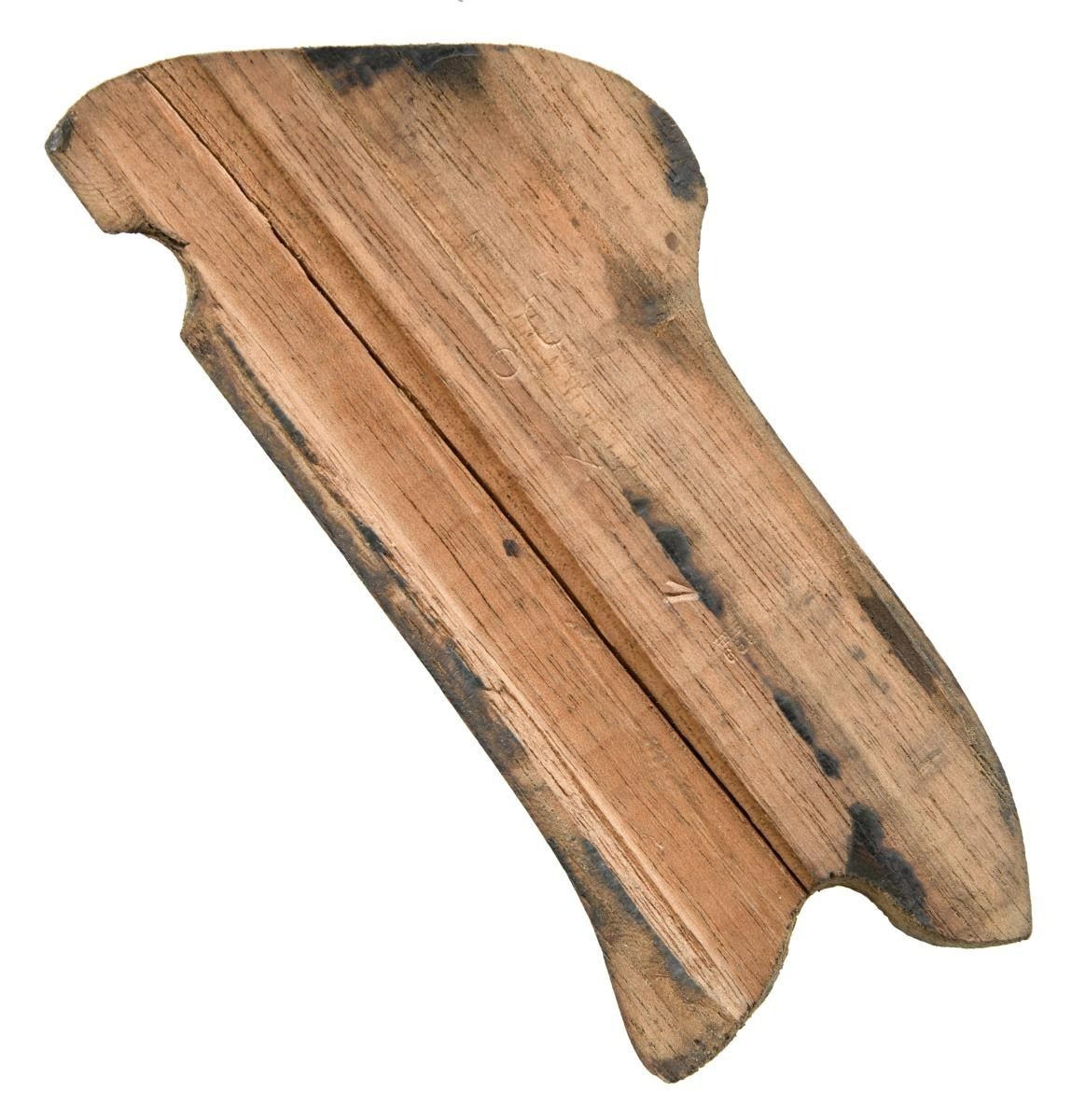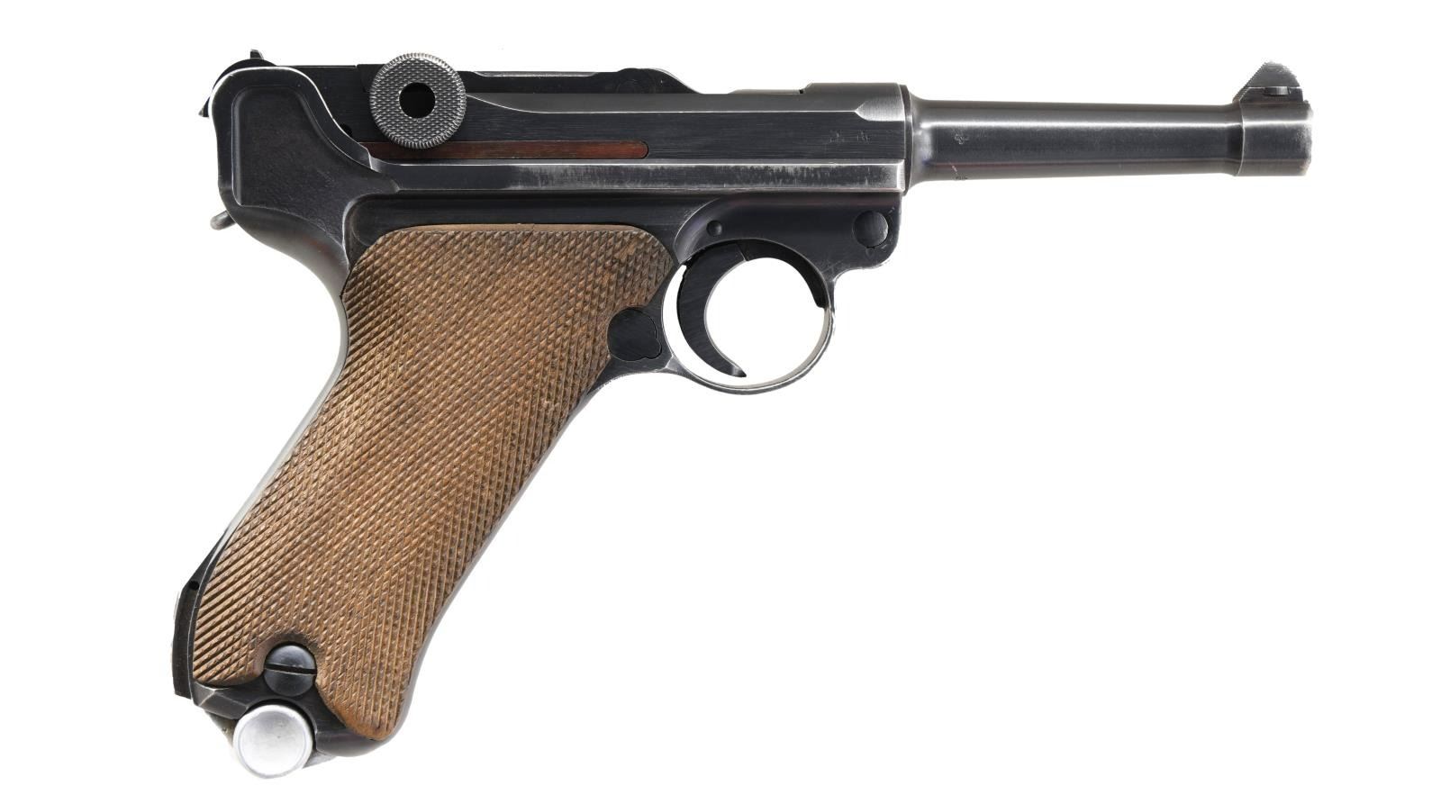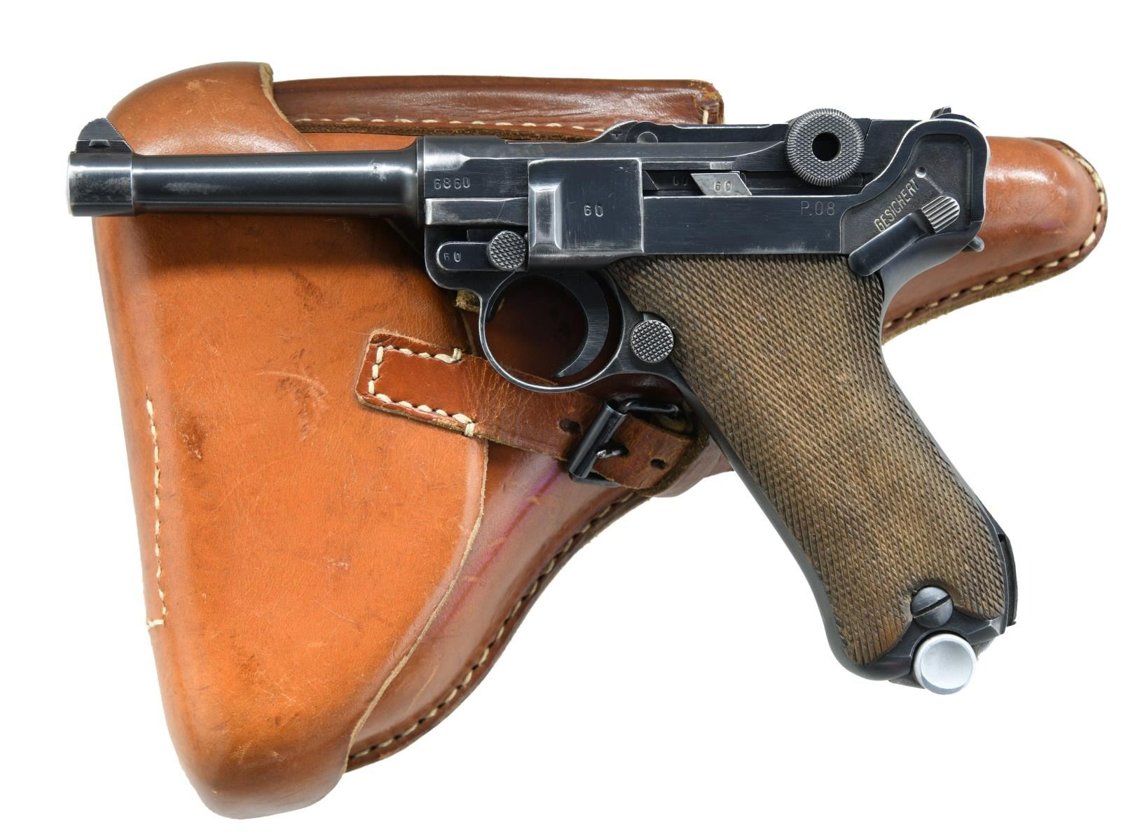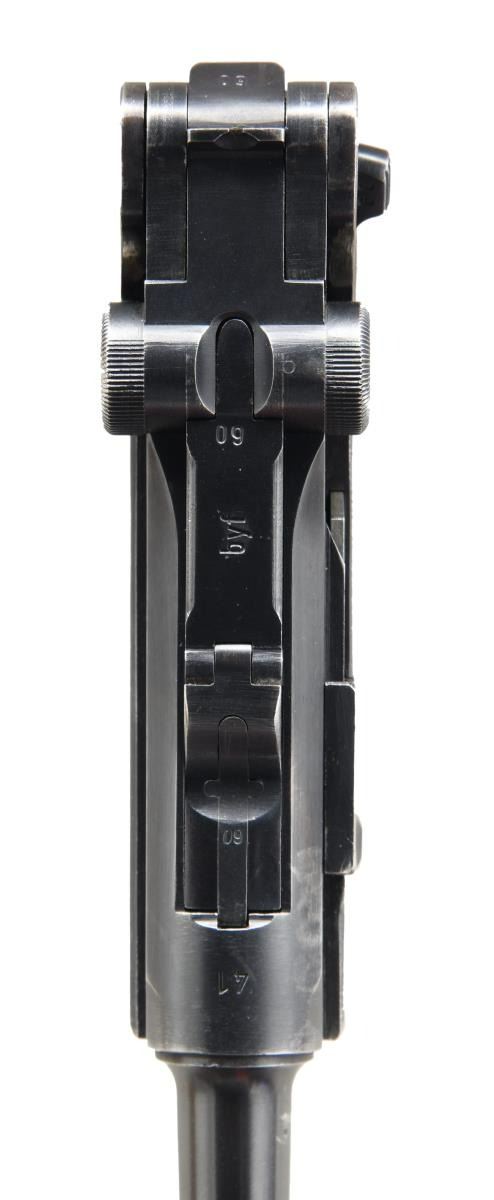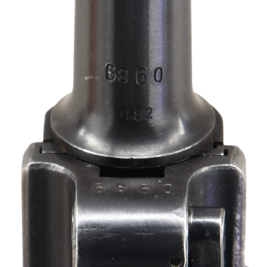 P.08 LUGER SEMI-AUTOMATIC PISTOL WITH HOLSTER. Cal. 9mm Luger. S# 6860. Bbl 4". Standard configuration P.08 Luger manufactured by Mauser during 1941. The barrel extension is stamped "41" over the chamber, with Mauser Eagle/655 and Eagle/135 waffenamts on the right. Toggle is stamped with Mauser's "byf" manufacturer code. Metal components exhibit a salt blued finish, with the frame being mounted with 2 piece checkered wood grips. All numbers are matching (with the exception of the unnumbered Mauser proofed aluminum bottom magazine) and include the frame, takedown lever, sideplate, trigger, safety lever & bar, barrel, barrel extension, trigger bar, breechblock, extractor, firing pin, toggles, receiver axle pin, as well as the grips. MAGS: 1 8 rnd. UNATTACHED ACCESSORIES: unmarked period brown leather holster containing a Mauser loading tool. CONDITION: metal components retain the majority of their arsenal blue finish, exhibiting scattered areas of wear and thinning overall that show through to gray patina, with some small areas of light pitting. Bright bore, exhibiting mild pitting and well defined rifling throughout. Grips show mild smoothing and a few scattered nicks to the diamonds. Right panel exhibits a grievous crack on the interior that runs the length of the panel and should be handled with care. Holster remains malleable, exhibiting scattered marks from handling and storage, with age related cracking on the closure strap and heavy crazing on the pull strap. (23-5023/MLW). CURIO. $1,200-1,800.