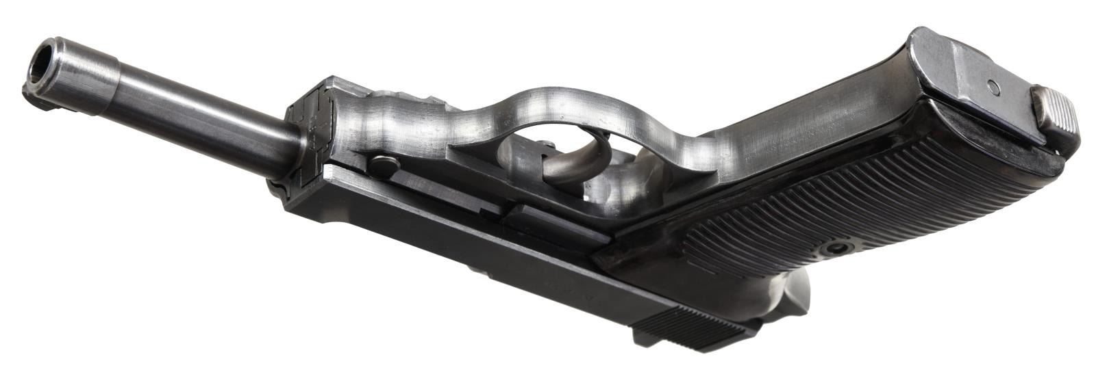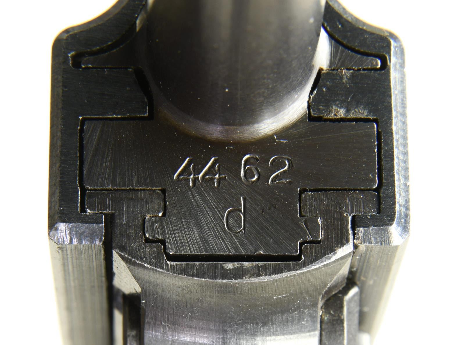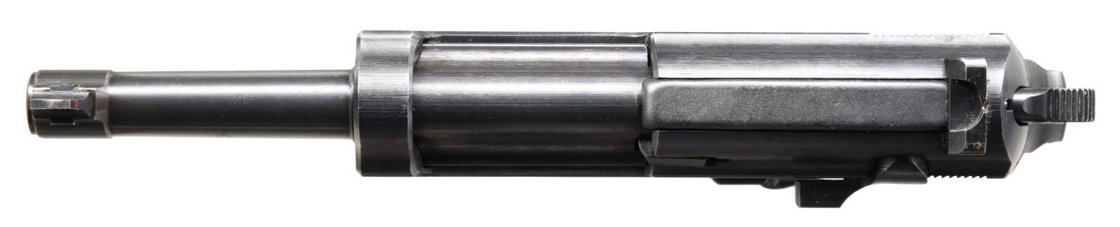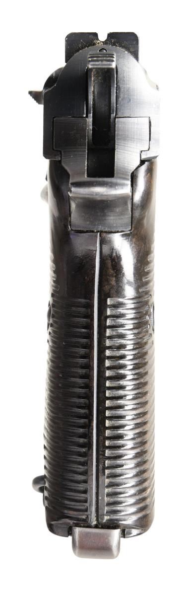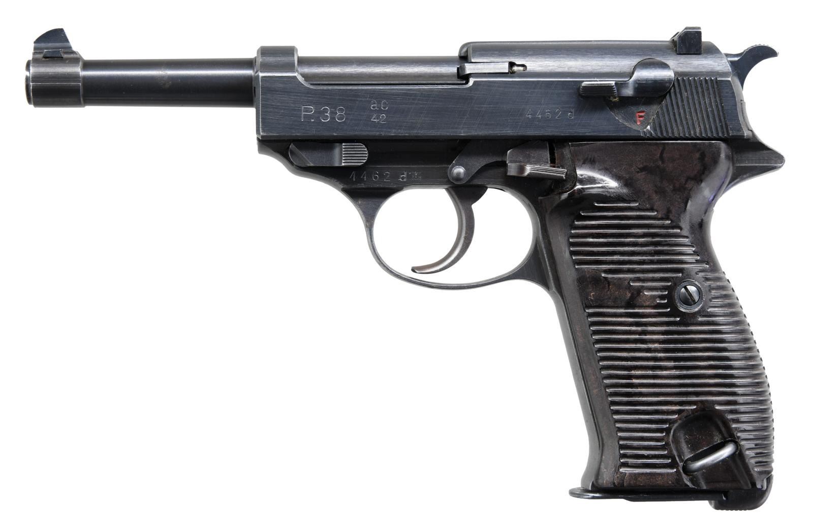 SEMI-AUTOMATIC PISTOL. Cal. 9mm Para. S# 4462d. Bbl 4 7/8". Standard configuration P.38 manufactured at the Walther arsenal in 1942. The left side of the slide bears standard markings, exhibiting Walther's manufacturer code and year of manufacture "ac/42", with an Eagle/359 waffenamt on either side of an eagle firing proof on the right. Metal components are blued, with the frame being mounted with 2 piece grooved pressed resin grips. Matching numbers are present on the frame, slide, and barrel. Locking block is unnumbered, but bears a Walther Eagle/359 waffenant on the right. Magazine is of later war production. MAGS: 1 8 rnd. CONDITION: excellent, with metal components retaining bountiful amounts of their original arsenal blue finish, exhibiting few spots of extremely mild wear, with a few scattered small spots of very light surface pitting overall. Very bright bore, exhibiting mild pitting on the lands, and retaining well defined rifling throughout. Grips show a few superficial marks from handling and storage, but are otherwise very good overall. A high condition and extremely attractive Walther 1942 production P.38 semi-automatic pistol. (23-895/MLW). CURIO. $1,500-2,500.